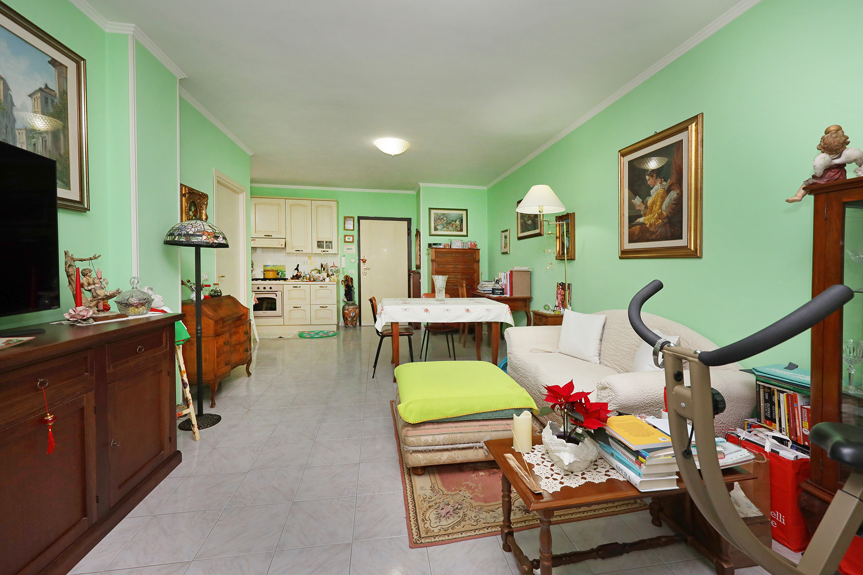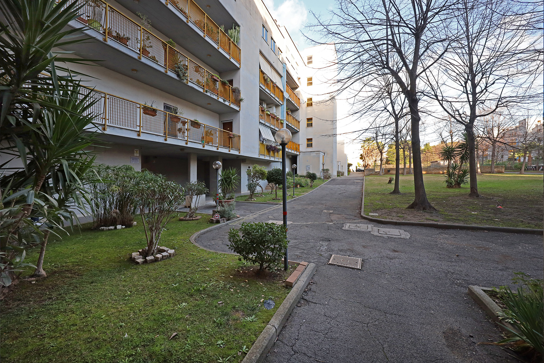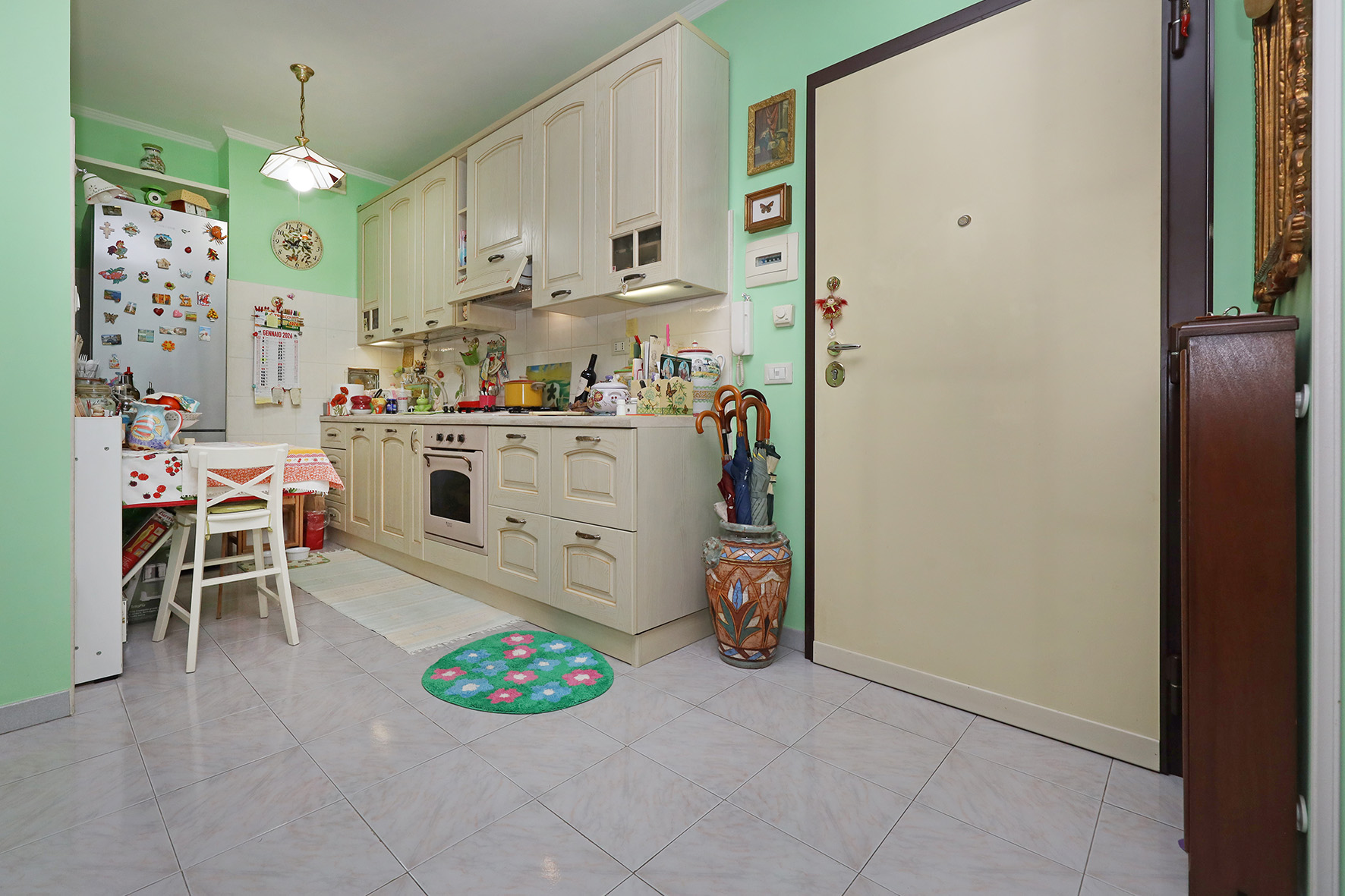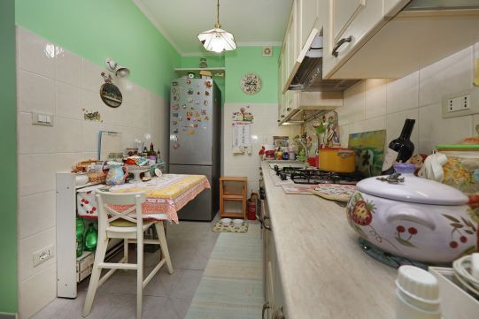 L’appartamento è molto luminoso e si presenta in buono stato; gli impianti della cucina e del bagno sono quelli originali. Portoncino blindato, impianto citofonico tradizionale. Le porte interne, lisce e tamburate, di colore noce scuro, sono tutte a battente. Infissi esterni in legno di pino, con cristallo singolo. Avvolgibili in PVC.