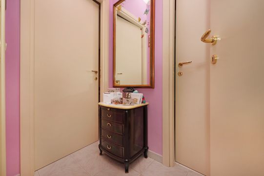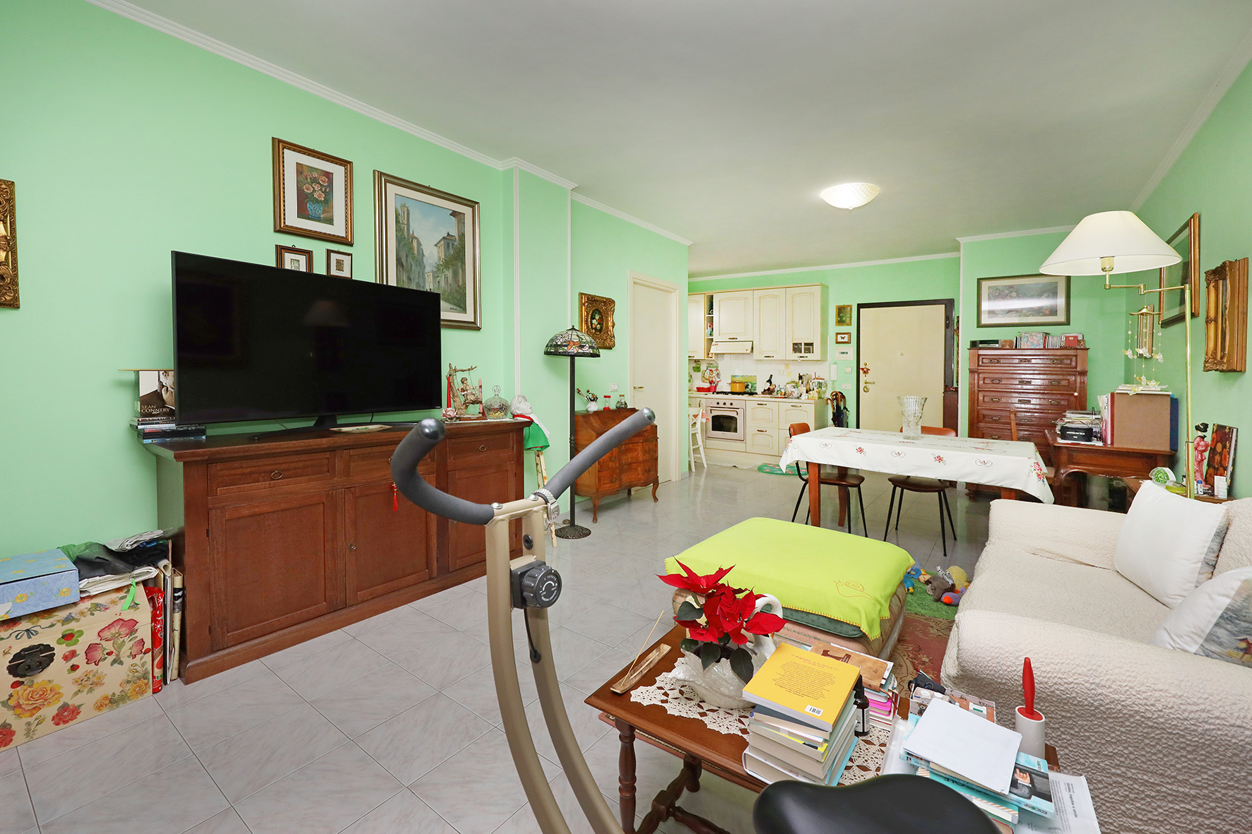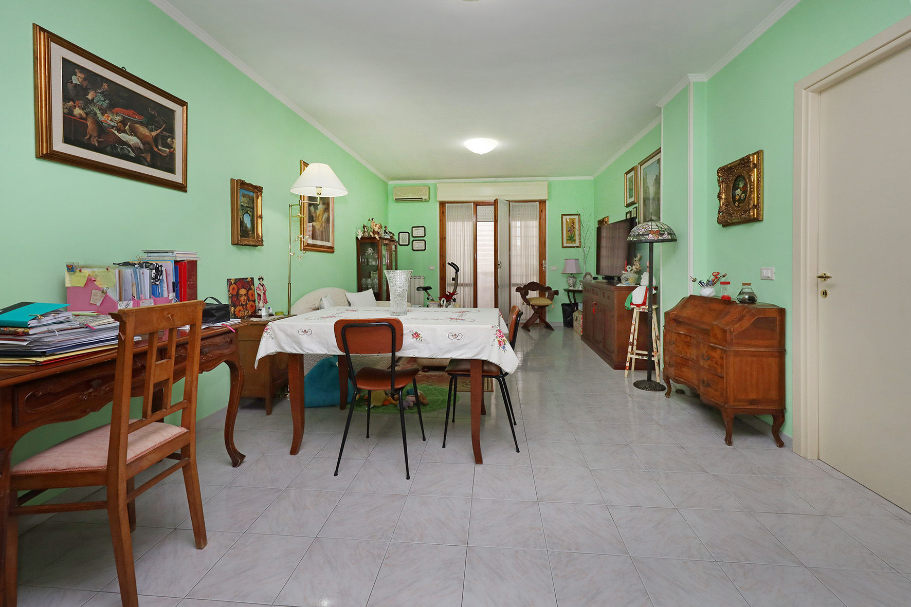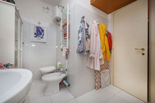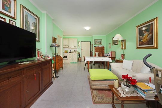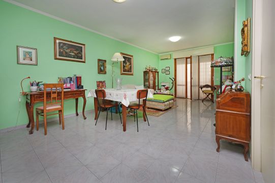 L’appartamento è molto luminoso e si presenta in buono stato; gli impianti della cucina e del bagno sono quelli originali. Portoncino blindato, impianto citofonico tradizionale. Le porte interne, lisce e tamburate, di colore noce scuro, sono tutte a battente. Infissi esterni in legno di pino, con cristallo singolo. Avvolgibili in PVC.