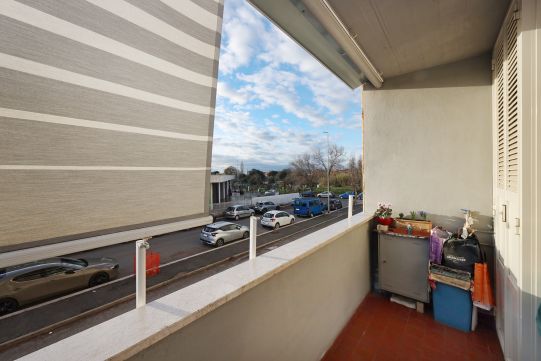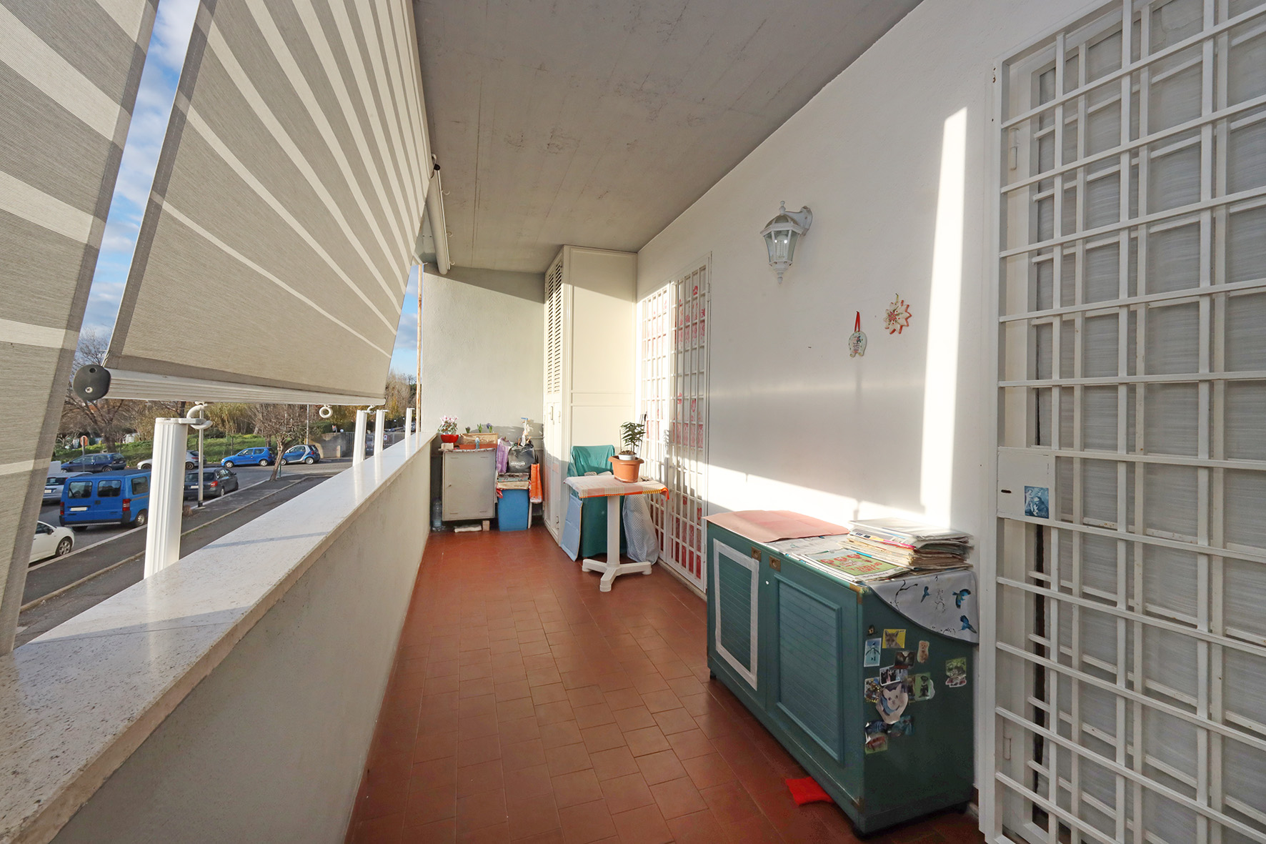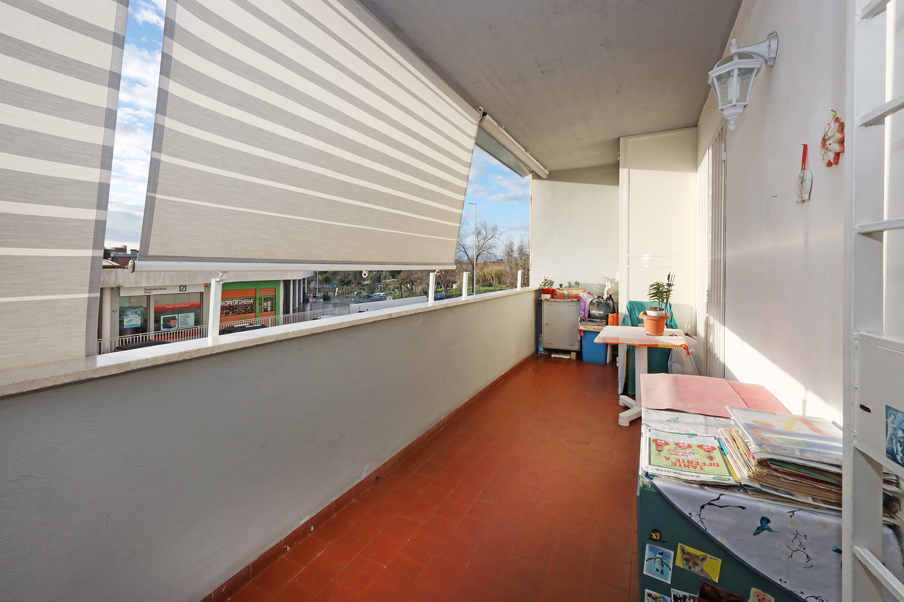 Il balcone, coperto, permette di poter ospitare un arredo esterno, con tavolino e sedie. Grate di protezione apribili alle finestre.