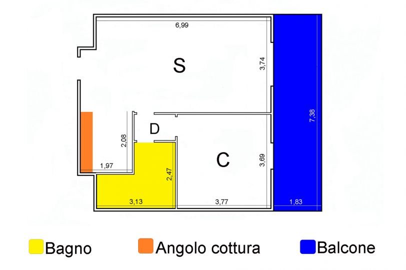 Superficie catastale: 69 mq escluse aree scoperte 65 mq (appartamento e cantina).
