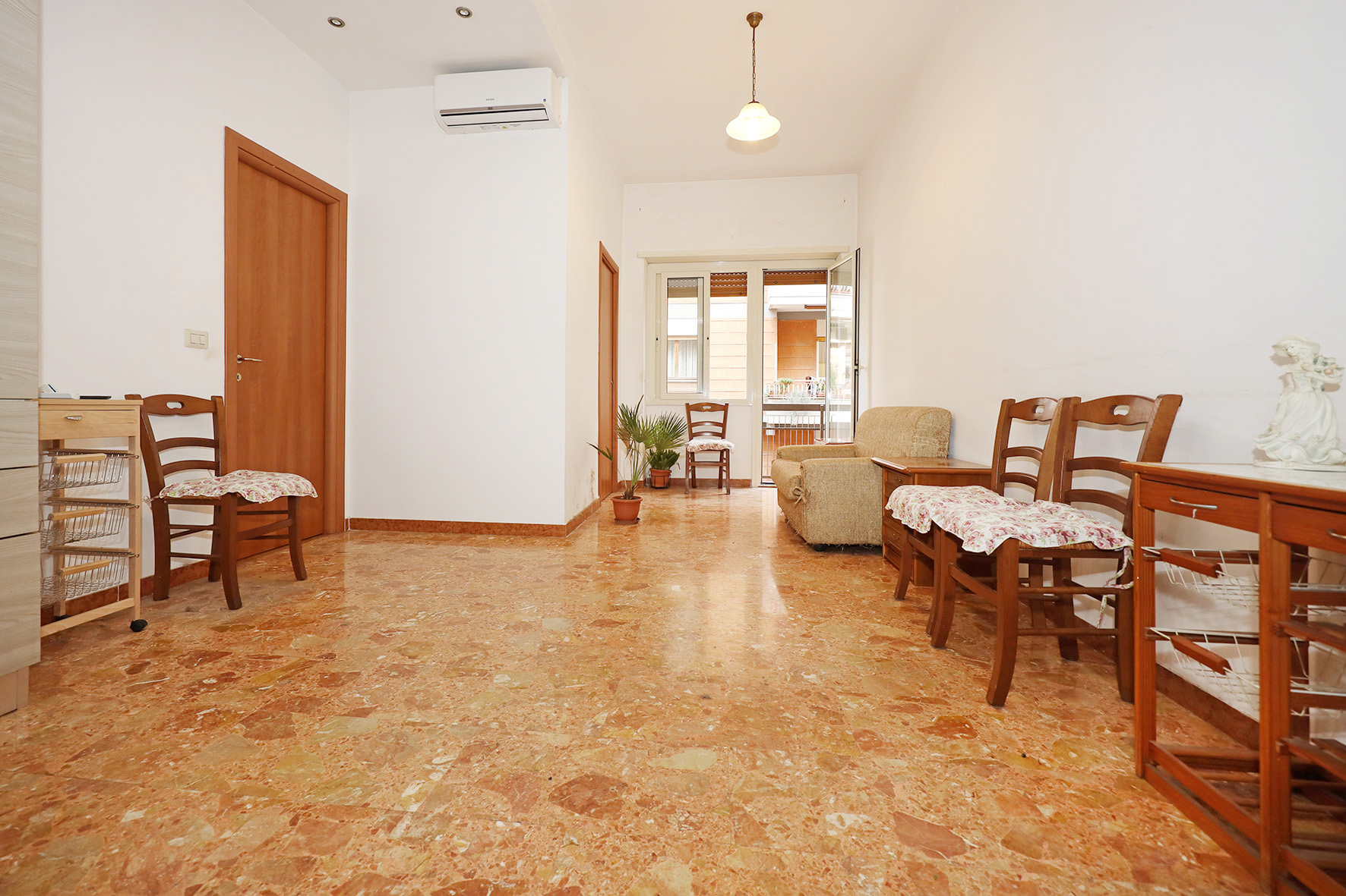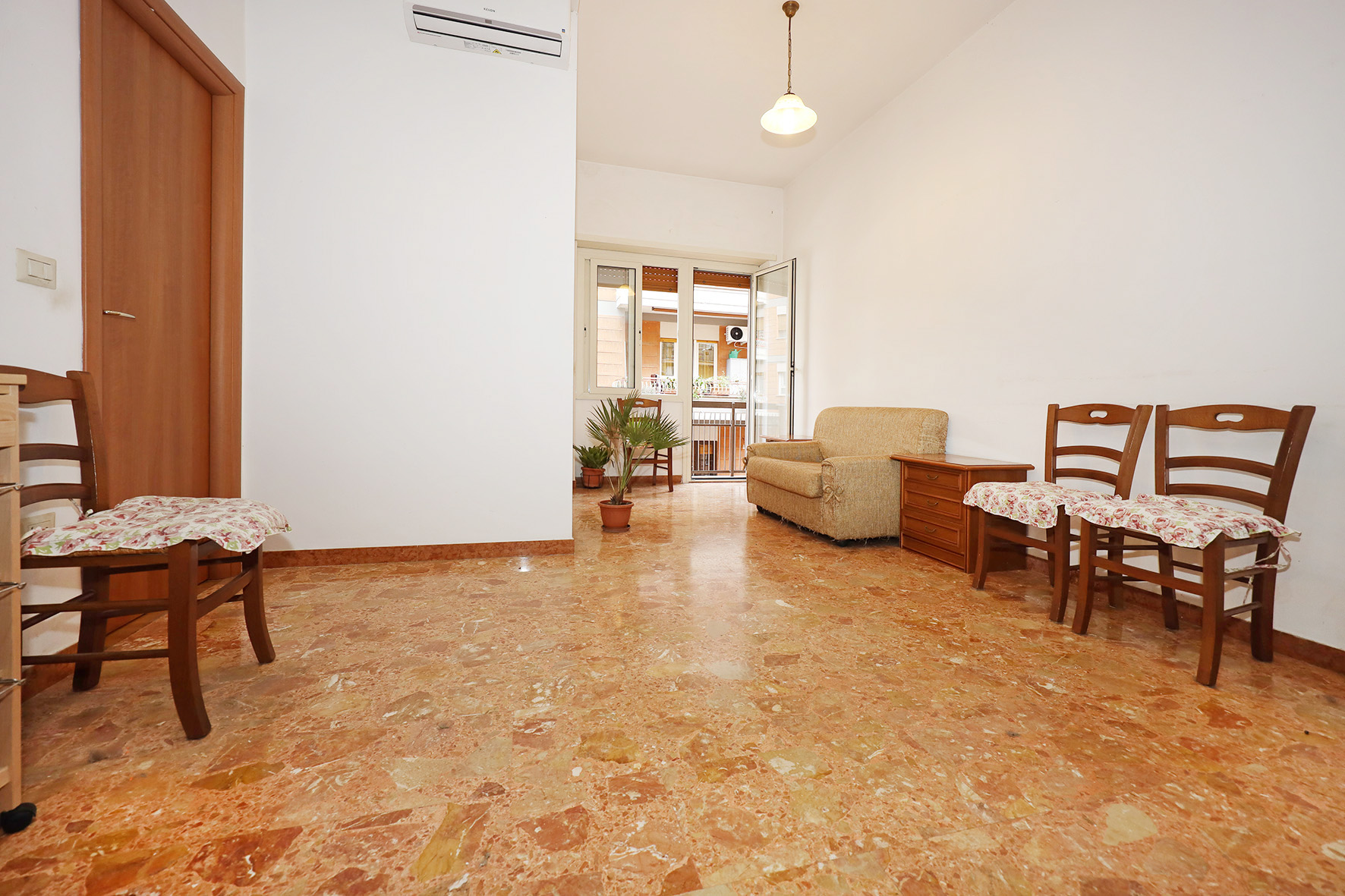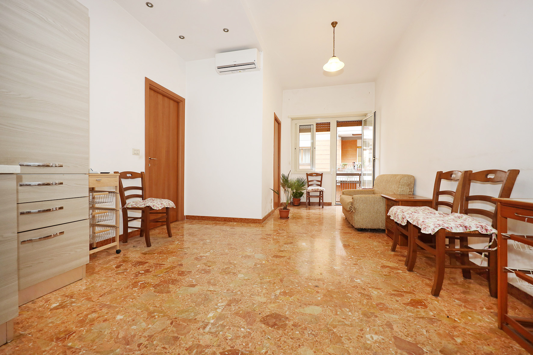 Portoncino blindato. Il bagno, provvisto di finestra è completo di tutti i sanitari,  con piatto doccia e rubinetteria miscelatori monocomando.  Impianto citofono tradizionale. Impianto di climatizzazione caldo/freddo a pompa di calore. Pavimentazione in marmittoni nell’ampio soggiorno, ceramica nel bagno e parquet in camera da letto. Porte interne tamburate lisce, di colore noce scuro. Infissi esterni tutti in PVC di colore bianco, con doppio vetro e avvolgibili motorizzati.