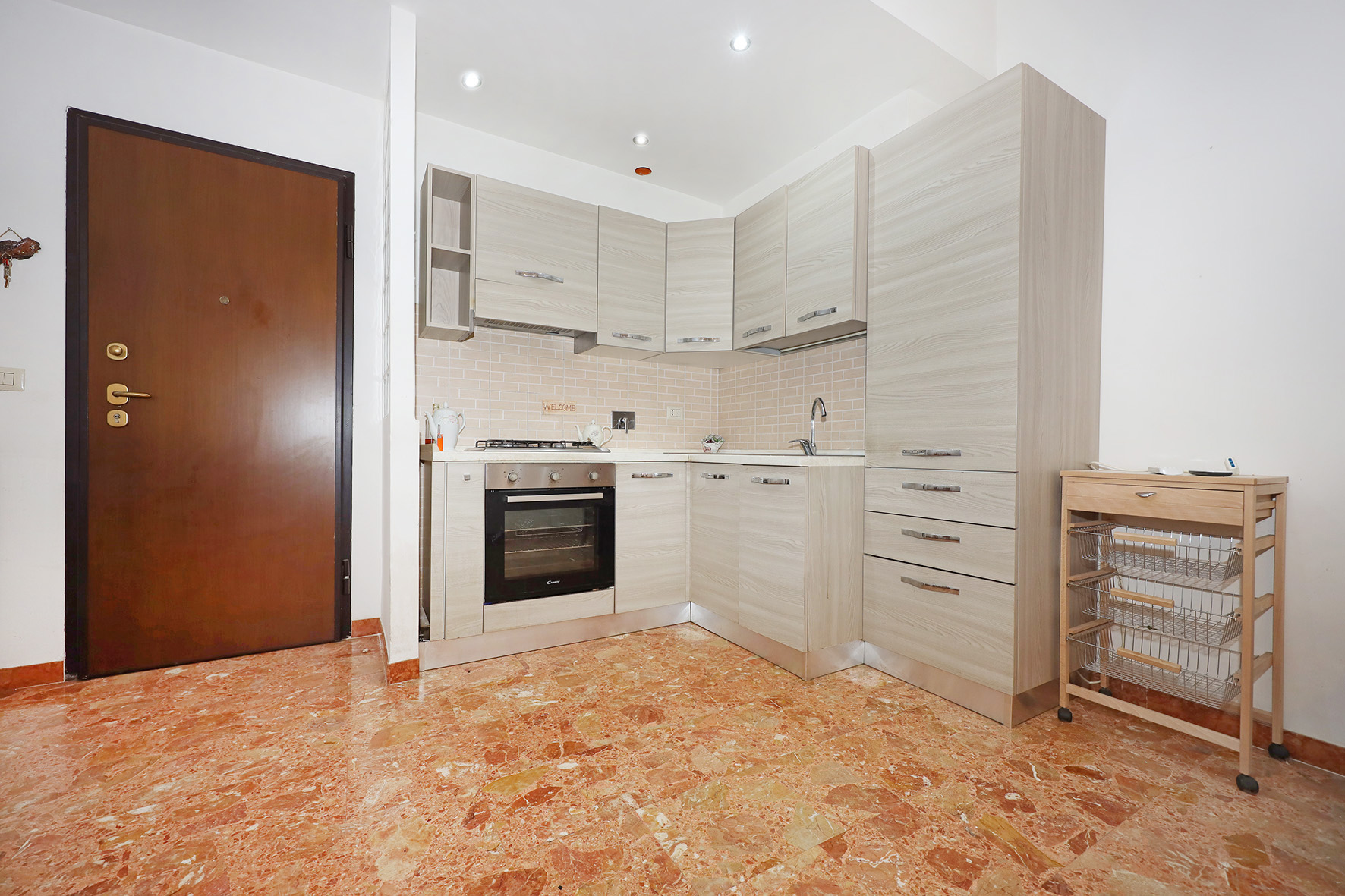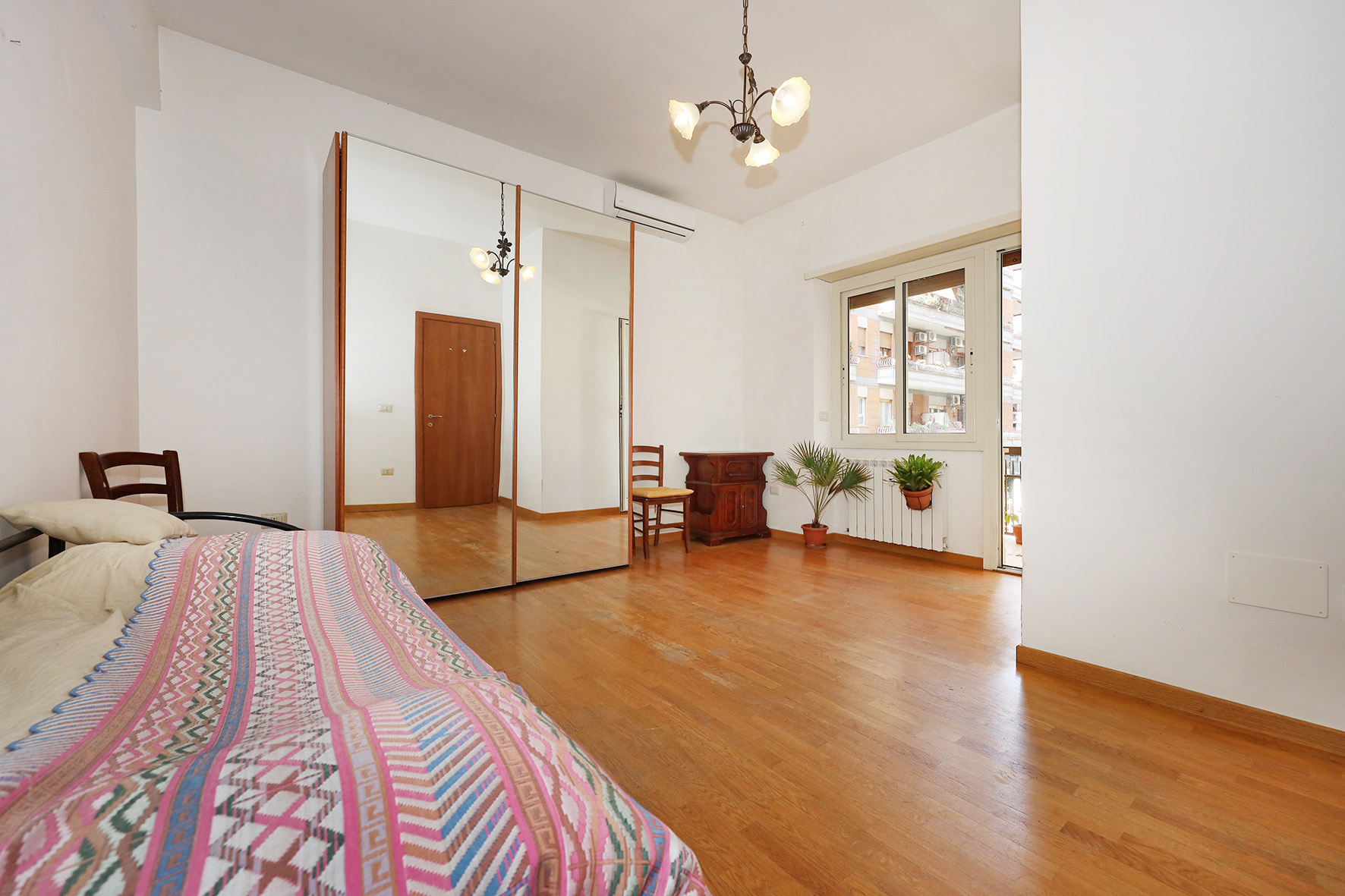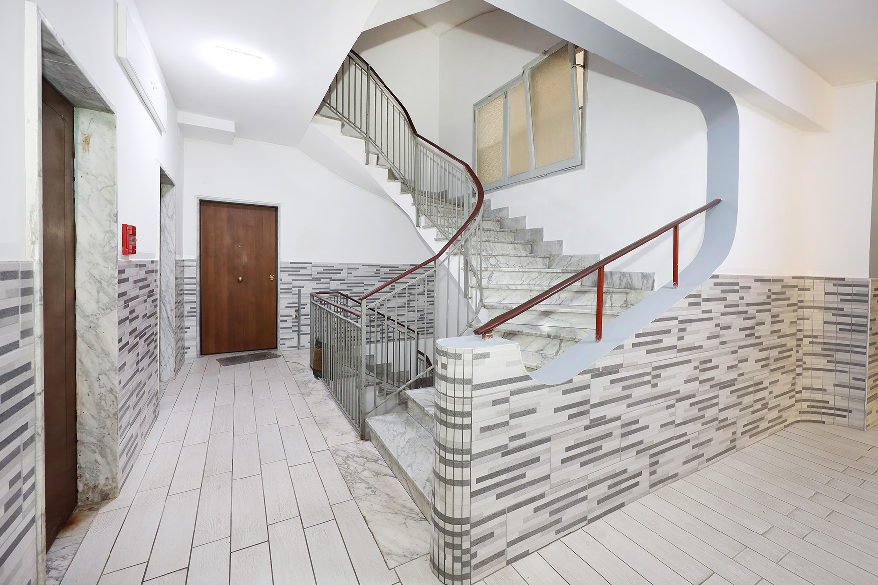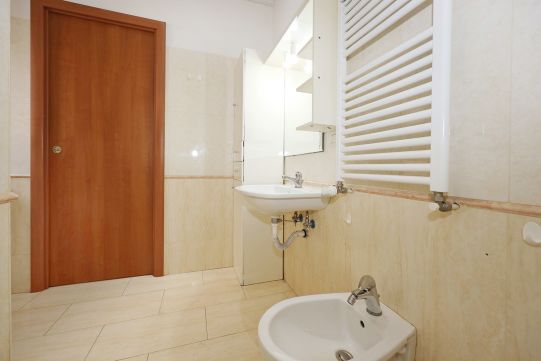 Portoncino blindato. Il bagno, provvisto di finestra è completo di tutti i sanitari,  con piatto doccia e rubinetteria miscelatori monocomando.  Impianto citofono tradizionale. Impianto di climatizzazione caldo/freddo a pompa di calore. Pavimentazione in marmittoni nell’ampio soggiorno, ceramica nel bagno e parquet in camera da letto. Porte interne tamburate lisce, di colore noce scuro. Infissi esterni tutti in PVC di colore bianco, con doppio vetro e avvolgibili motorizzati.