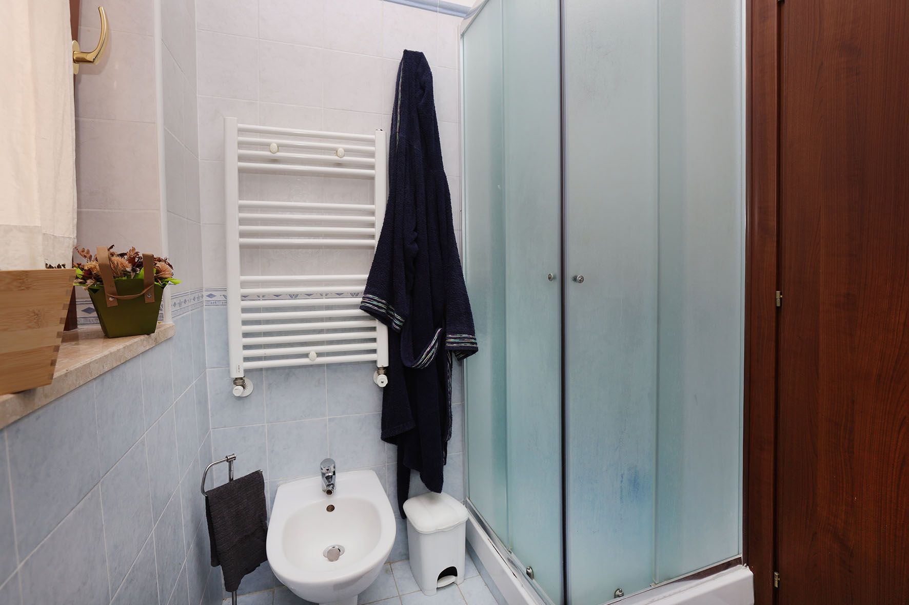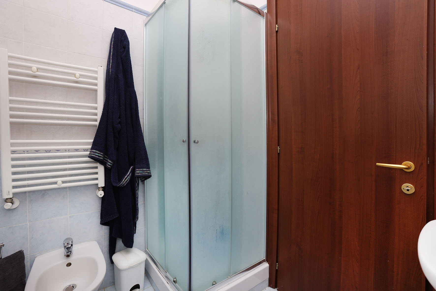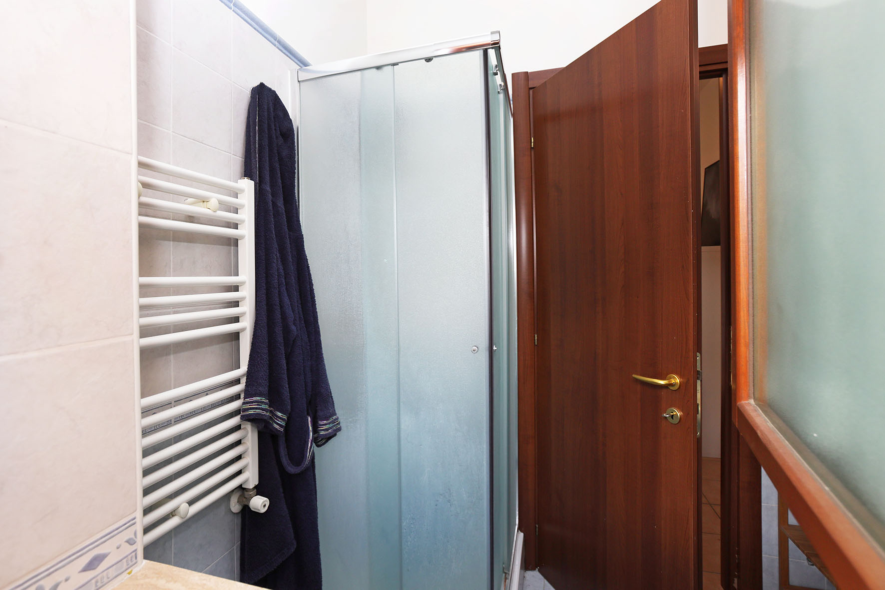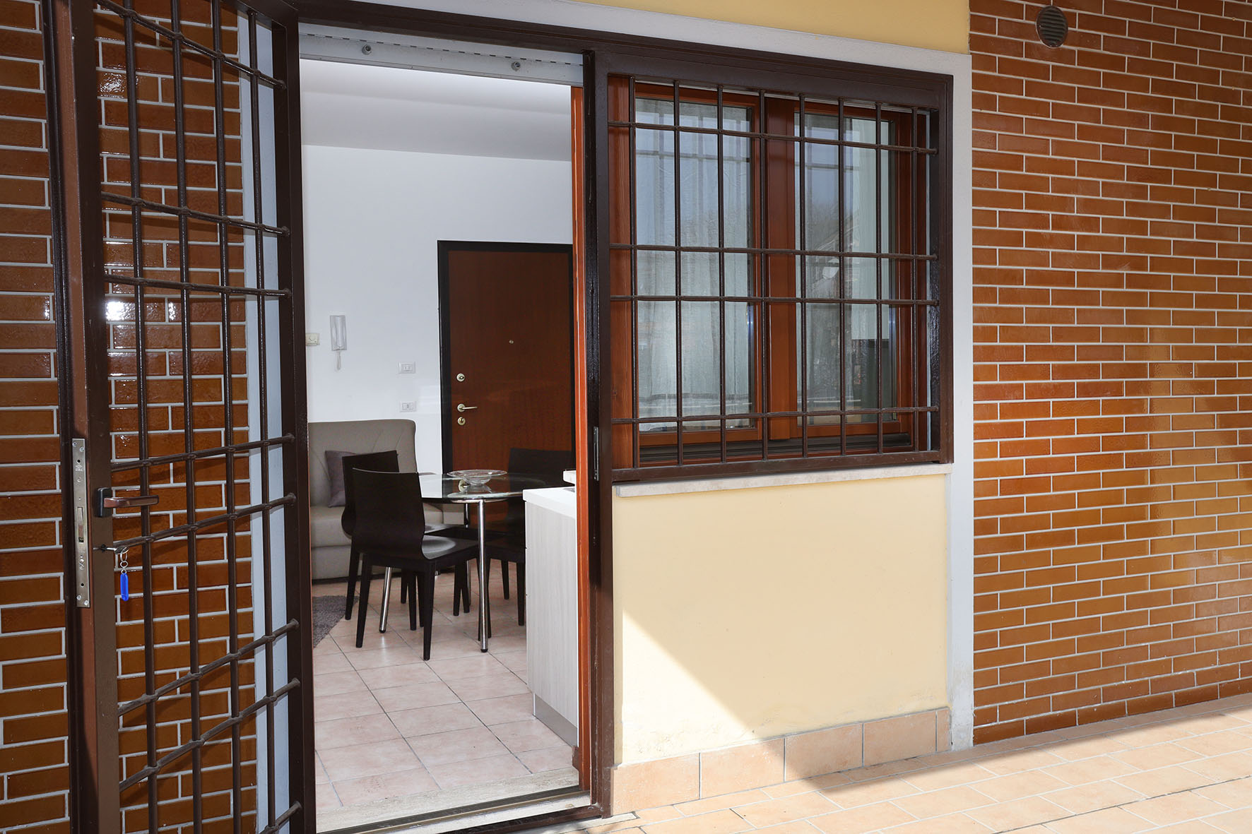 Portoncino blindato, impianto citofonico. Infissi esterni in legno con doppio vetro, porte interne di colore noce scuro a battente, esclusa quella della camera da letto che è scrigno (scorrevole). Per la sicurezza della casa sono presenti alle finestre delle grate in ferro con occhio bottato, detto anche occhio romano. Pavimentazione in gres porcellanato. Sanitari sospesi nel bagno, piatto doccia con cabina; rubinetteria miscelatori monocomando.