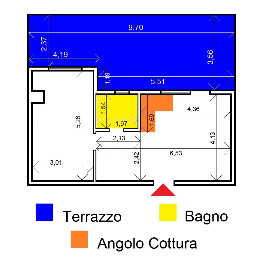La superficie interna calpestabile è di circa 45 mq., oltre 30 mq di terrazzo ed 11 mq di posto auto coperto nell’autorimessa: