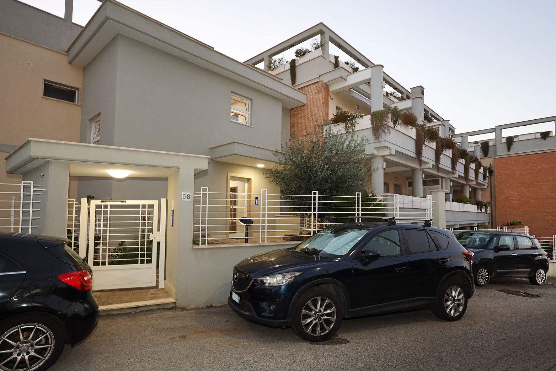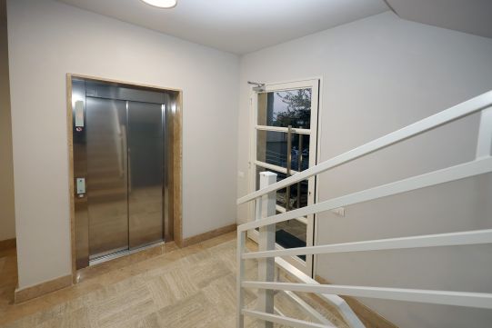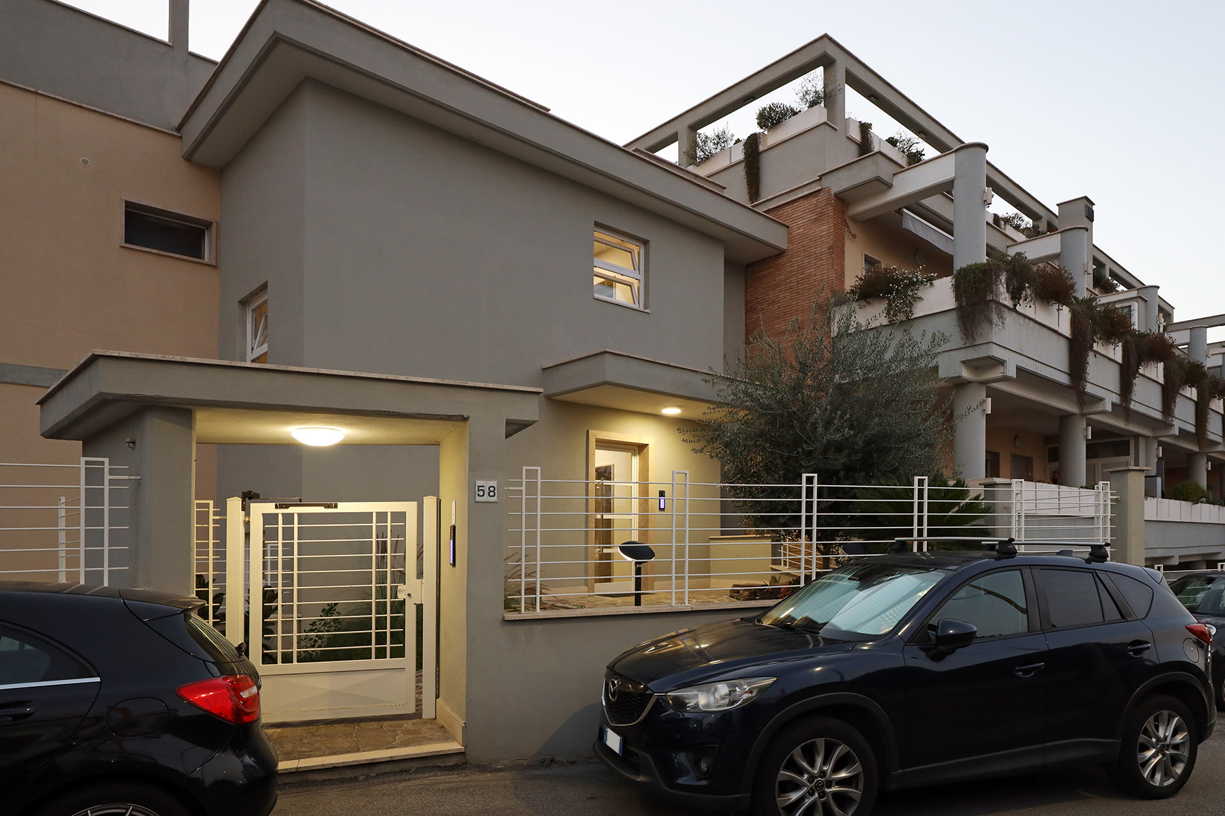 Nelle parti comuni pavimentazione in travertino e ringhiere di ferro, verniciate alle polveri epossidiche, colore bianco opaco.