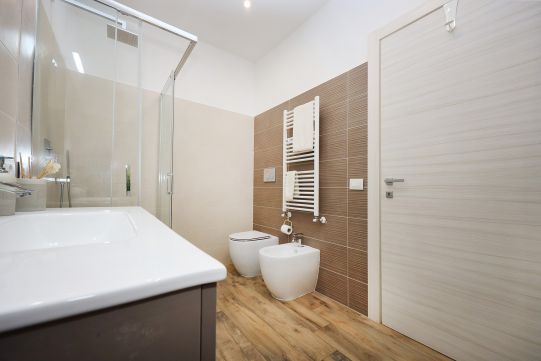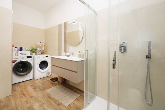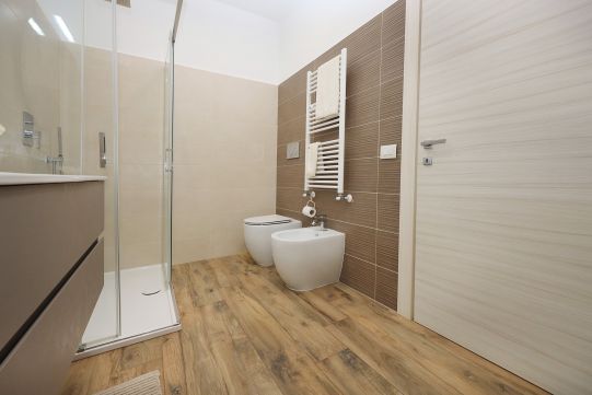 Portoncino d’ingresso in metallo e vetro satinato. La casa è stata completamente ristrutturata tra il 2017 ed il 2019. Infissi esterni PVC di colore bianco, con doppio vetro. Grate di protezione alle finestre e porte finestre, oltre zanzariere. Pavimentazione in gres porcellanato: zoccolino dello stesso materiale. Le porte interne, tutte nuove sono a battente, una con inserto in vetro satinato. Bagni (pavimento e rivestimenti) sanitari e rubinetteria completamente sostituiti tra il 2017 ed il 2019. Le pareti sono tutte rifinite in tinta. Impianto di riscaldamento autonomo. La caldaia che produce anche acqua calda sanitaria, è stata montata recentemente ed è provvista di bollino blu e del controllo dei fumi. Piastre radianti in alluminio.
