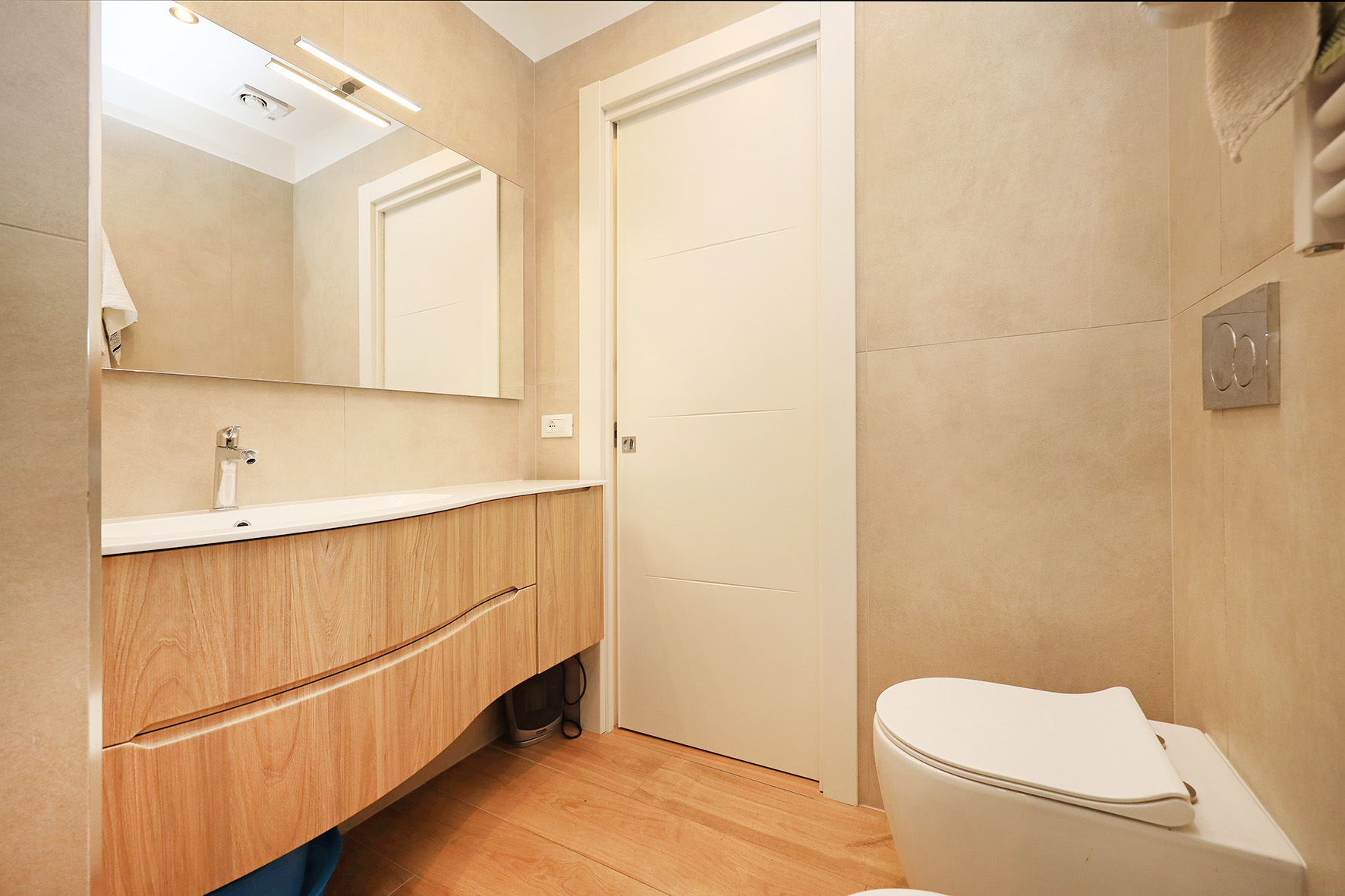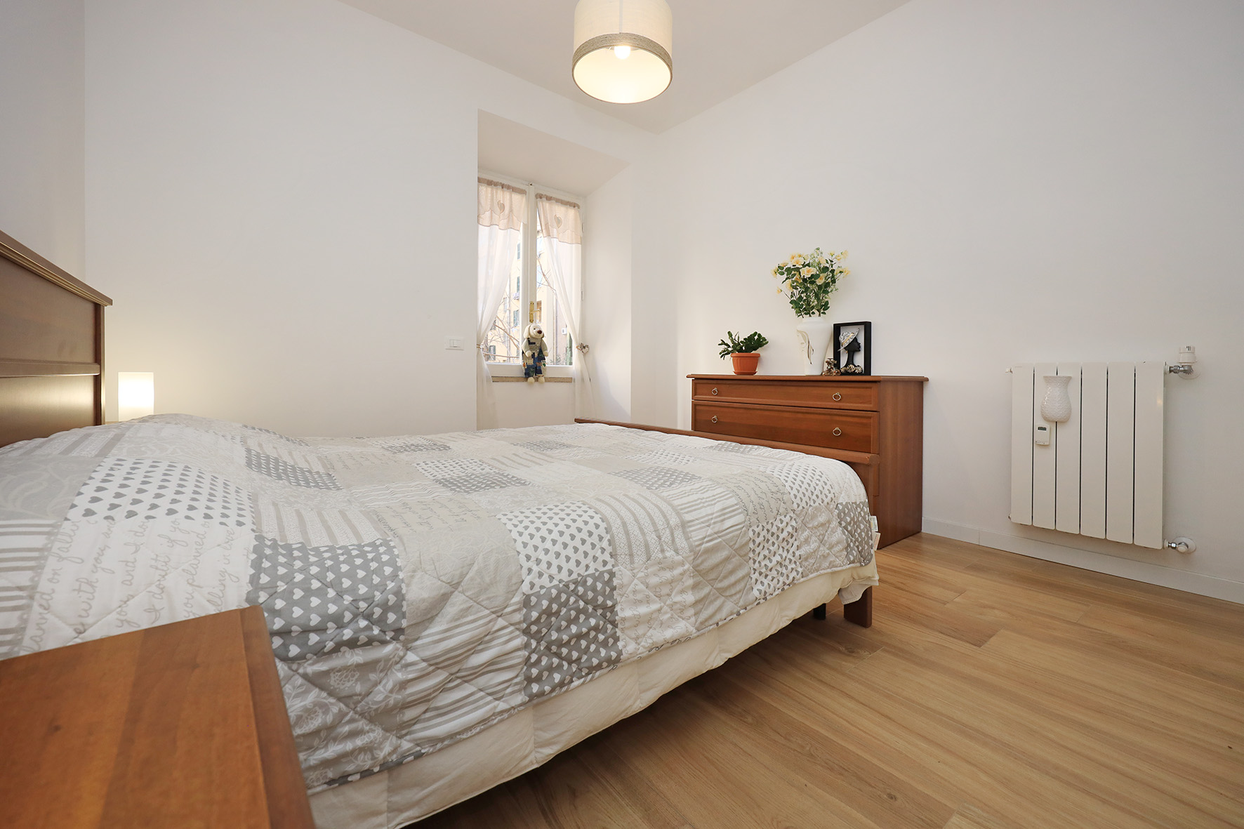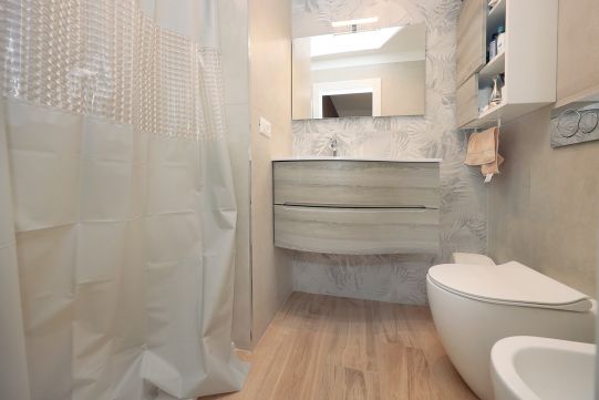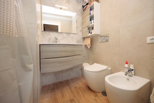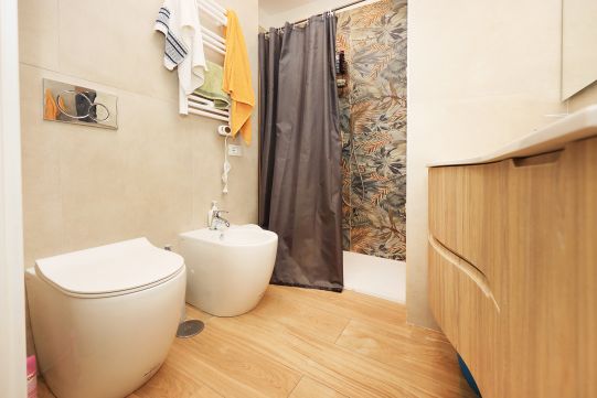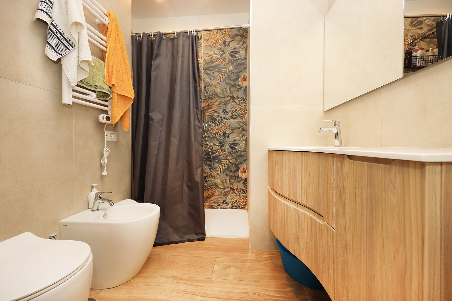 Portoncino d’ingresso. Persiane romane esterne (ad eccezione della cucina e del bagno) in ferro ed infissi parte in legno e parte in alluminio, con doppio vetro. Pavimentazione con gres porcellanato; lo zoccolino è in legno. I bagni sono stati ristrutturati – entrambi sono provvisti di tutti i sanitari ed hanno la doccia; rubinetteria miscelatori monocomando. L’acqua calda viene prodotta da una caldaia autonoma a gas posta sul balcone adiacente la cucina. La caldaia di riscaldamento è provvista di libretto di uso e manutenzione con bollino blu e controllo dei fumi. L’impianto elettrico è stato ristrutturato ed è provvisto di dichiarazione di conformità. La muratura di casa è rifinita con tinta.