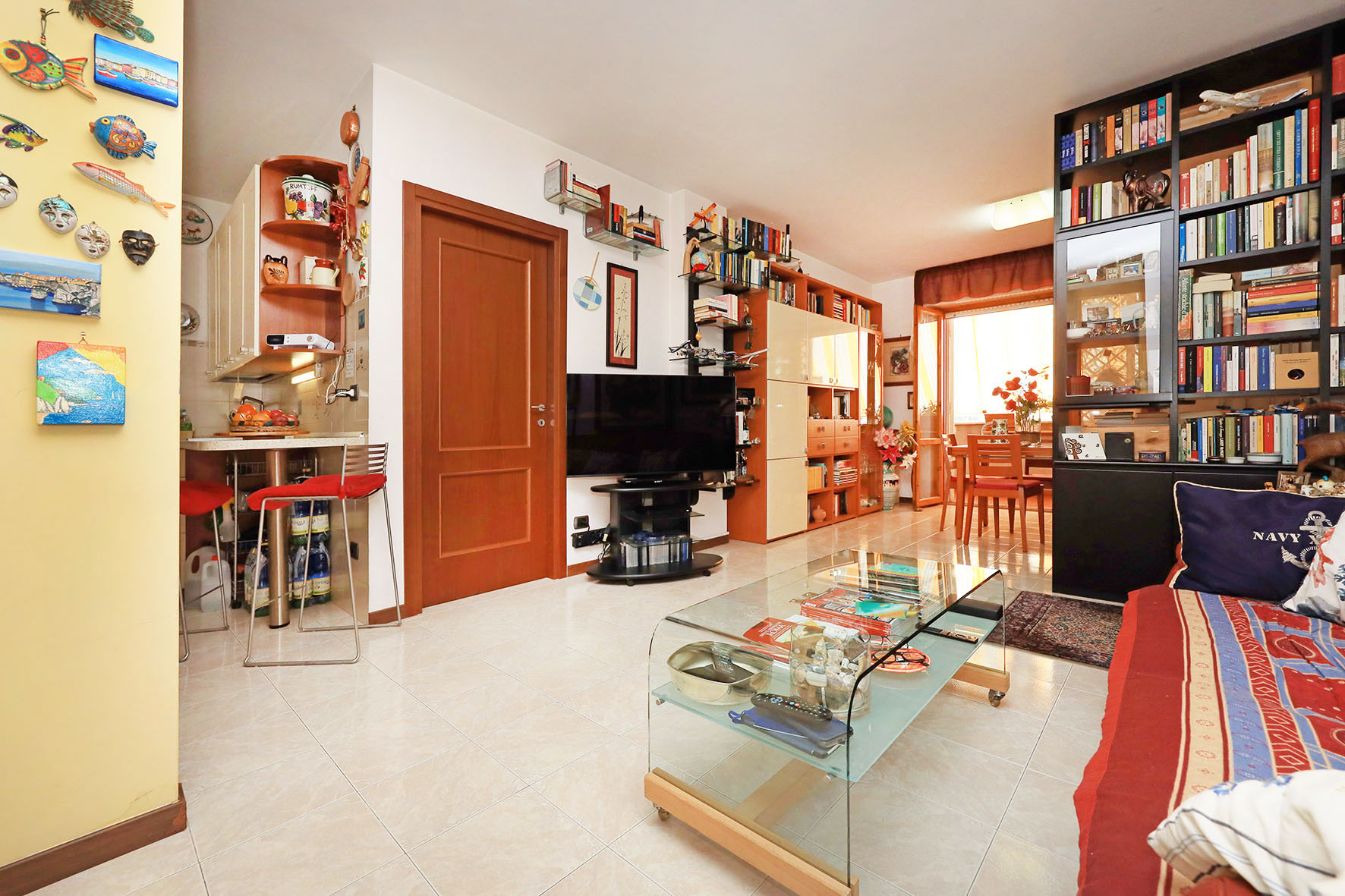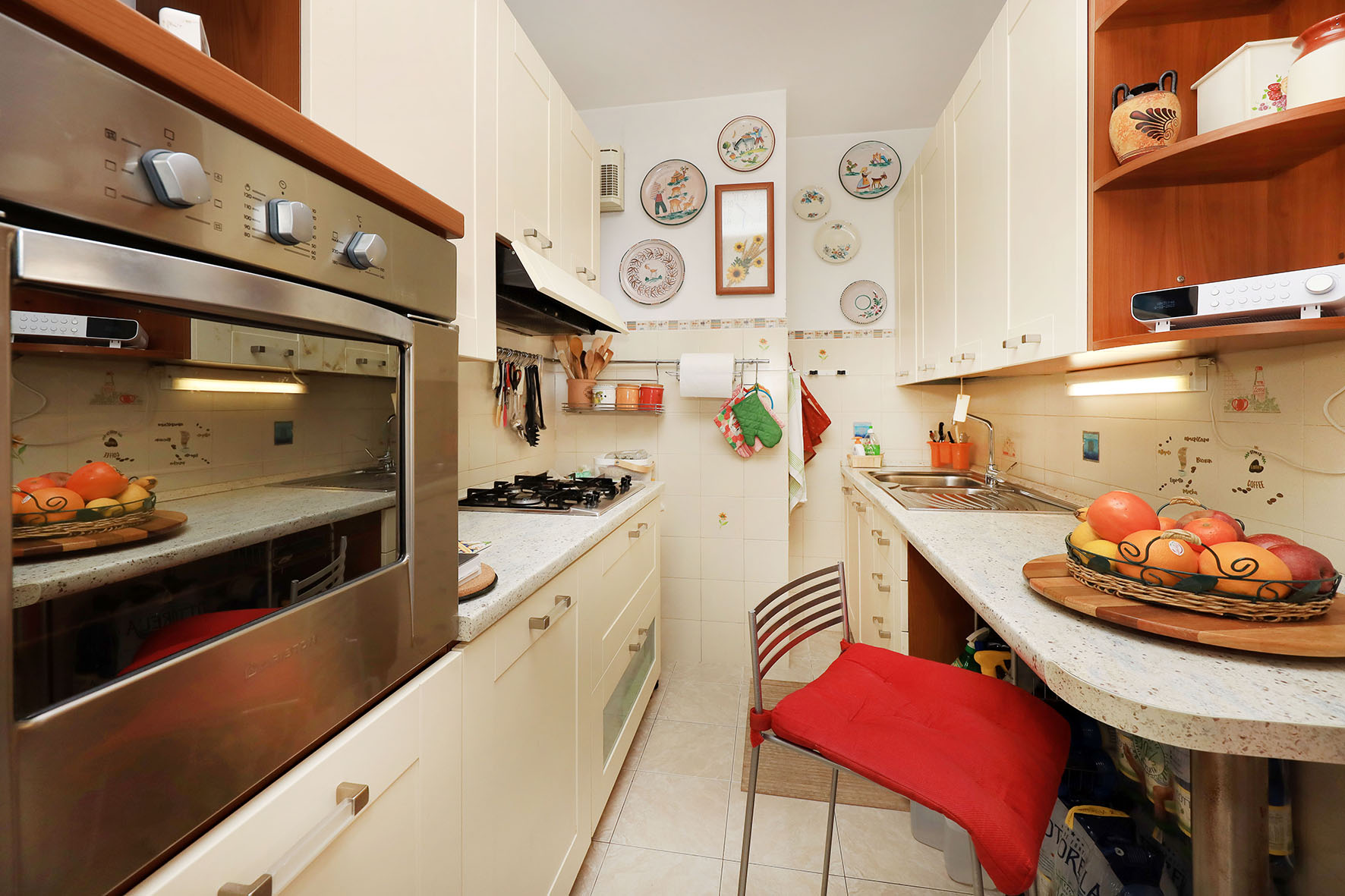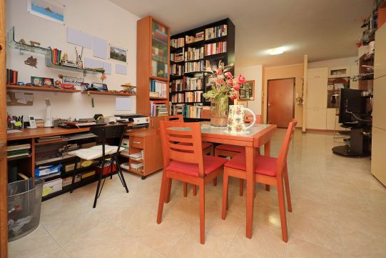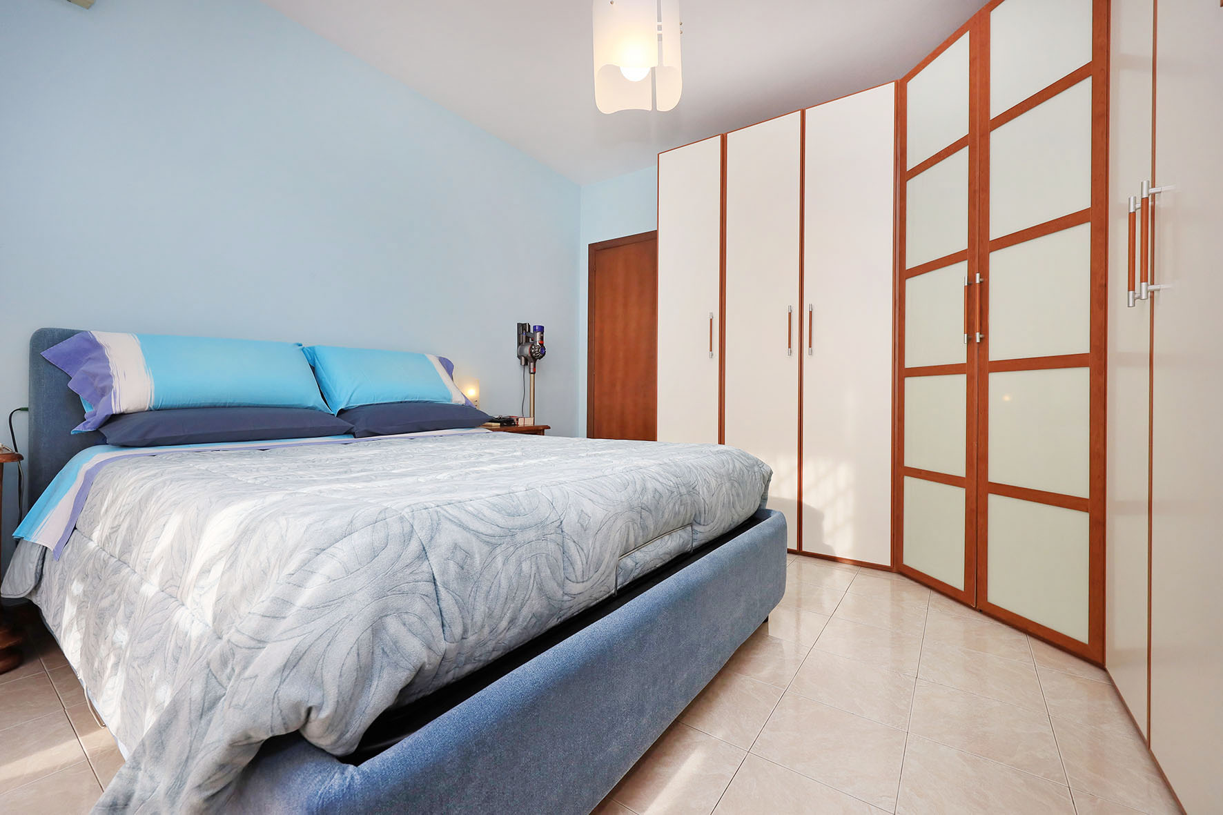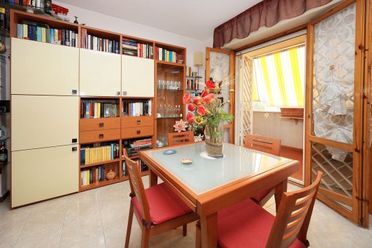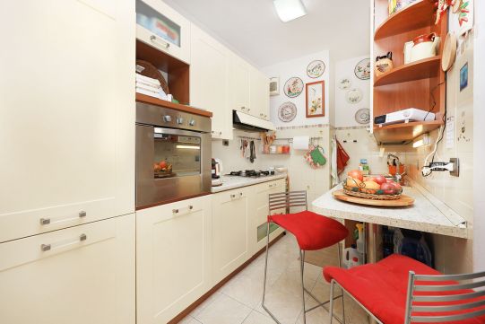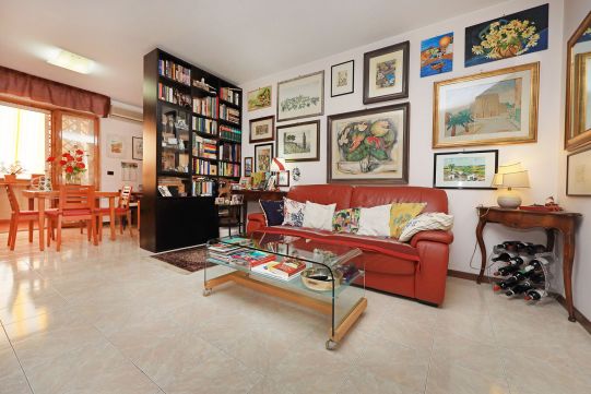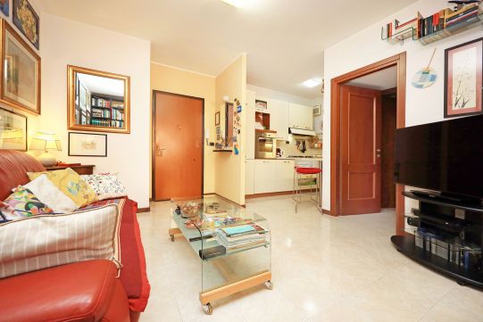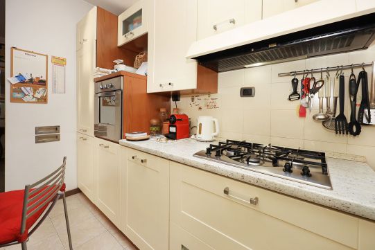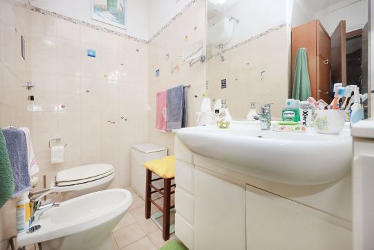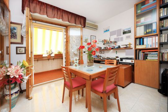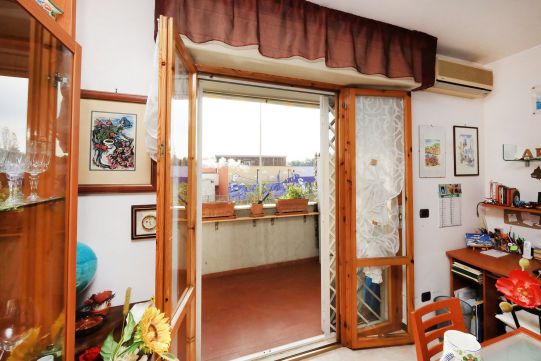 L’appartamento è molto luminoso e si presenta in buono stato; gli impianti della cucina e del bagno sono quelli originali. Portoncino blindato, impianto citofonico tradizionale. Le porte interne, lisce e tamburate, di colore noce scuro, sono tutte a battente. Infissi esterni in legno di pino, con cristallo singolo. Avvolgibili in pvc, motorizzati.