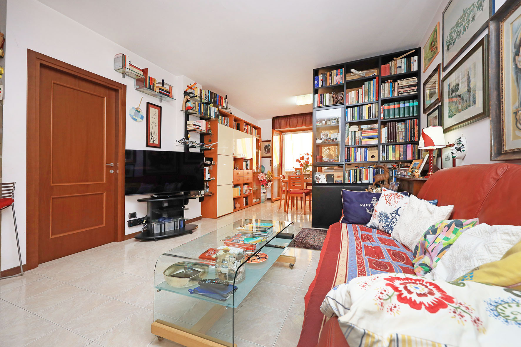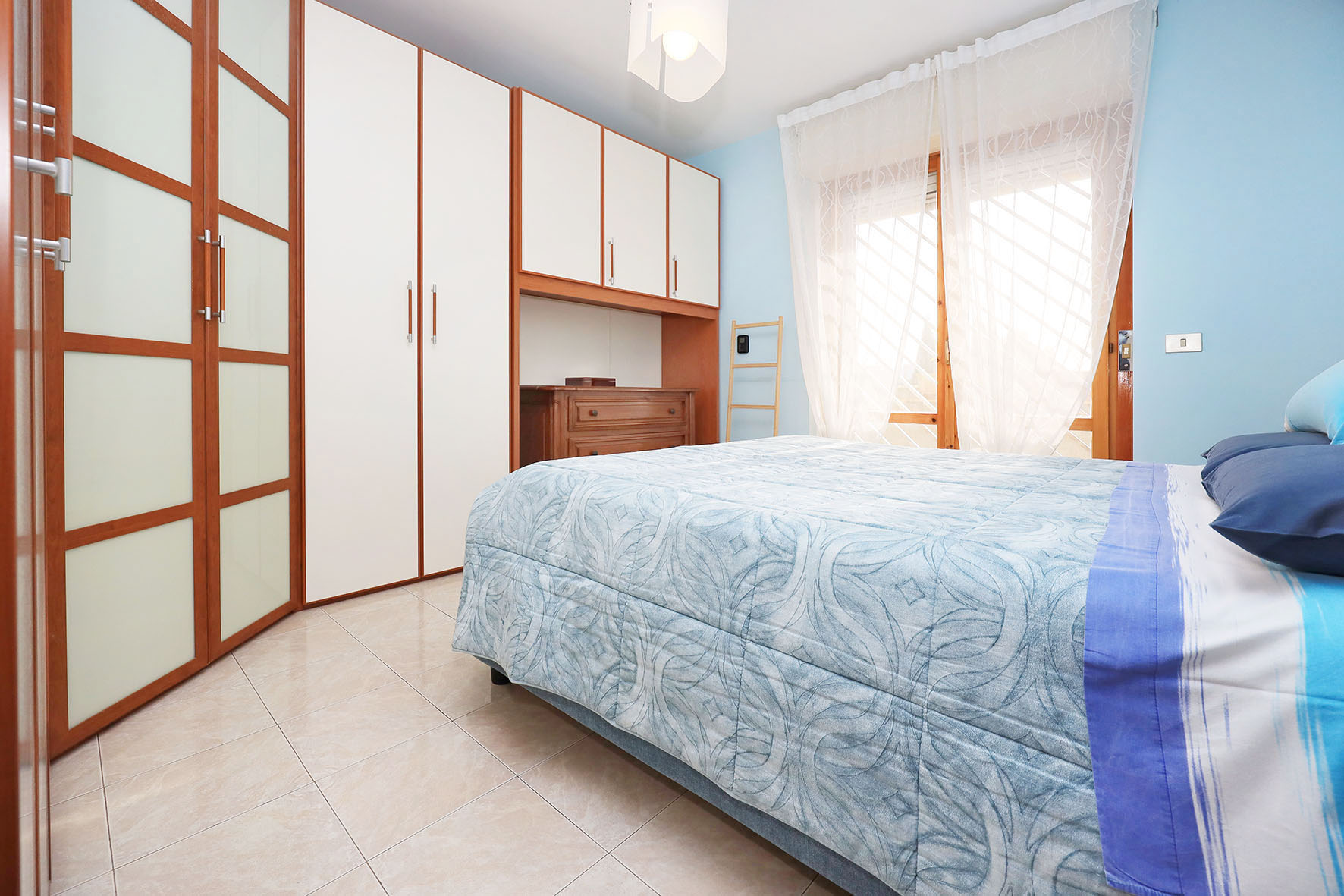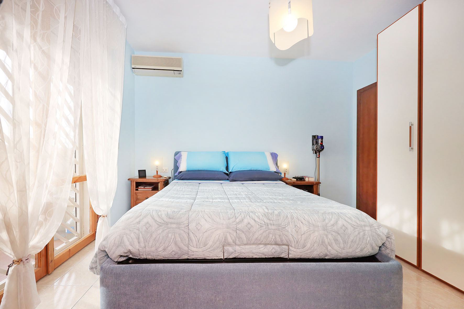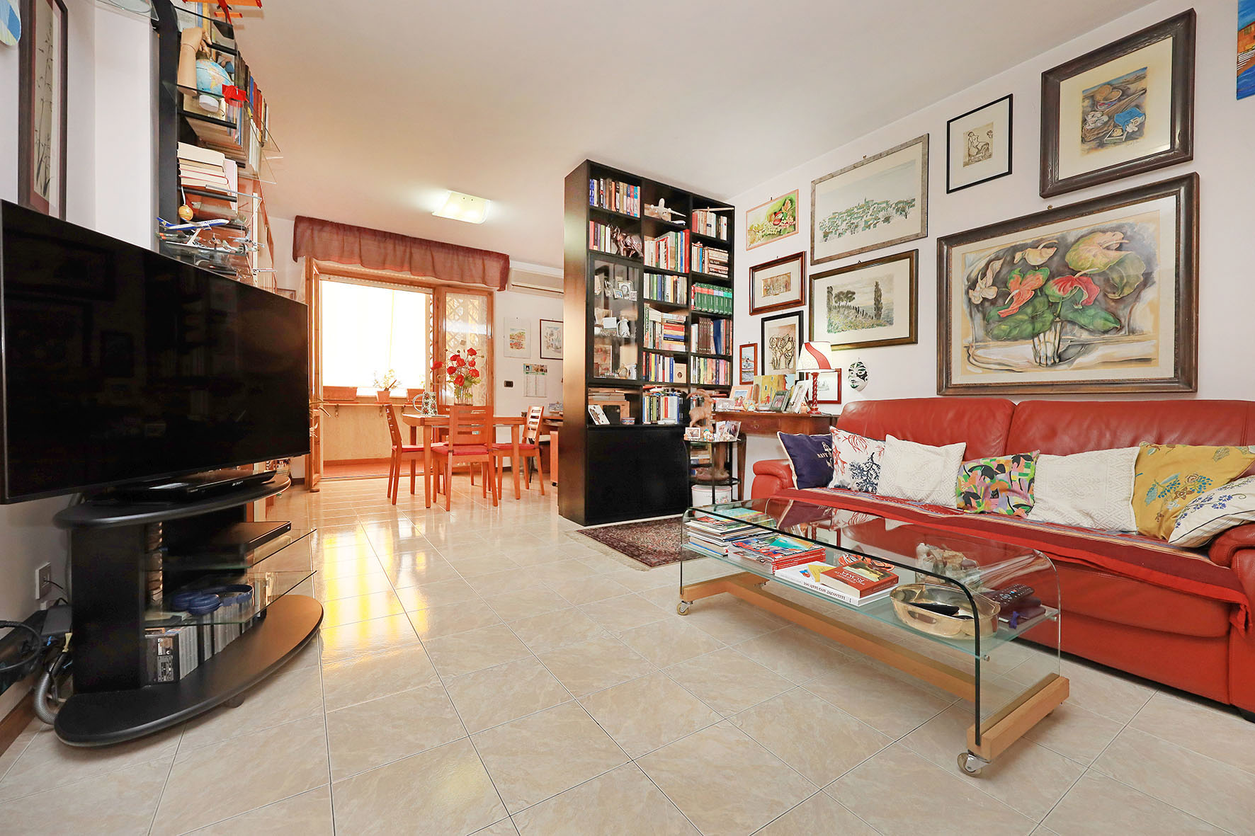 L’appartamento è molto luminoso e si presenta in buono stato; gli impianti della cucina e del bagno sono quelli originali. Portoncino blindato, impianto citofonico tradizionale. Le porte interne, lisce e tamburate, di colore noce scuro, sono tutte a battente. Infissi esterni in legno di pino, con cristallo singolo. Avvolgibili in pvc, motorizzati.