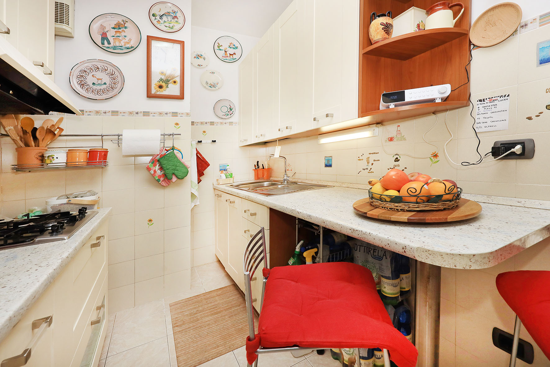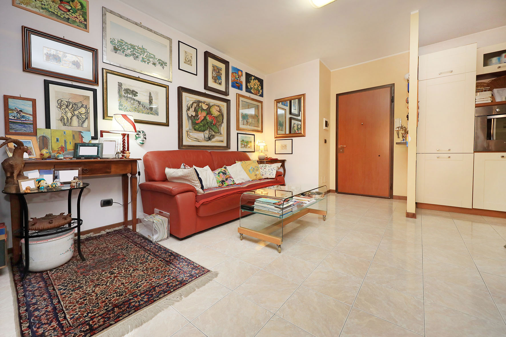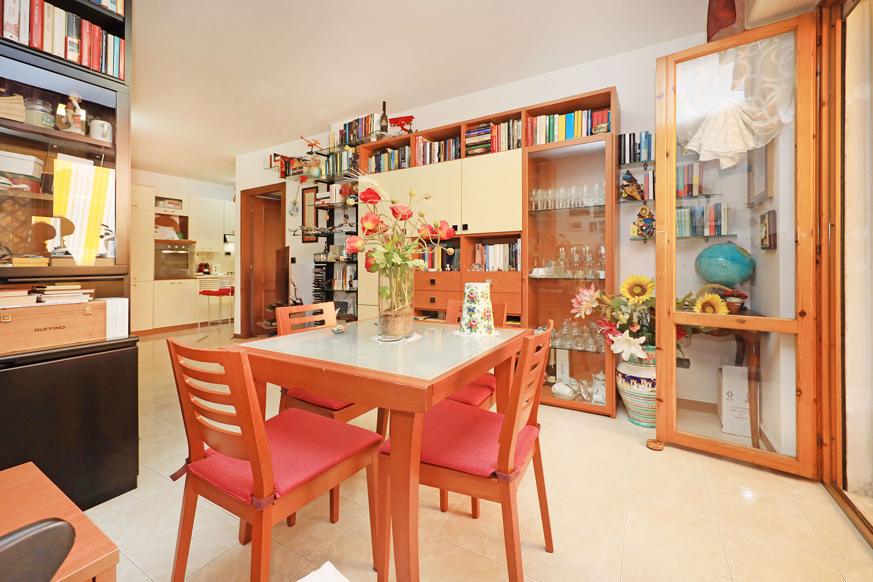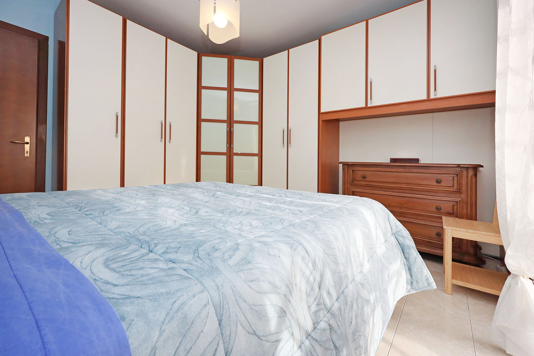 L’appartamento è molto luminoso e si presenta in buono stato; gli impianti della cucina e del bagno sono quelli originali. Portoncino blindato, impianto citofonico tradizionale. Le porte interne, lisce e tamburate, di colore noce scuro, sono tutte a battente. Infissi esterni in legno di pino, con cristallo singolo. Avvolgibili in pvc, motorizzati.