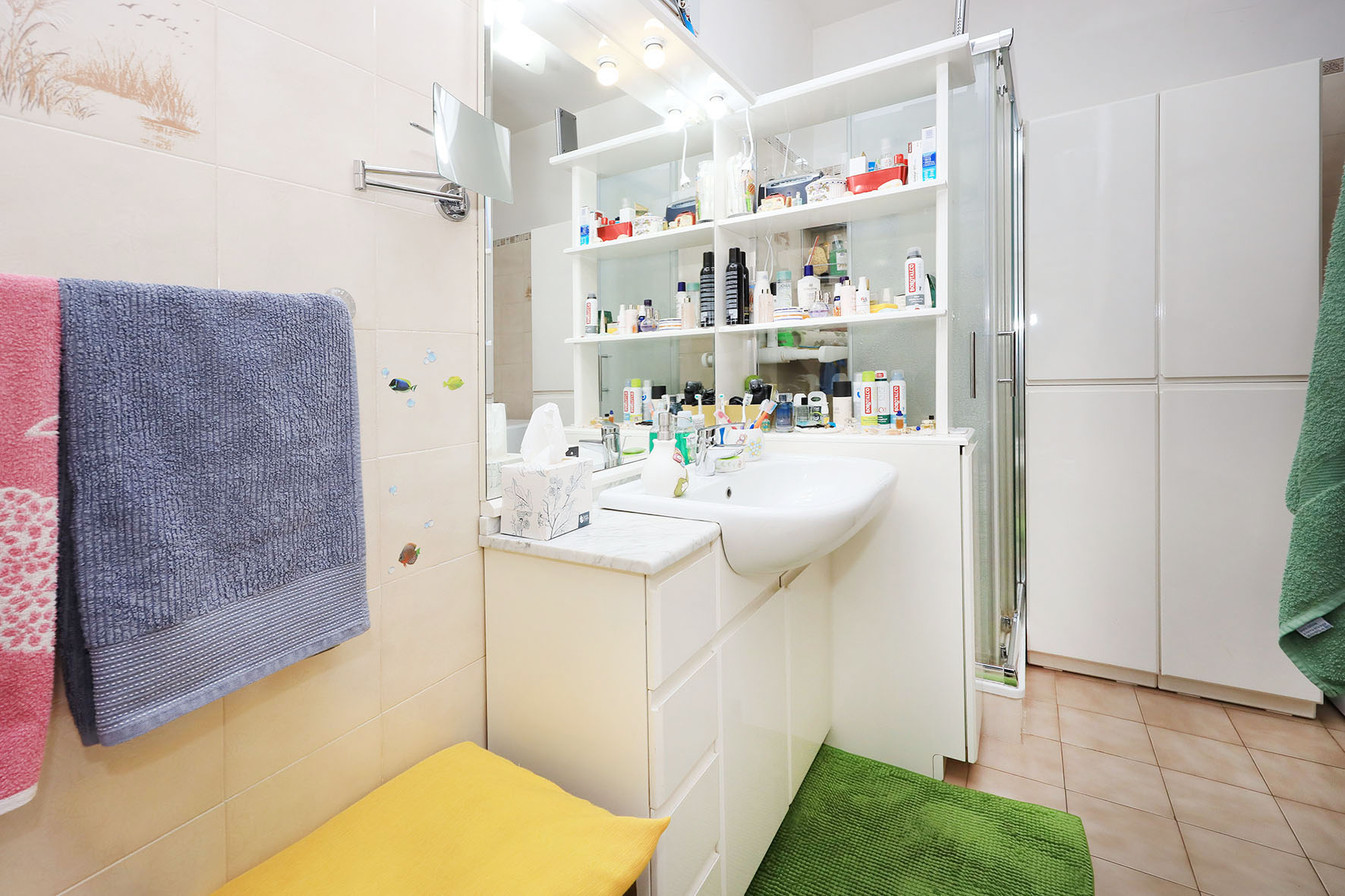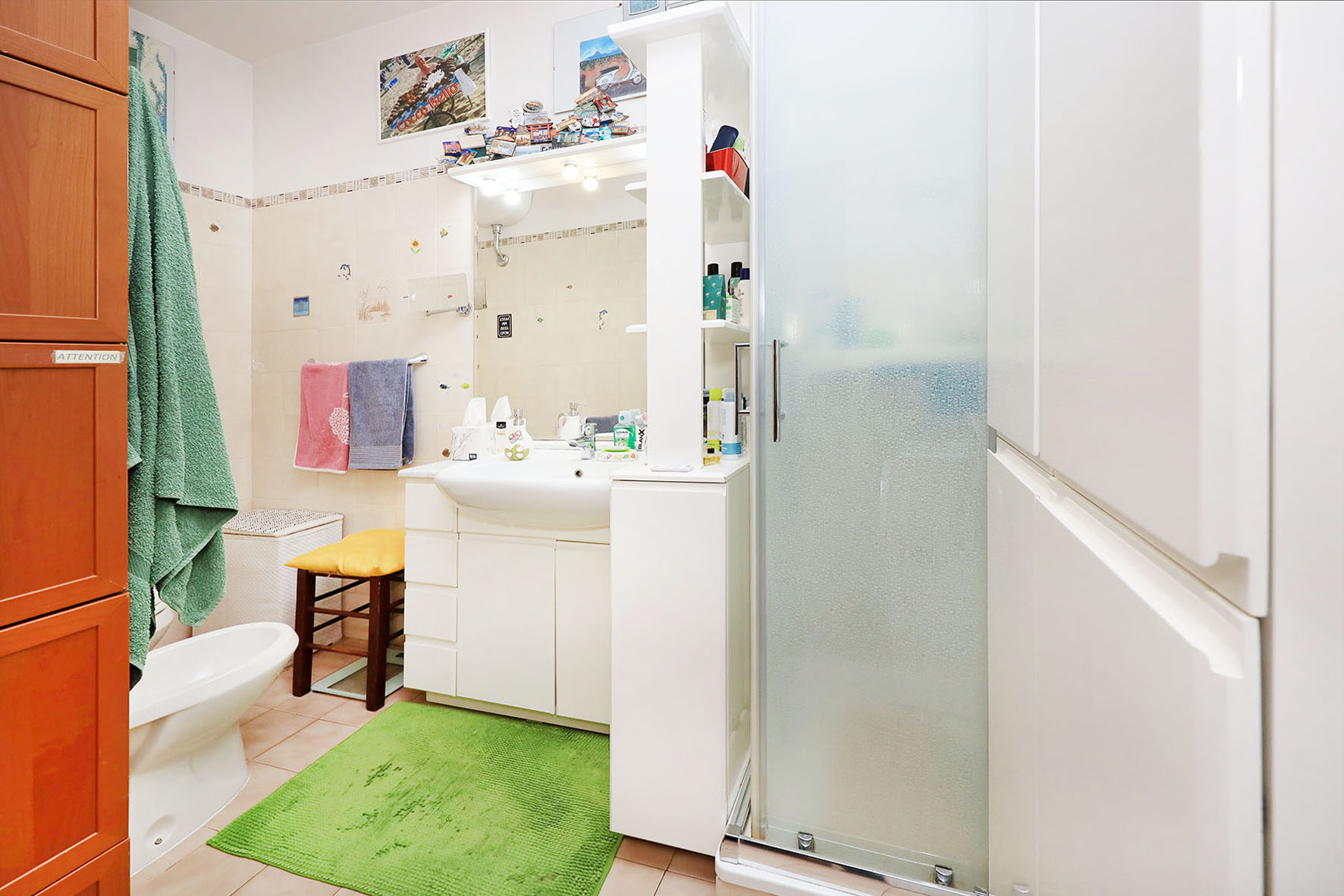 Il bagno completo di tutti i sanitari è provvisto di doccia. Rubinetteria miscelatori monocomando.