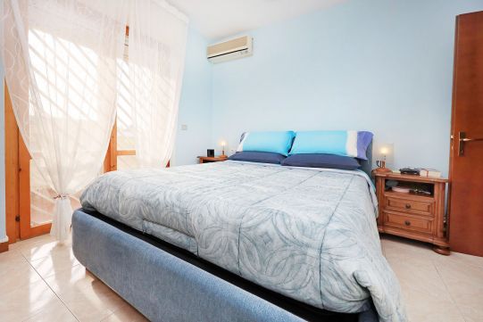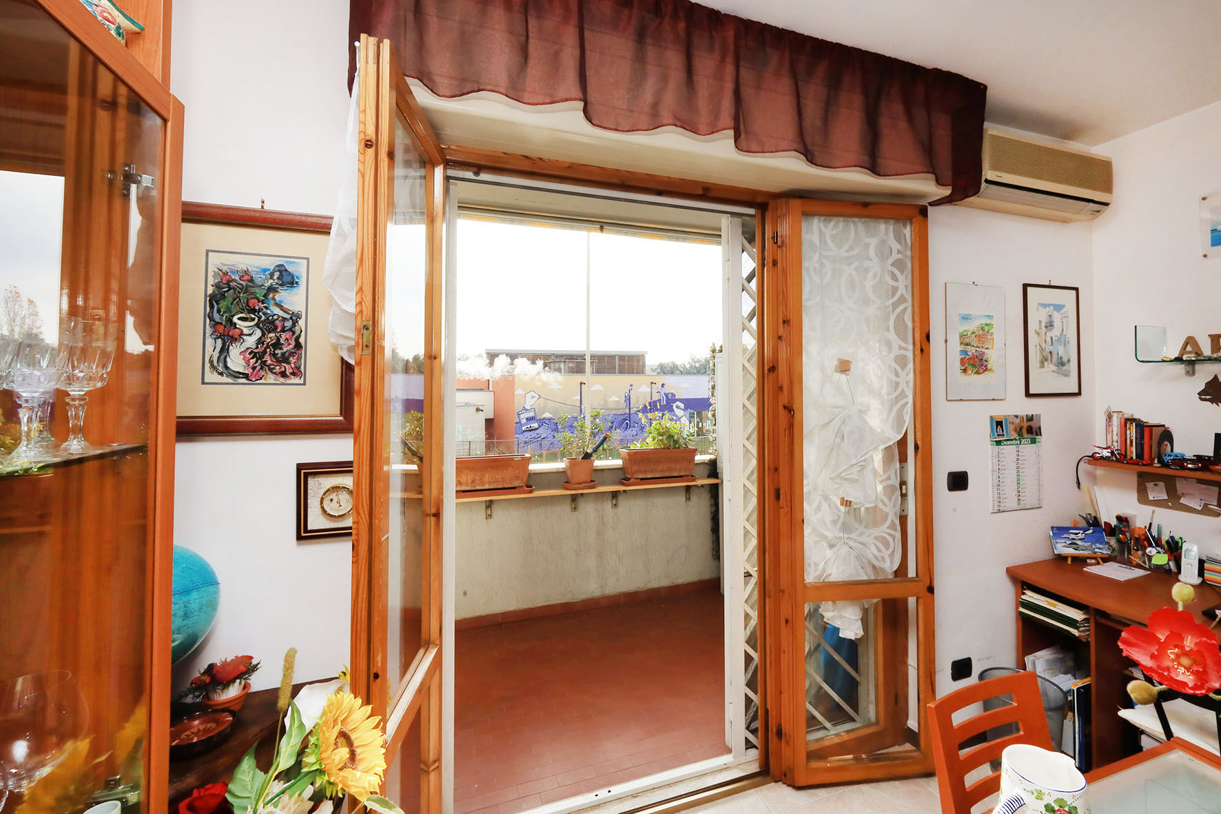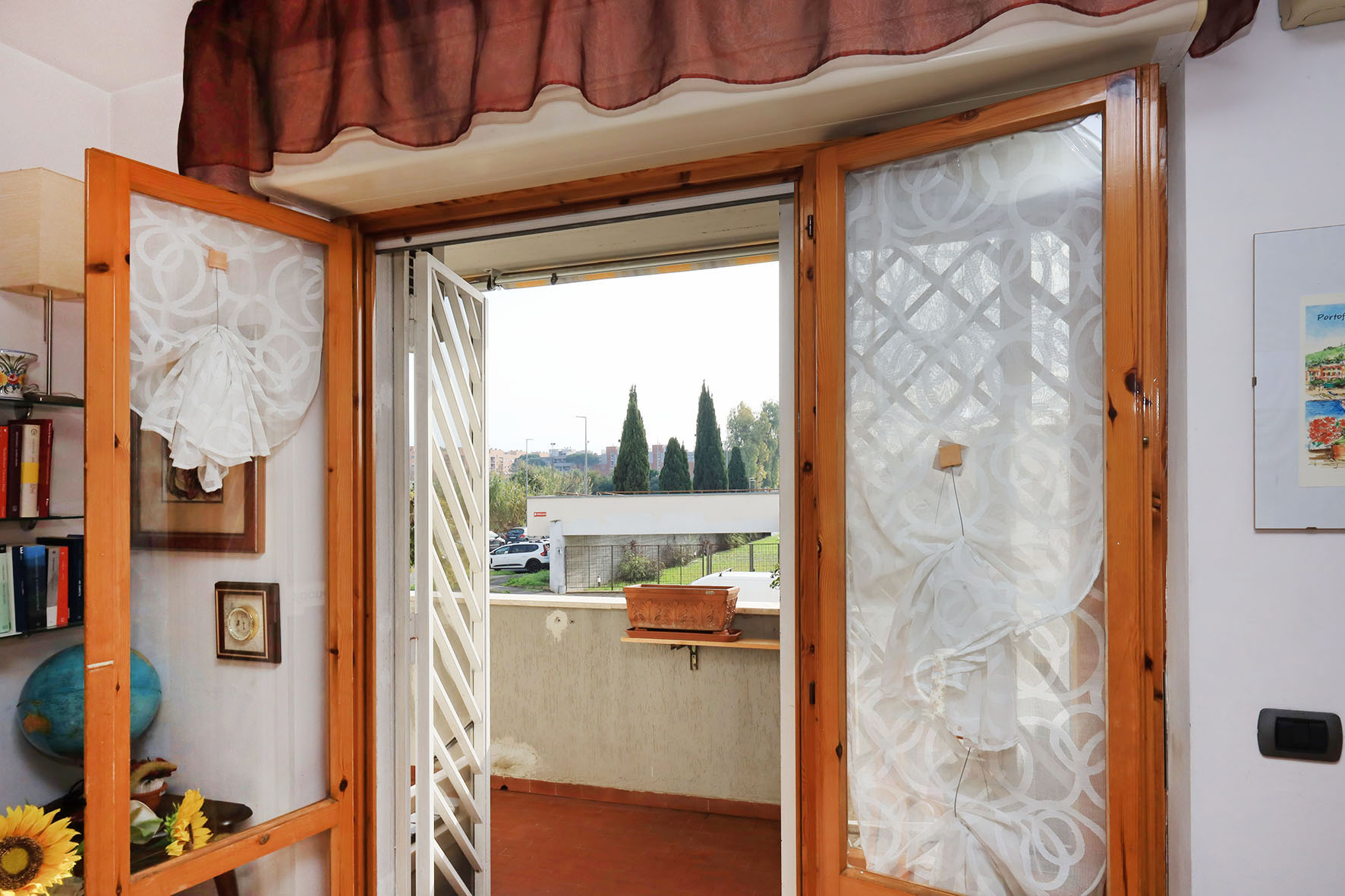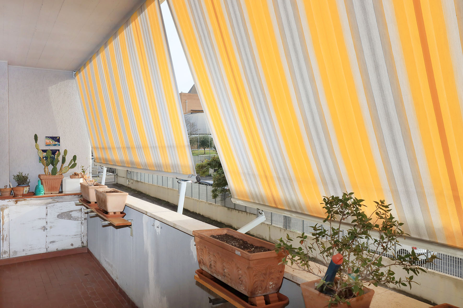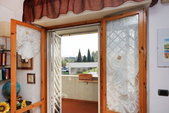Il balcone, coperto, permette di poter ospitare un arredo esterno, con tavolino e sedie. Grate di protezione apribili alle finestre, con zanzariere.