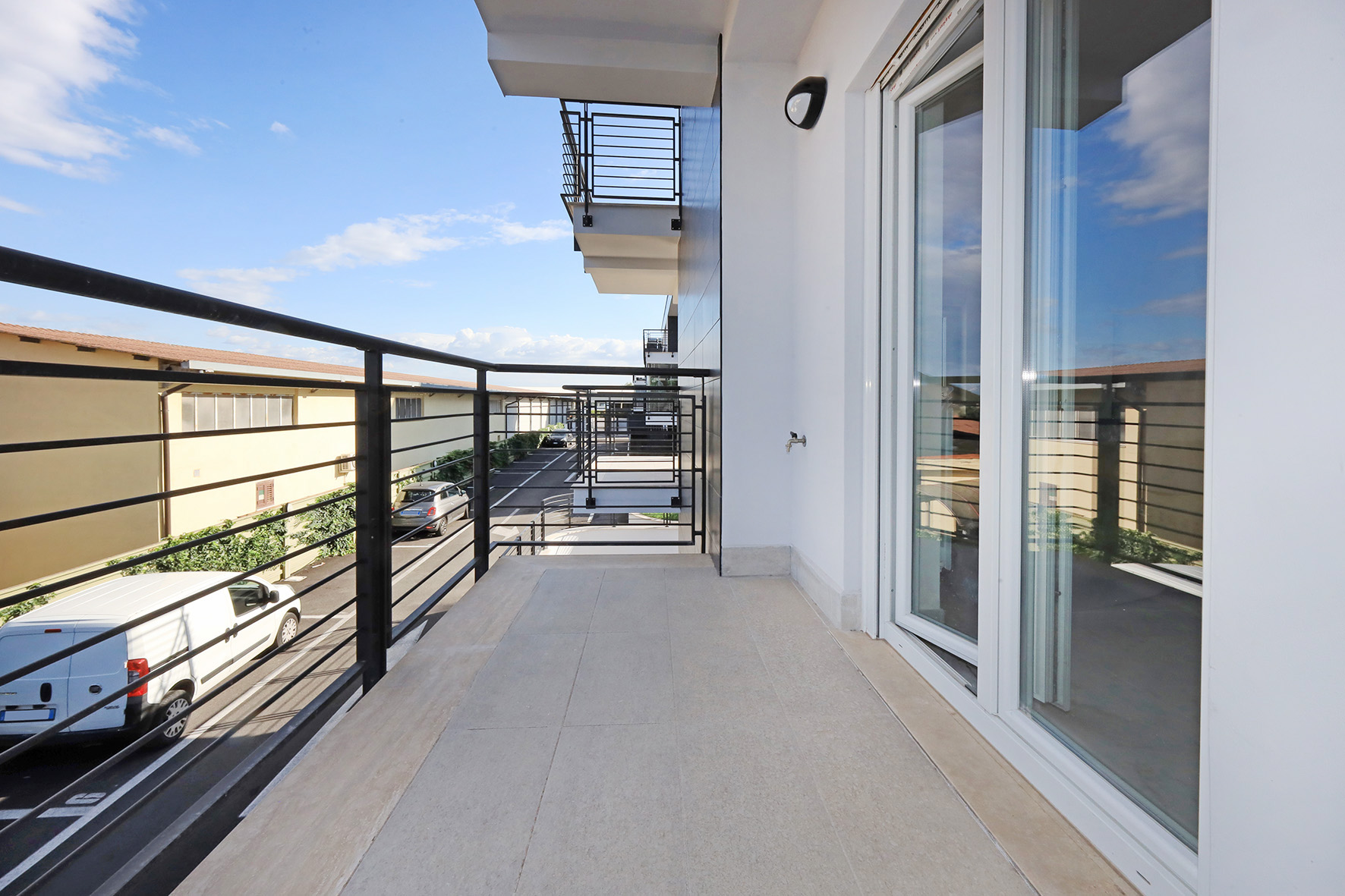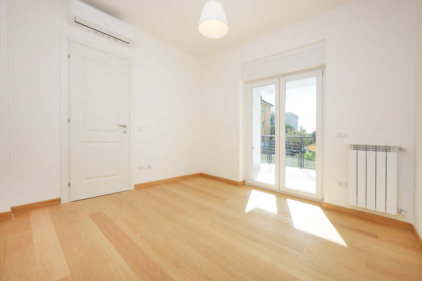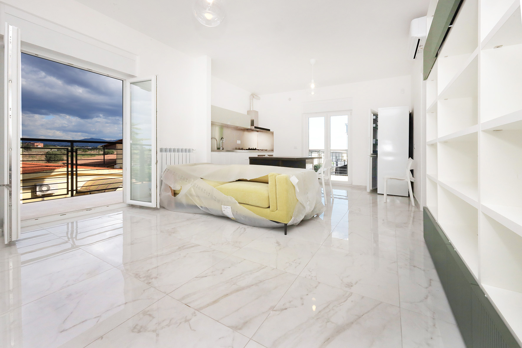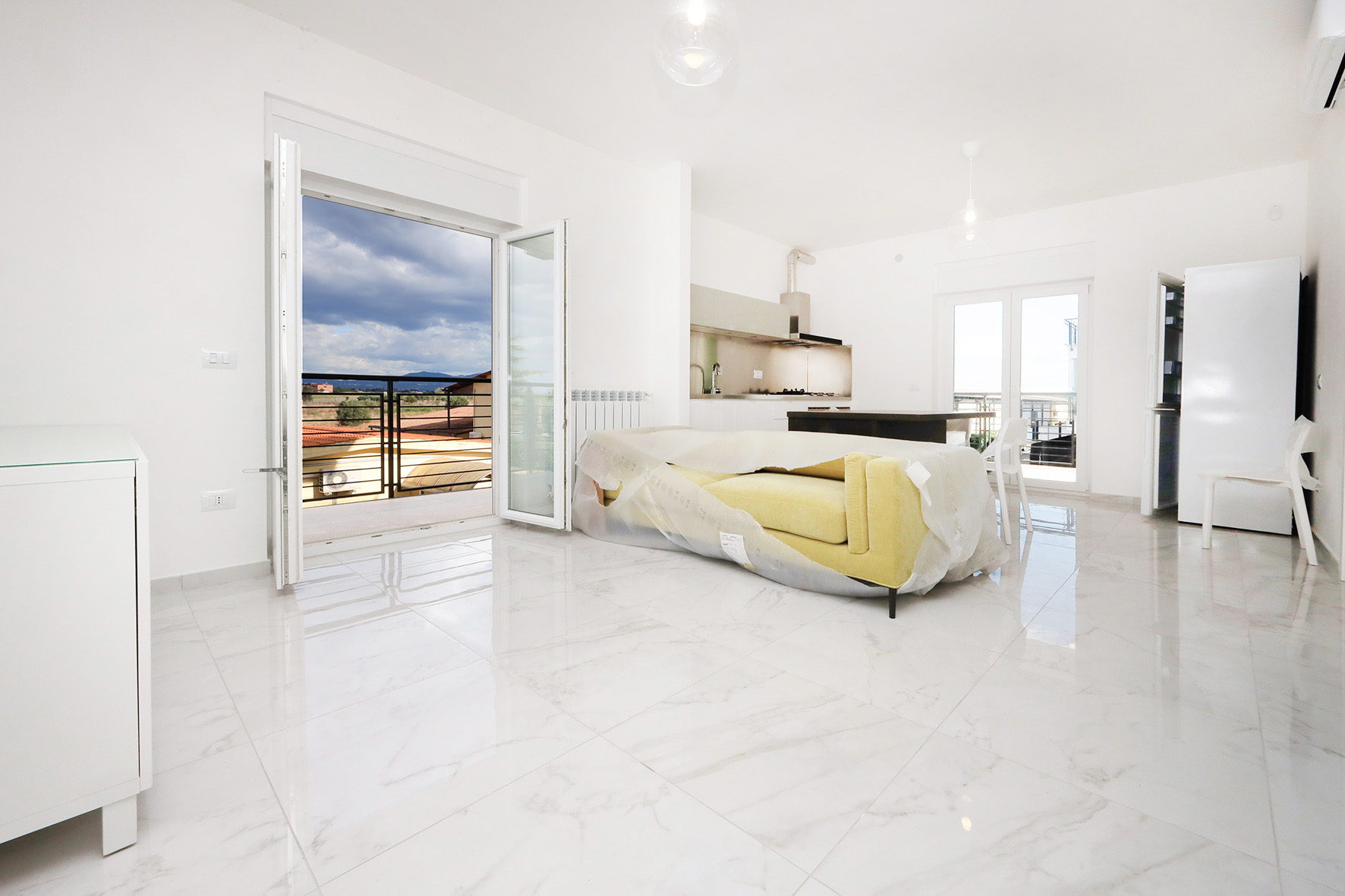 Pavimento con piastrelle di grès fine porcellanato effetto marmo e parquet, sia nella zona giorno che nella zona notte; zoccolino dello stesso materiale. Rivestimento bagno sempre di gres porcellanato. Nella corte esterna il terrazzo è pavimentato con piastrelle di gres porcellanato antigelivo, con superficie levigata. Le ringhiere, in ferro zincato, sono state rifinite con smalto nero sintetico opaco.