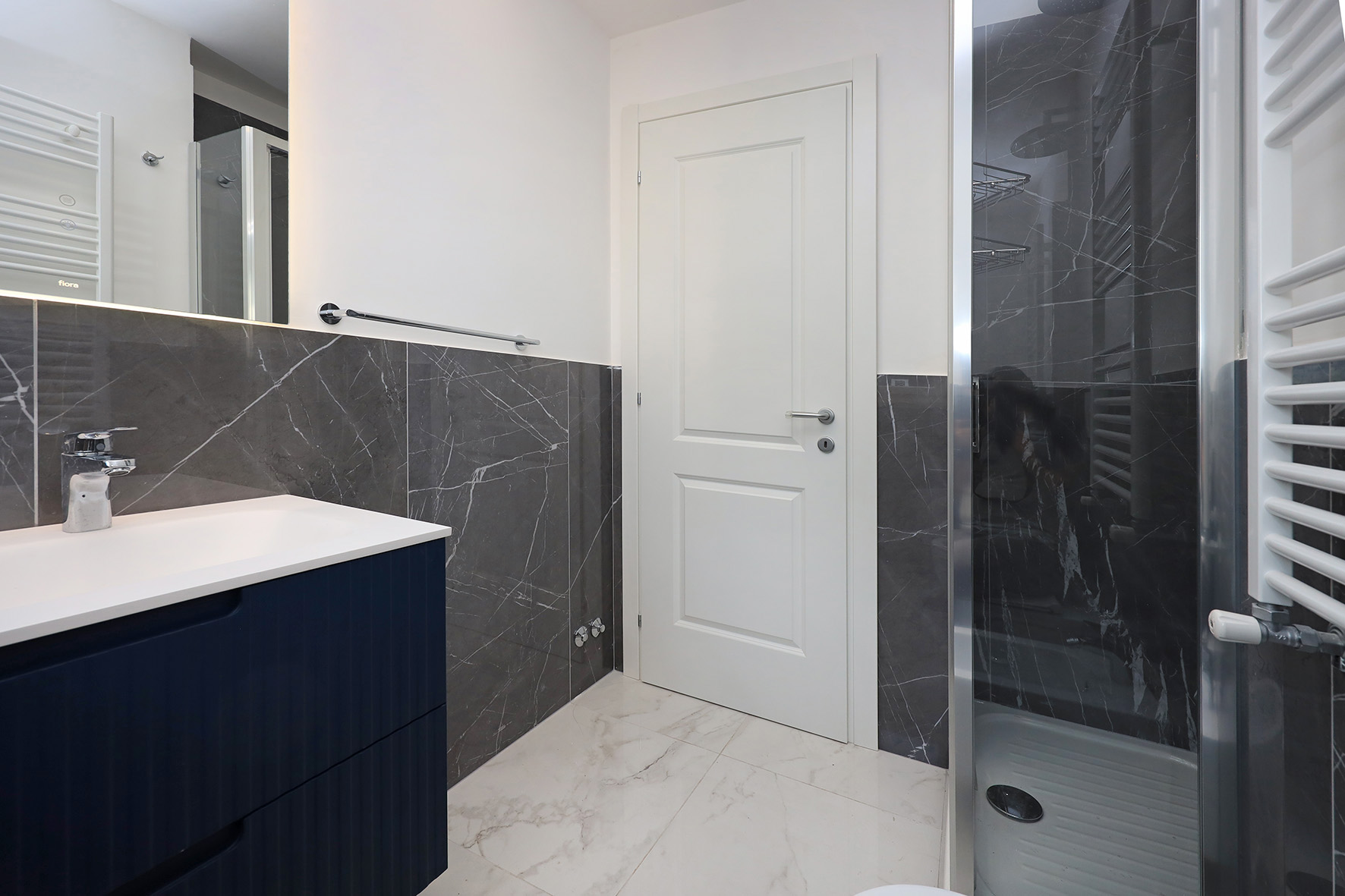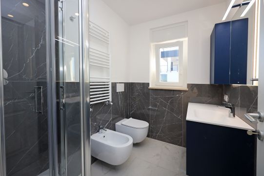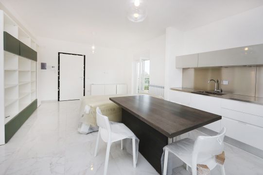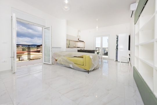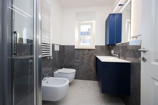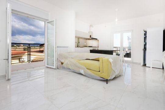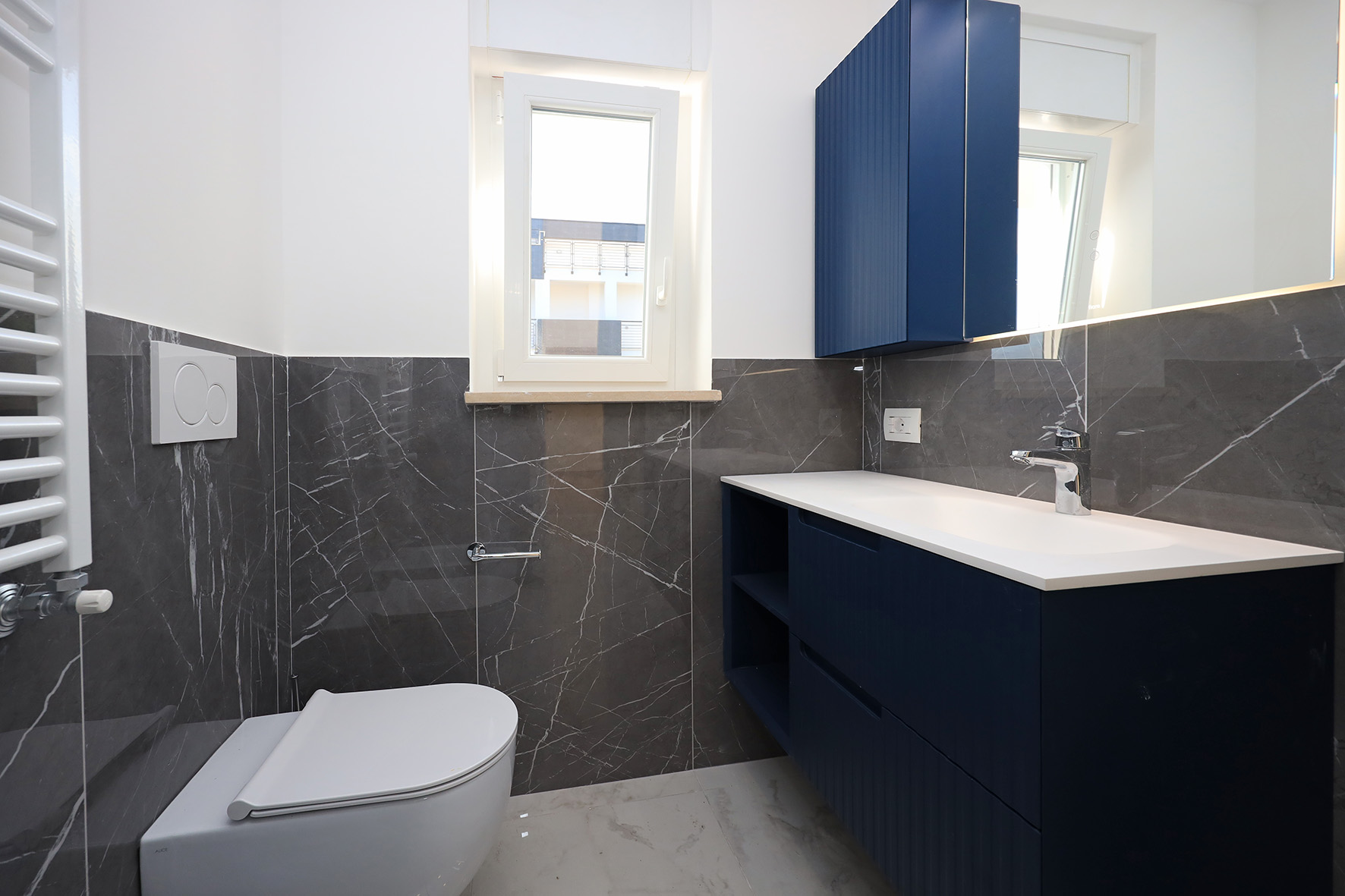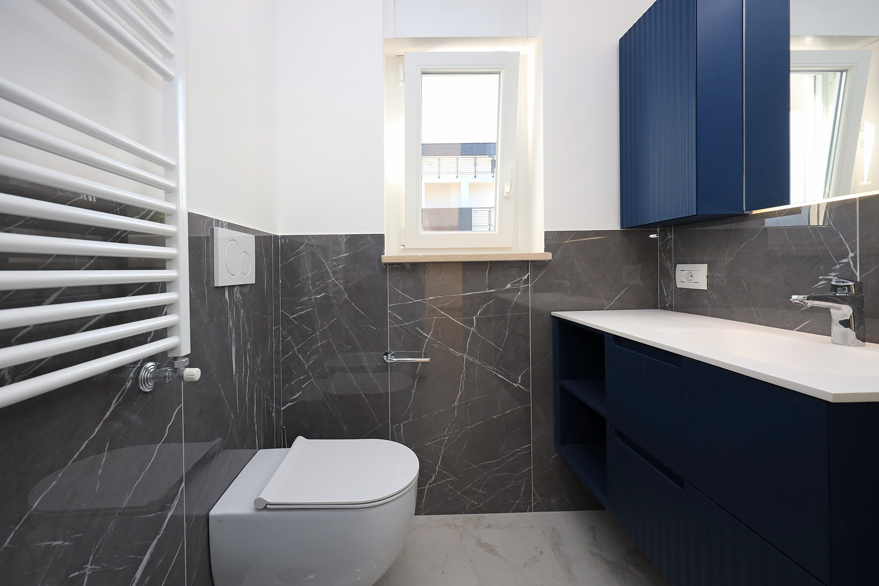 Pavimento con piastrelle di grès fine porcellanato effetto marmo e parquet, sia nella zona giorno che nella zona notte; zoccolino dello stesso materiale. Rivestimento bagno sempre di gres porcellanato. Nella corte esterna il terrazzo è pavimentato con piastrelle di gres porcellanato antigelivo, con superficie levigata. Le ringhiere, in ferro zincato, sono state rifinite con smalto nero sintetico opaco.