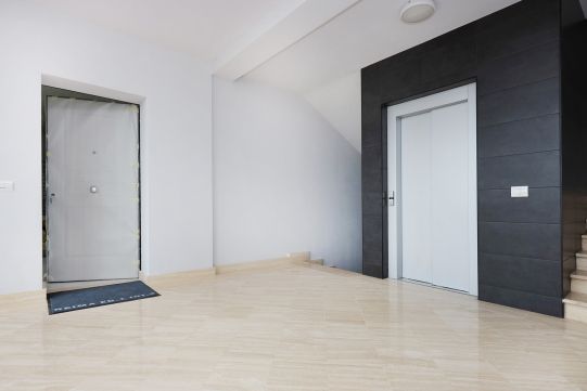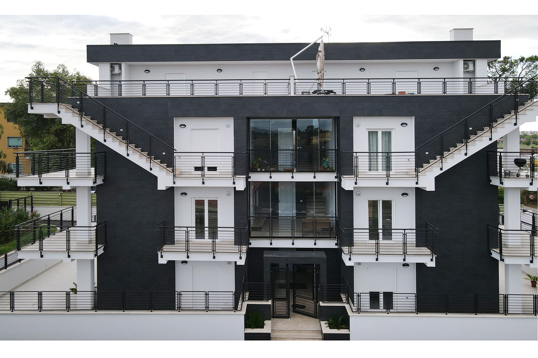 La pavimentazione di accesso alla palazzina è in lastre di travertino.