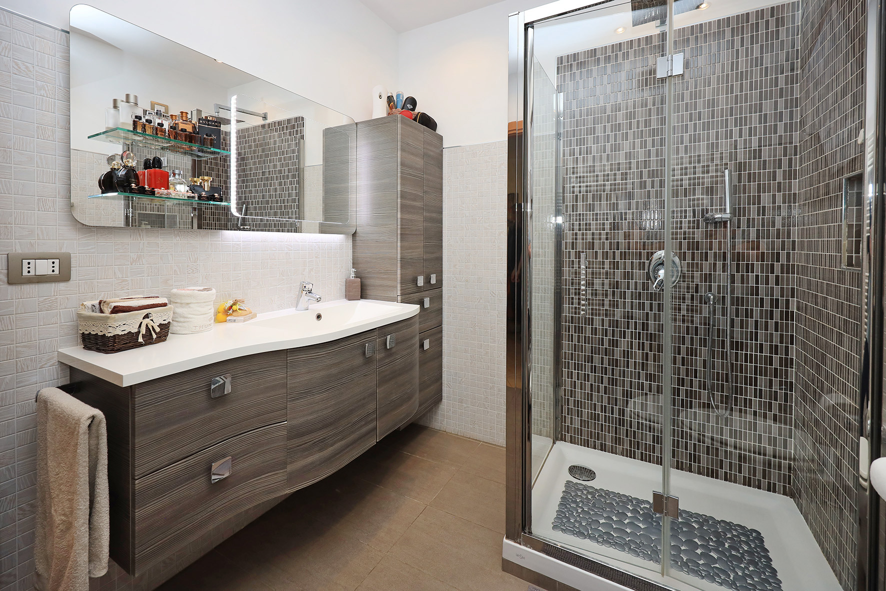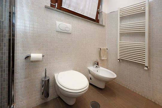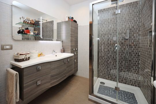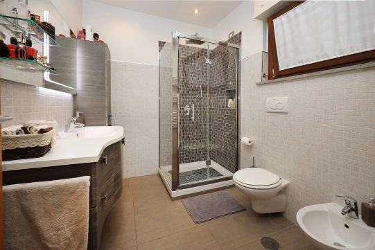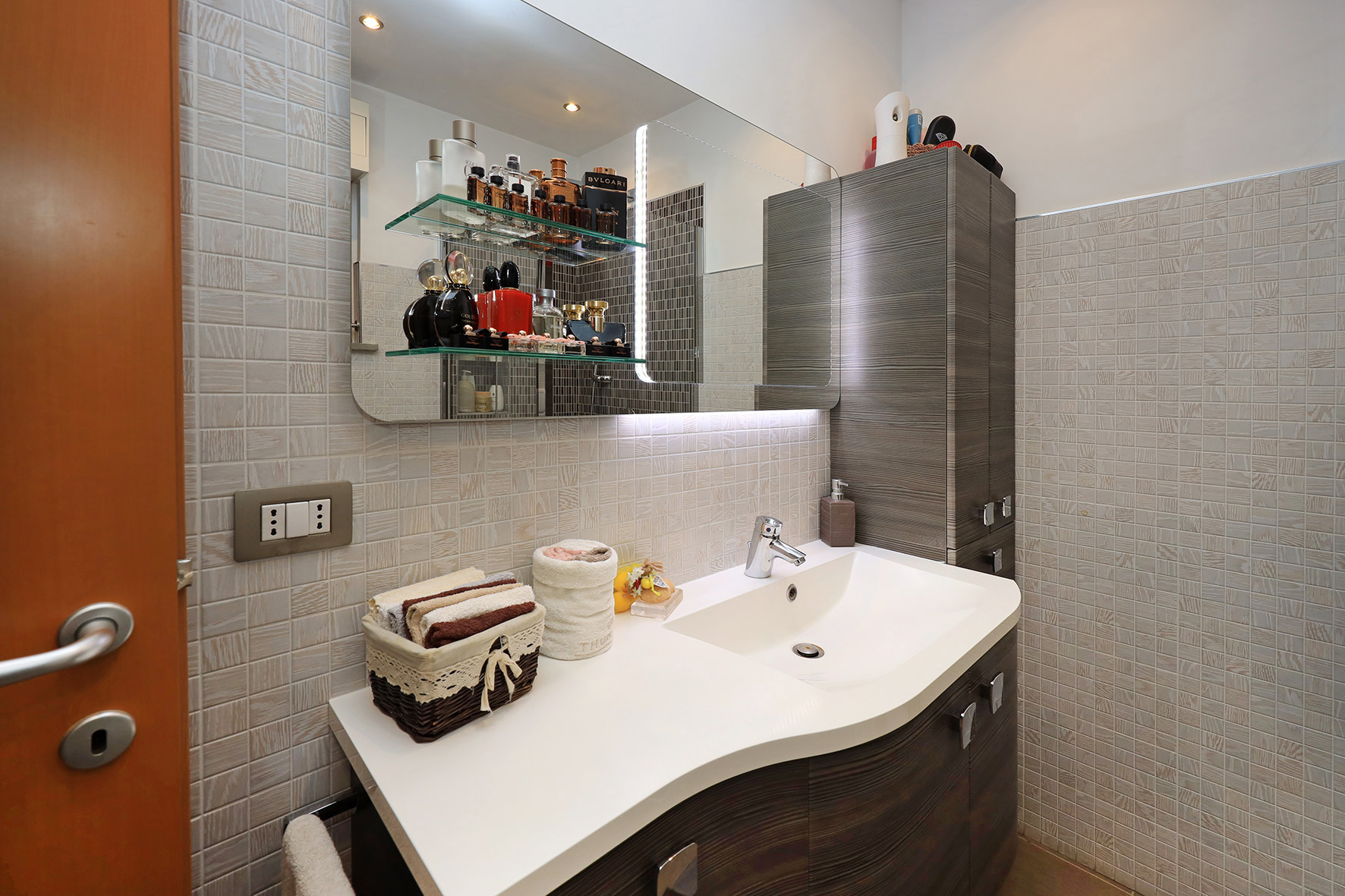 Le pareti interne sono rifinite con tinta. Il bagno, provvisto di finestra, è stato completamente ristrutturato nel 2014 ed è completo di tutti i sanitari, provvisto di una comoda doccia, con relativa cabina. Rubinetteria miscelatori monocomando, pavimentazione e rivestimenti del bagno (h 190 cm. circa) sono in ceramica. Impianto di videocitofono.