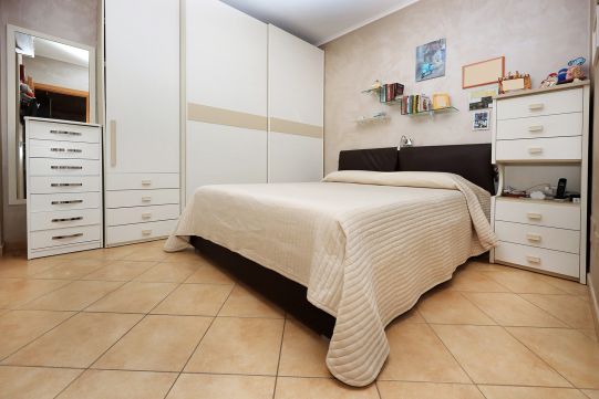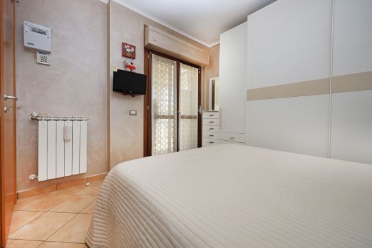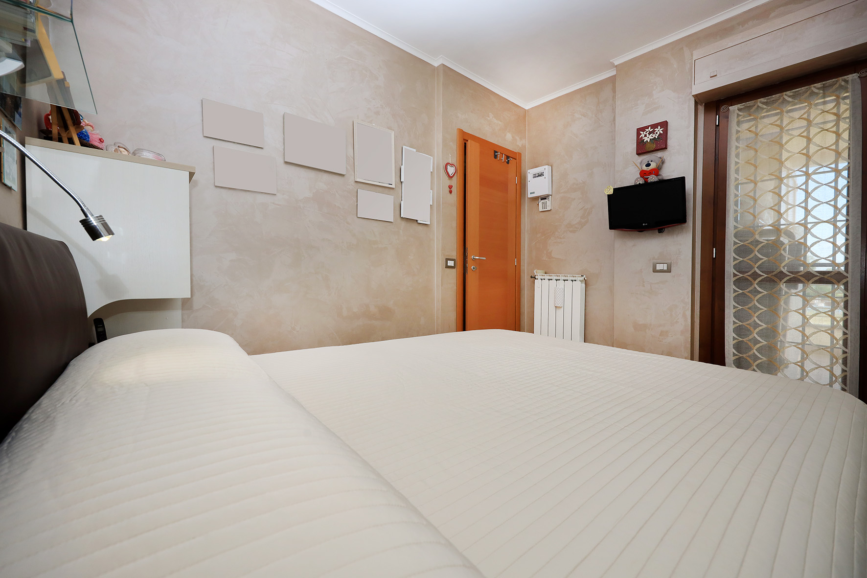 L’appartamento ultimato nel secondo semestre 2008, si presenta in buone condizioni. Portoncino blindato con serratura cilindro europeo. Porte interne lisce tamburate color noce chiaro. Infissi esterni (finestre e porte finestre) in legno con doppio vetro. Serramenti cromo satinati. Per la sicurezza della casa sono presenti le grate in ferro, in parte apribili oltre alla predisposizione di un impianto di allarme con la presenza di sensori volumetrici esterni (solo nel terrazzo grande) ed interni. Zanzariere fisse, presenti.