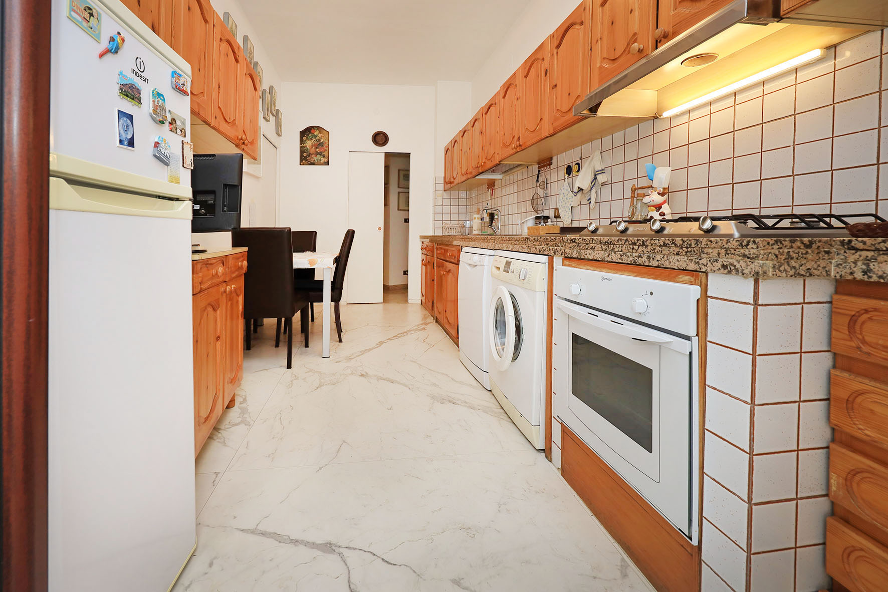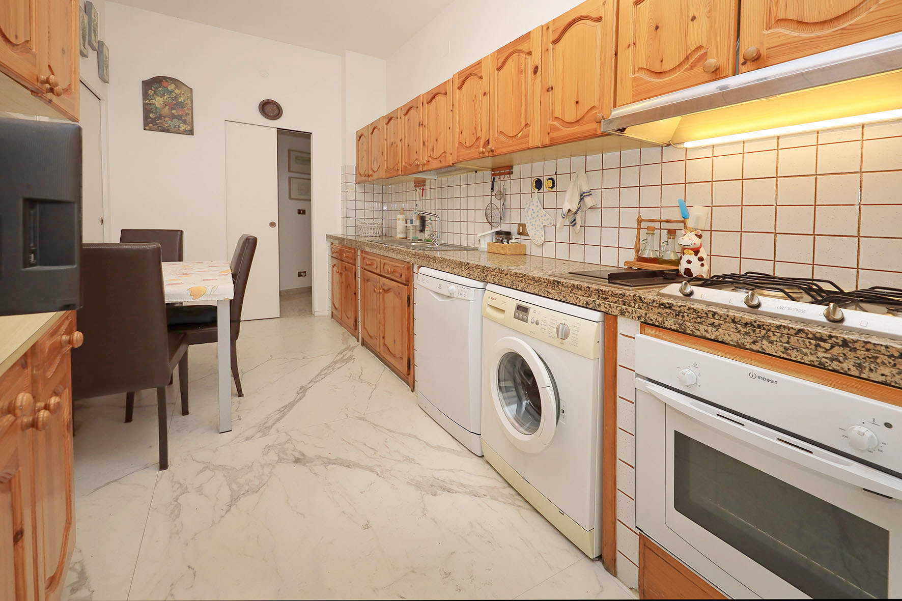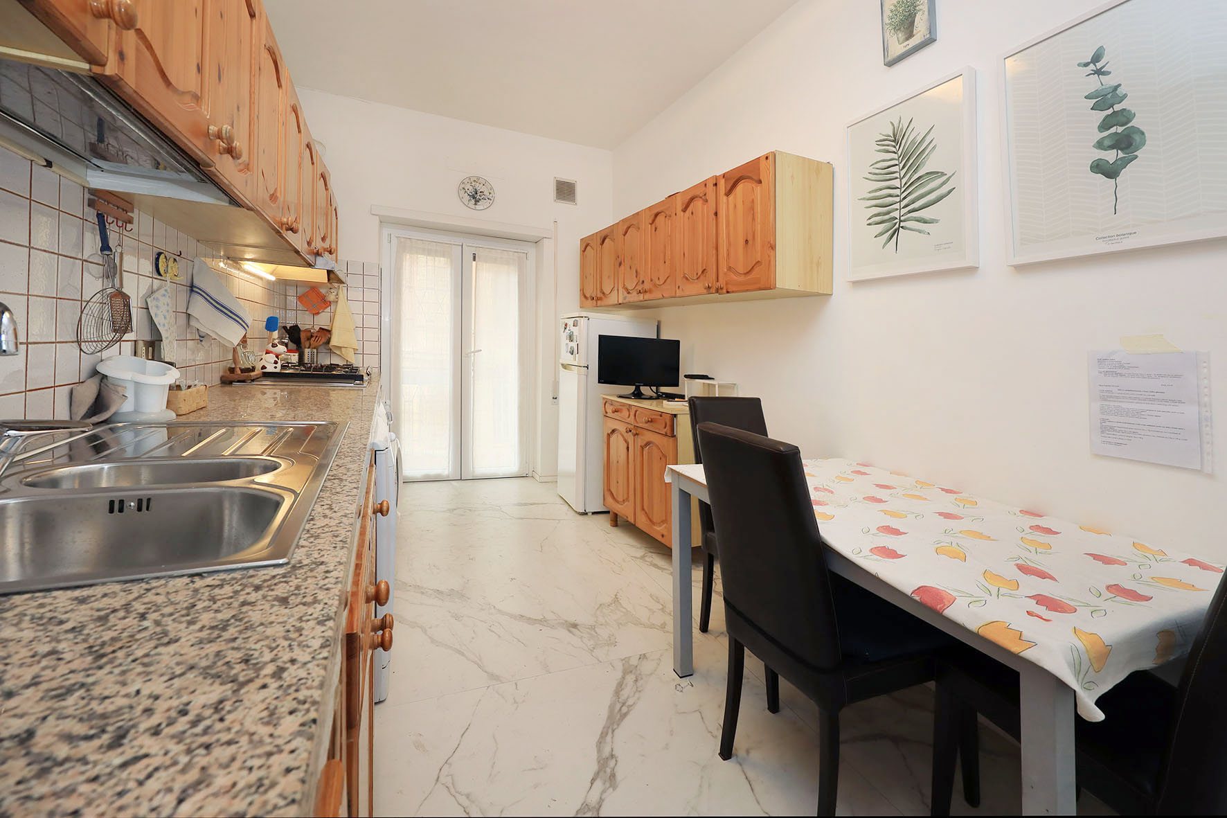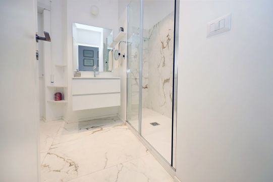Portoncino d’ingresso blindato con cilindro europeo. Pavimentazione ingresso e salone in marmo, Pavimentazione zona notte con marmittoni ad esclusione di quello di una camera da letto matrimoniale dove è presente il parquet. Le porte interne sono state quasi tutte sostituite ed alcune di esse sono a scrigno. I due bagni, con rubinetteria miscelatori monocomando, sono provvisti entrambi di finestre; uno dei due, il più grande, è stato completamente ristrutturato ed ha una comoda doccia. Finestre e porte finestre in PVC (internamente di colore bianco ed esternamente di colore legno).