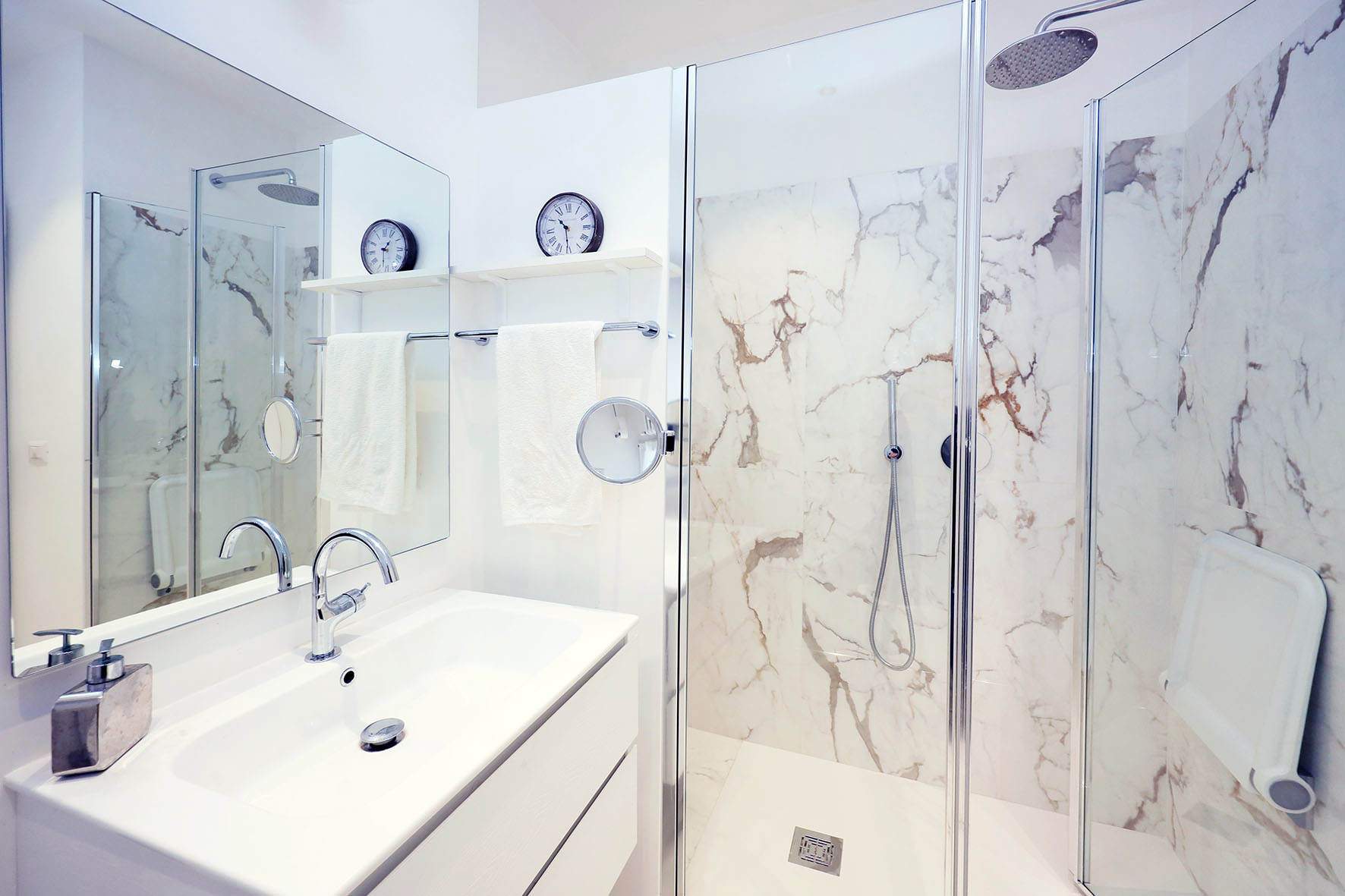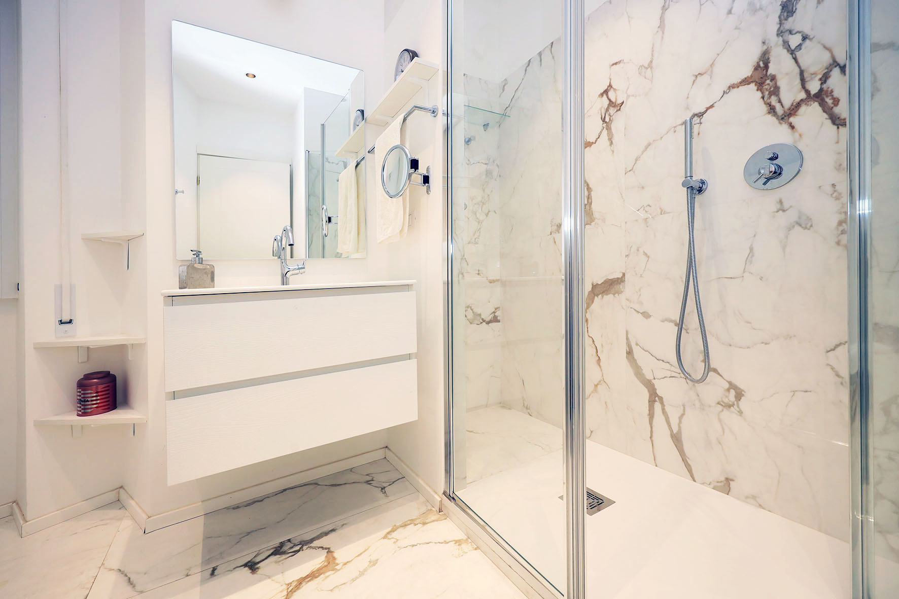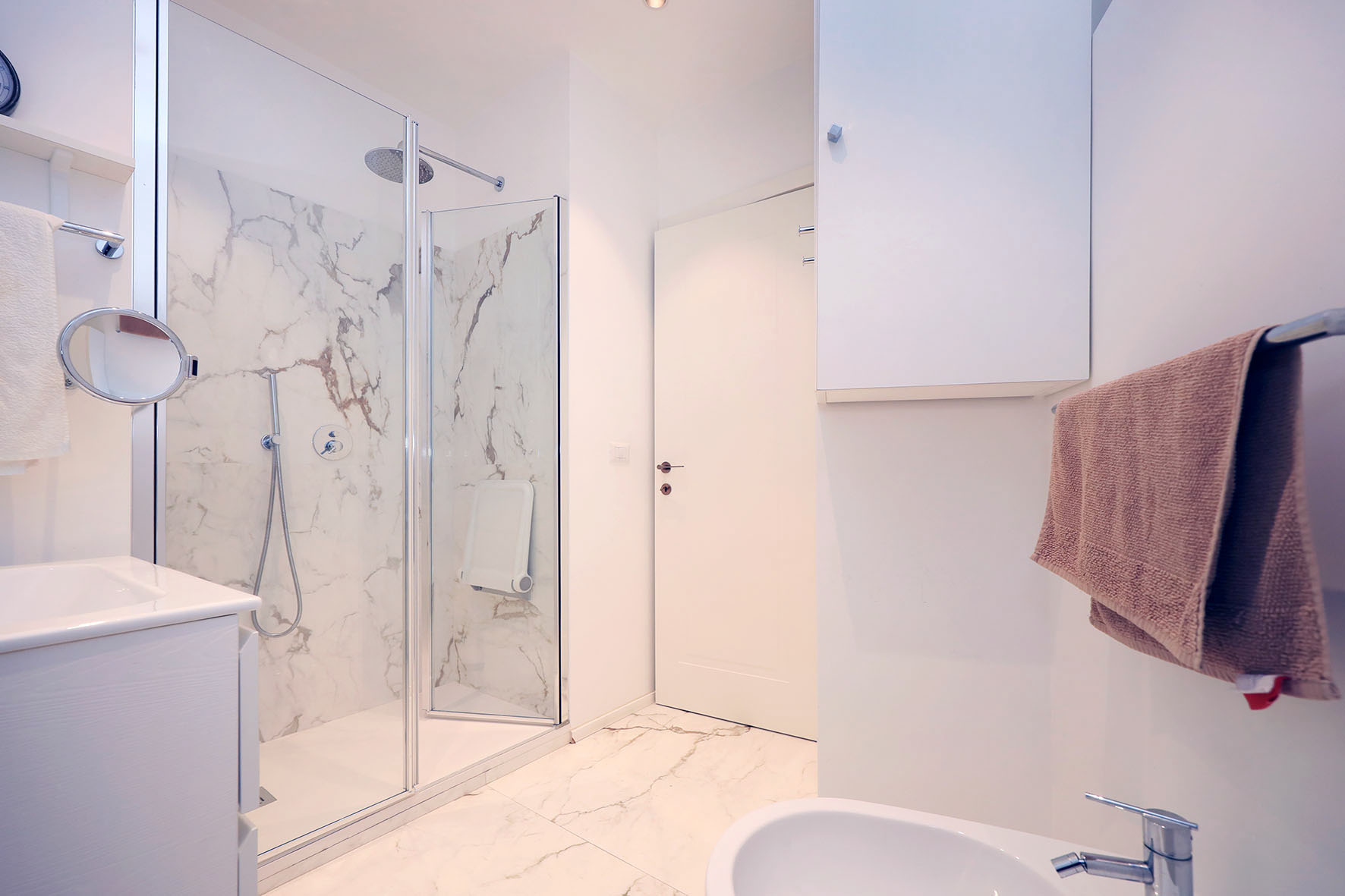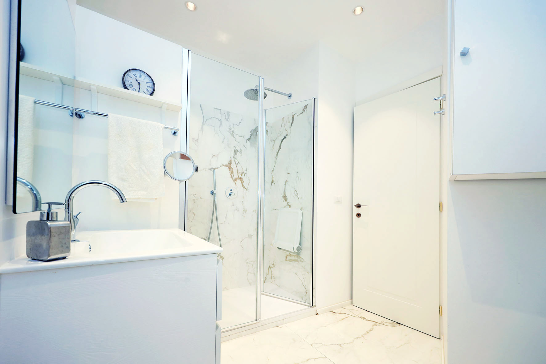 Portoncino d’ingresso blindato con cilindro europeo. Pavimentazione ingresso e salone in marmo, Pavimentazione zona notte con marmittoni ad esclusione di quello di una camera da letto matrimoniale dove è presente il parquet. Le porte interne sono state quasi tutte sostituite ed alcune di esse sono a scrigno. I due bagni, con rubinetteria miscelatori monocomando, sono provvisti entrambi di finestre; uno dei due, il più grande, è stato completamente ristrutturato ed ha una comoda doccia. Finestre e porte finestre in PVC (internamente di colore bianco ed esternamente di colore legno).