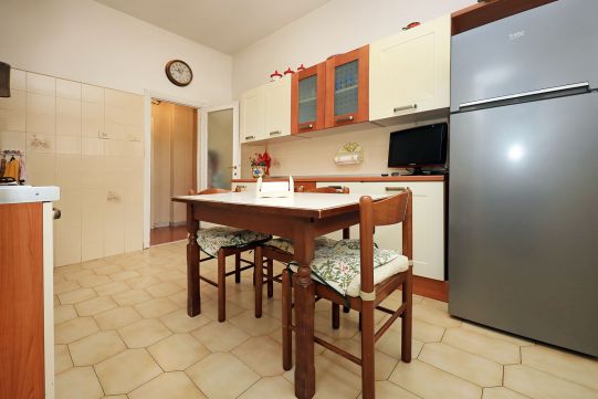 Portoncino blindato. Porte interne a battente. Avvolgibili in pvc. Le finestre sono in legno con vetro singolo. Pavimentazione in marmittoni formato 20x20 in tutte le camere, ad esclusione di cucina e bagno dove è presente la ceramica. Zoccolino in marmo.
