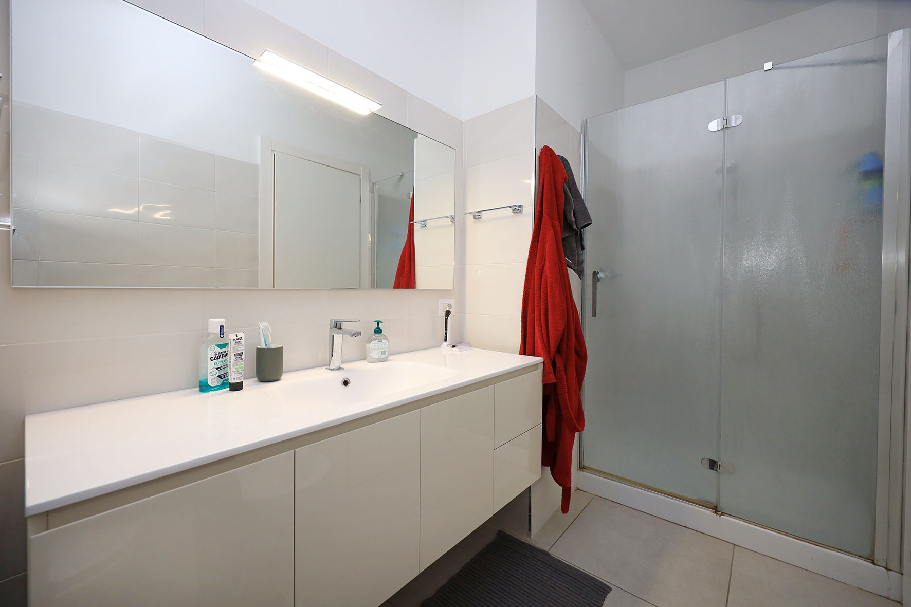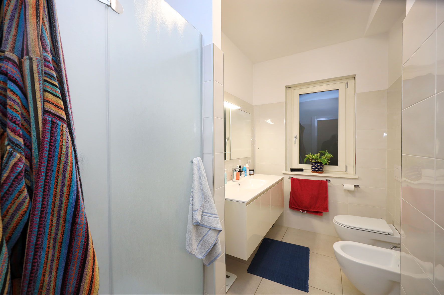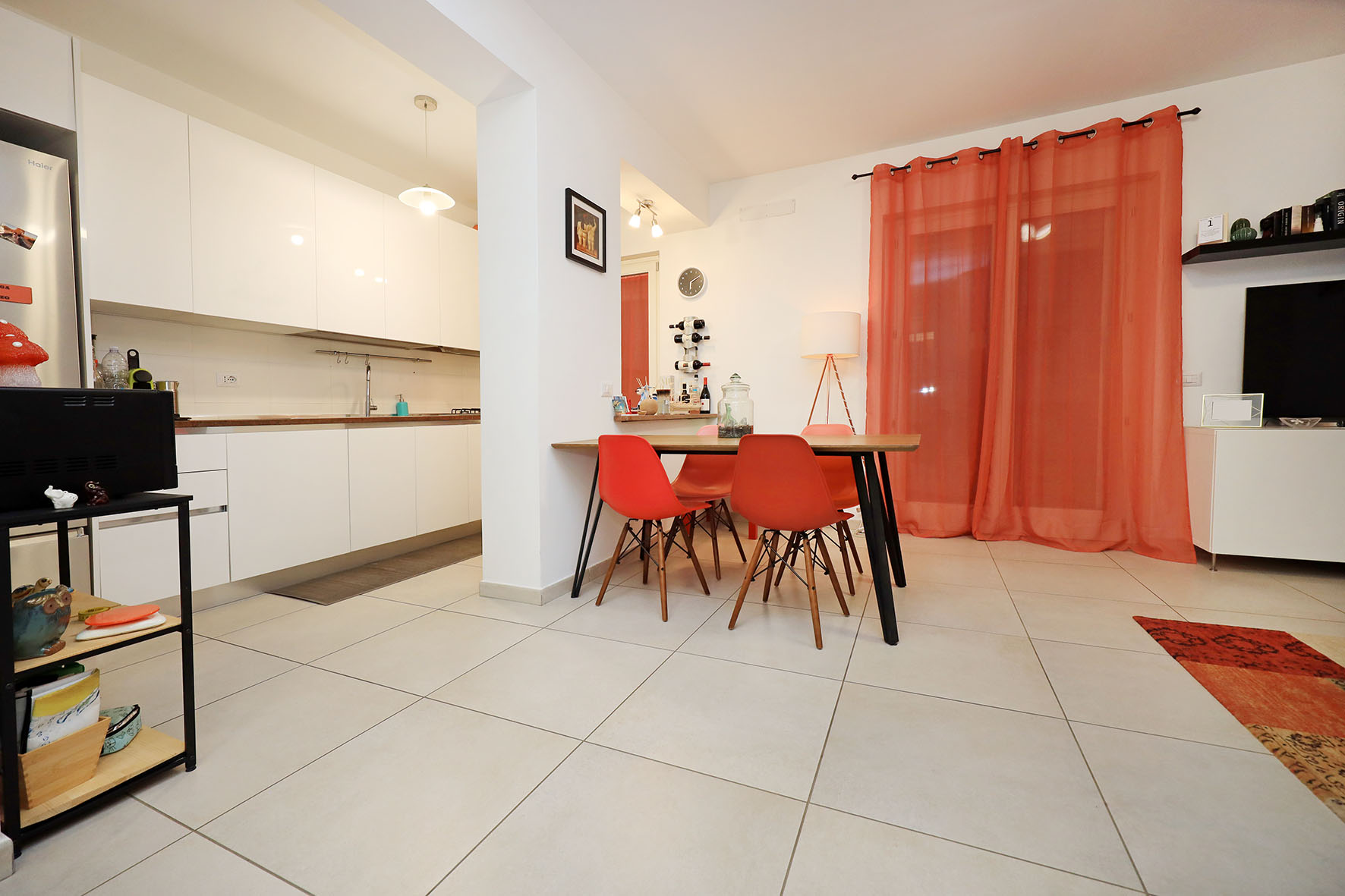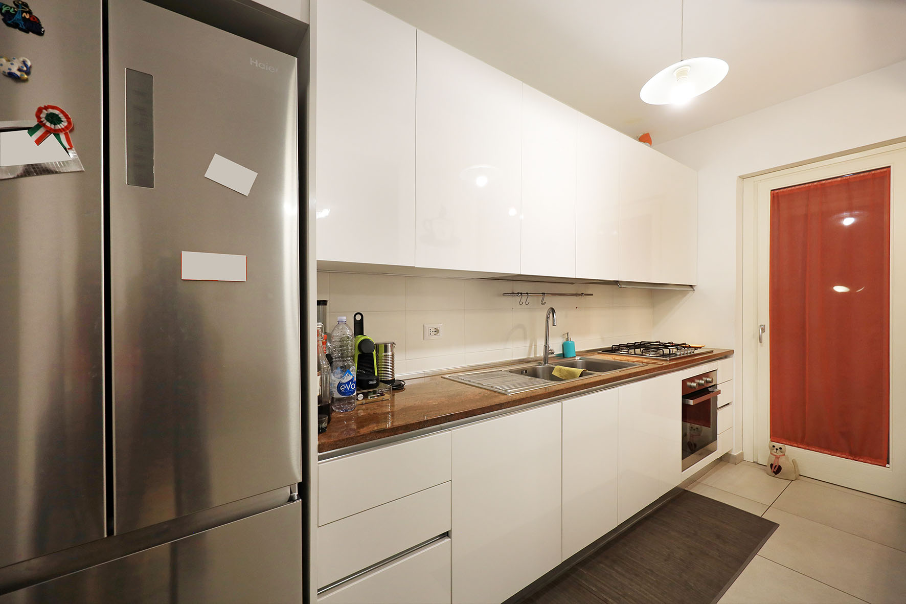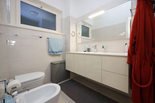 L’appartamento è dotato di portoncino blindato, infissi esterni in legno con doppio vetro, pavimentazione in gres porcellanato, sanitari sospesi, i piatti doccia dei due bagni sono fuori misura: rubinetteria miscelatori monocomando di prima scelta, marca REMER. Si precisa che l’appartamento è dotato di impianto di riscaldamento a pavimento. Gli impianti (elettrico - termico - gas) sono certificati. Impianto di video – citofono, marca COMELIT con WI FI (si può rispondere al citofono pur non essendo in casa e dialogare con chi vi sta video - chiamando. Impianto tv terrestre e satellitare centralizzati. Impianto di allarme, predisposizione impianto di condizionamento. La cucina completamente arredata, è provvista di lavastoviglie. Nelle parti comuni pavimentazione in travertino e ringhiere di ferro, verniciate alle polveri epossidiche.
