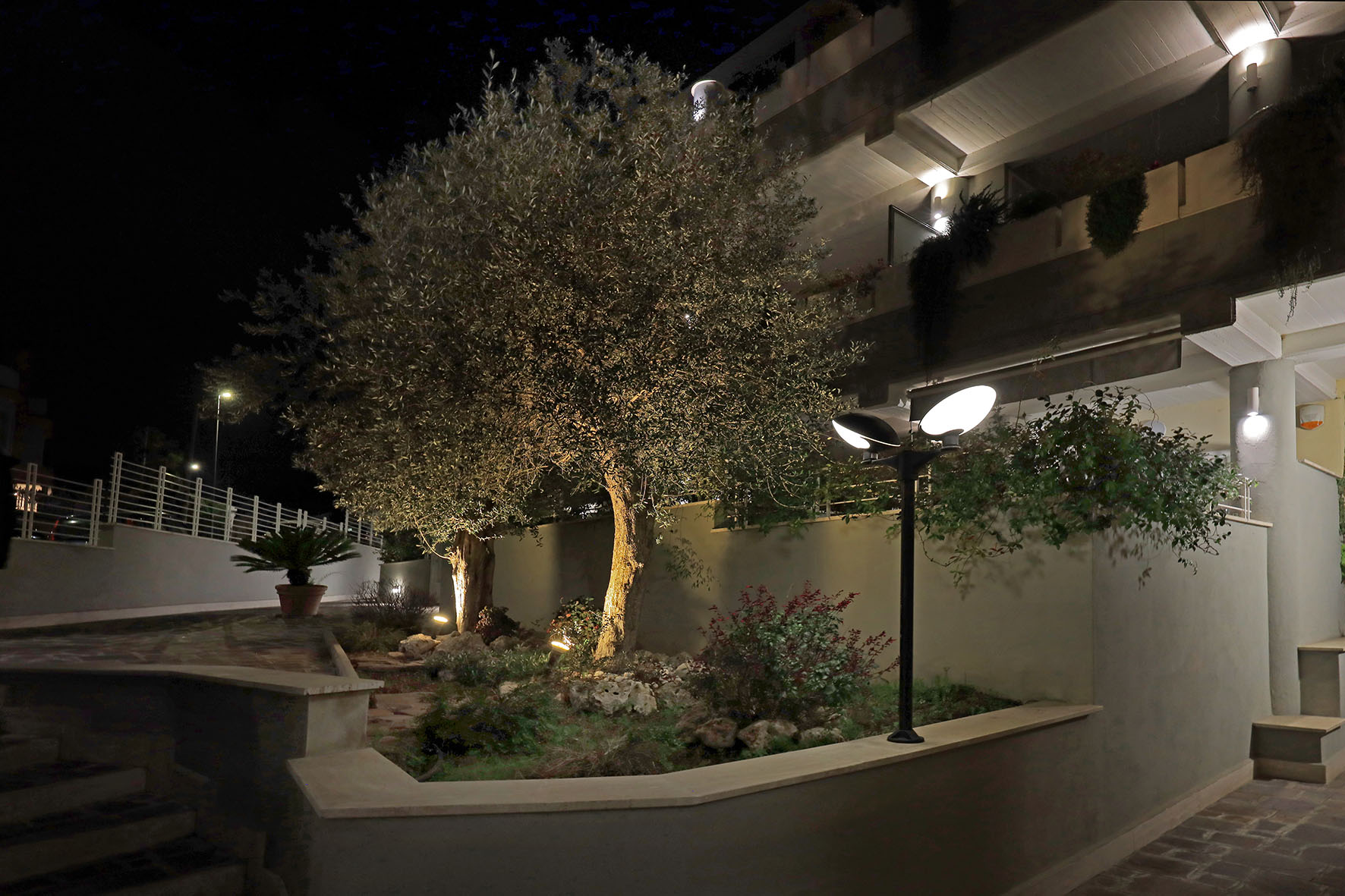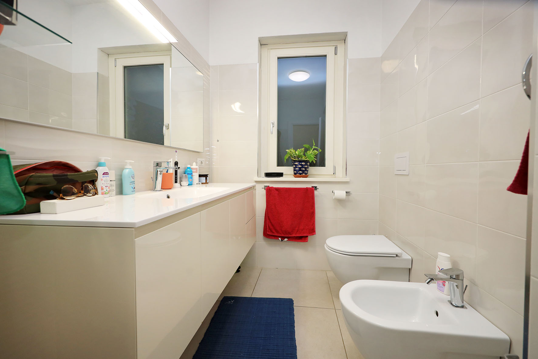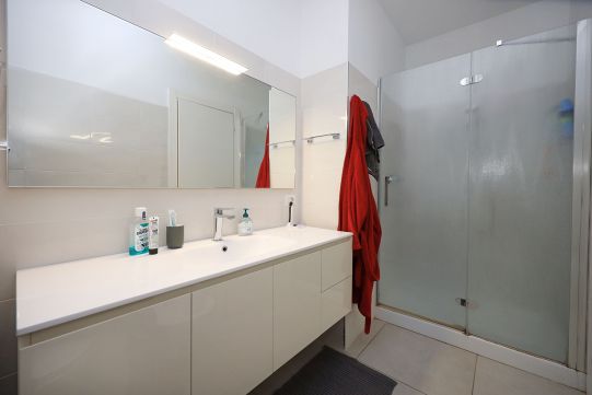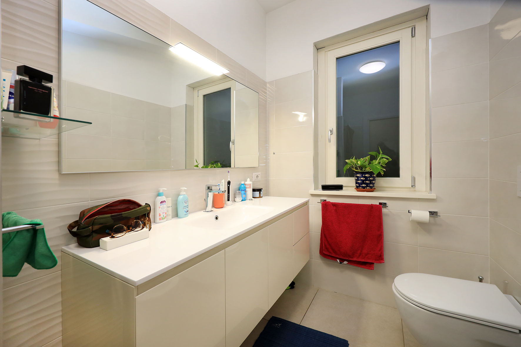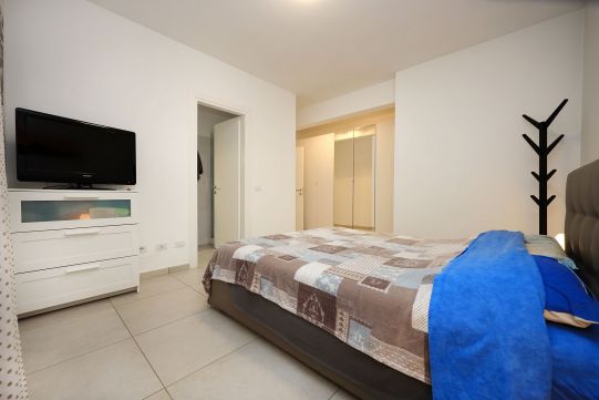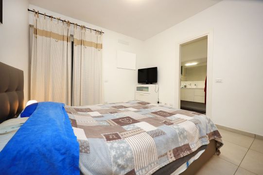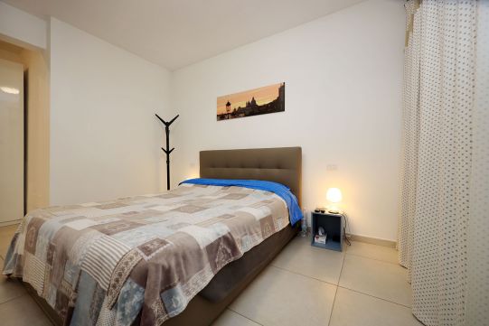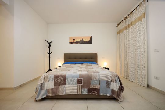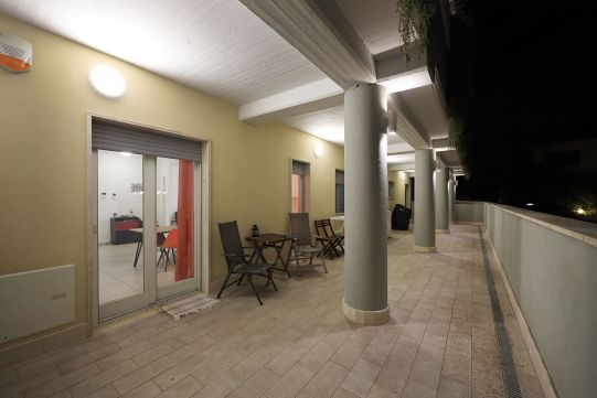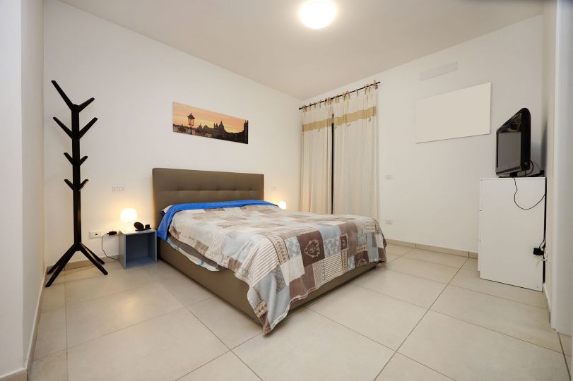 Precisamente l’appartamento è composto da soggiorno, cucina, disimpegno notte, due camere da letto, due bagni con finestra, terrazzo a livello di circa mq. 60 e posto auto scoperto (accesso con telecomando). La camera da letto matrimoniale è provvista di bagno.