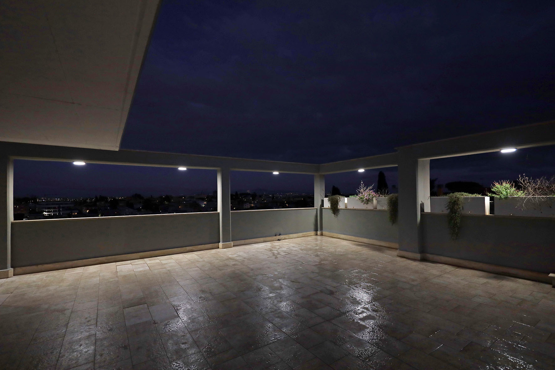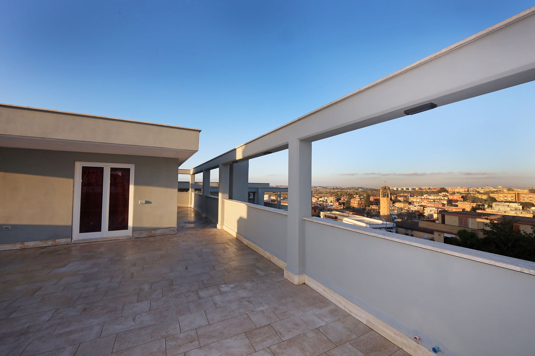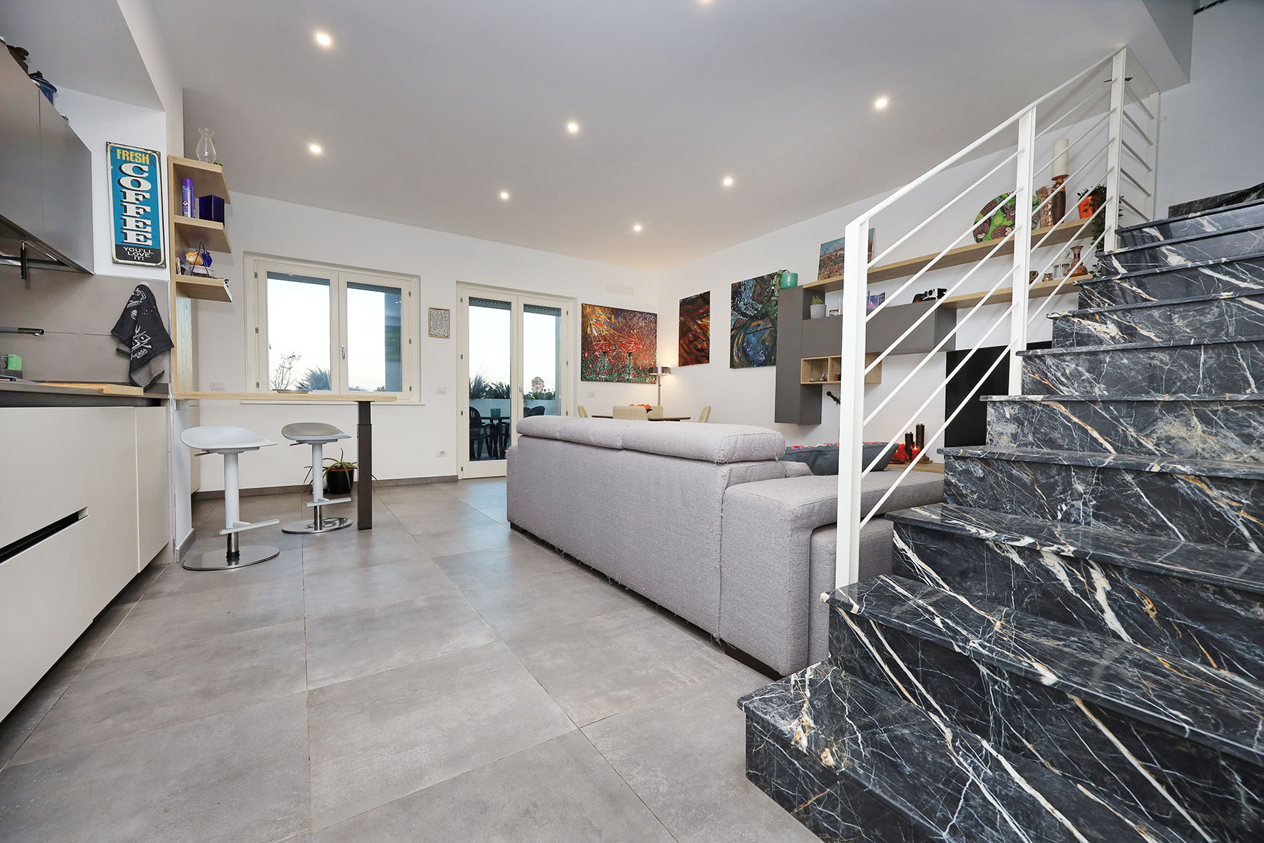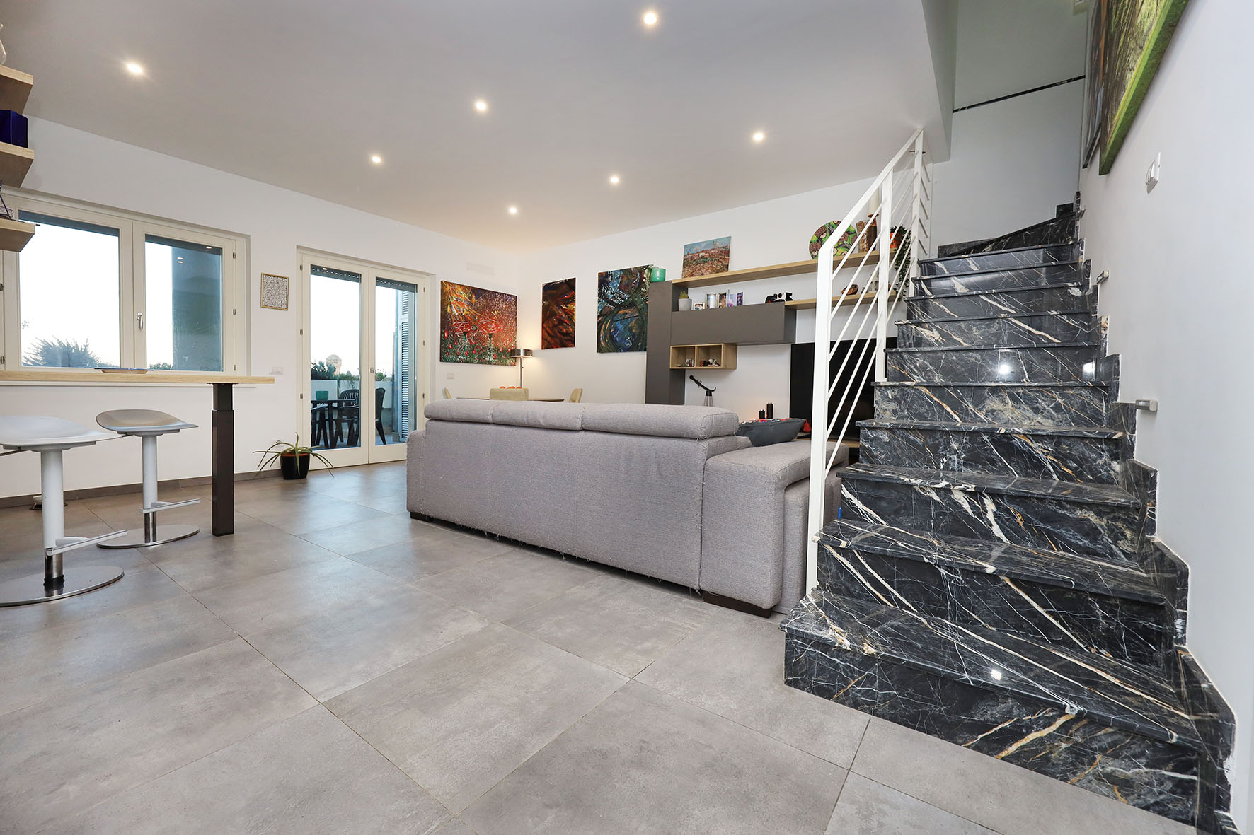 L’appartamento si compone nell’insieme sui due piani di salone con angolo cottura, disimpegno, tre camere-locali, doppi servizi-lavatoio con finestre, due ampi terrazzi al piano secondo oltre un terrazzo panoramico, al piano terzo, con una superficie complessiva degli spazi esterni di circa 150 mq, con vista a trecentosessanta gradi. Gli arredi sono, ovviamente, esclusi (angolo di cottura). E’ incluso nel prezzo di vendita un posto auto scoperto.
