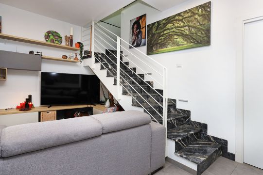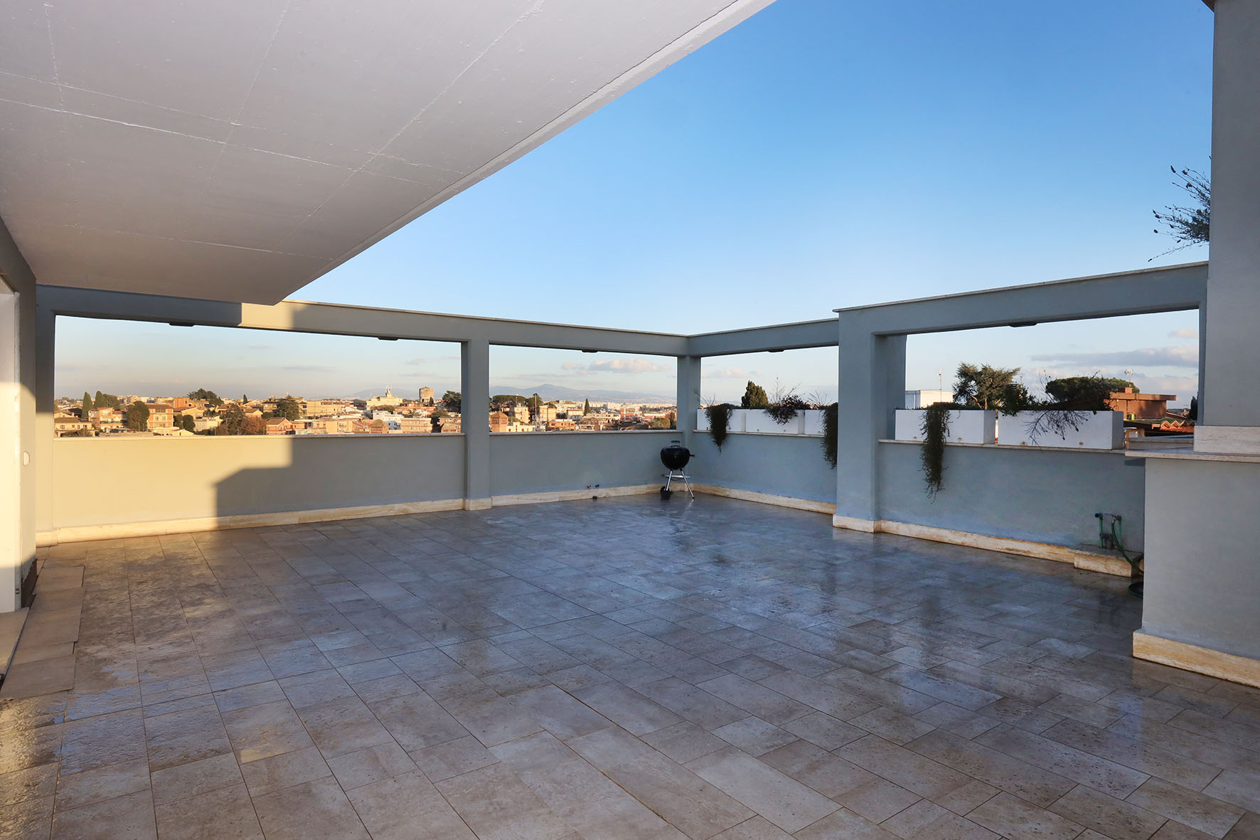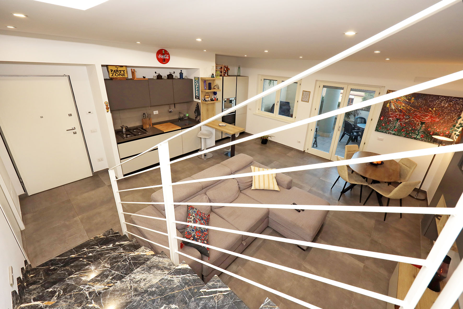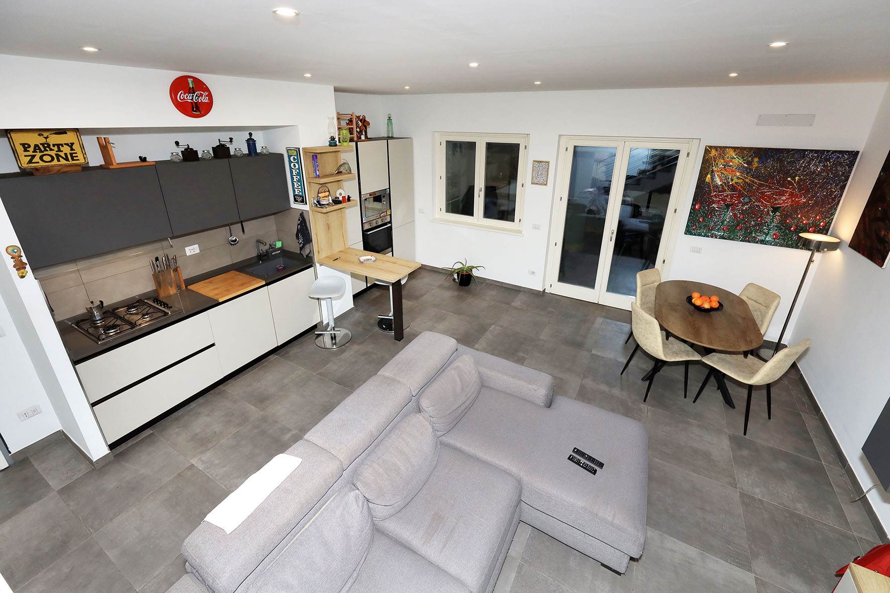 L’appartamento si compone nell’insieme sui due piani di salone con angolo cottura, disimpegno, tre camere-locali, doppi servizi-lavatoio con finestre, due ampi terrazzi al piano secondo oltre un terrazzo panoramico, al piano terzo, con una superficie complessiva degli spazi esterni di circa 150 mq, con vista a trecentosessanta gradi. Gli arredi sono, ovviamente, esclusi (angolo di cottura). E’ incluso nel prezzo di vendita un posto auto scoperto.