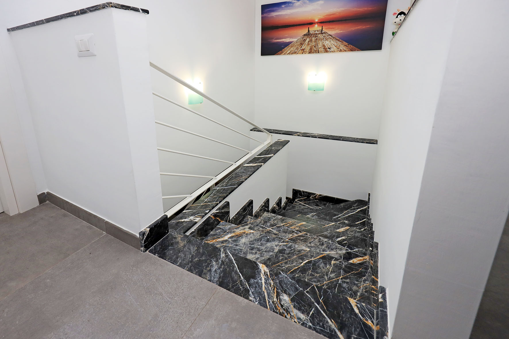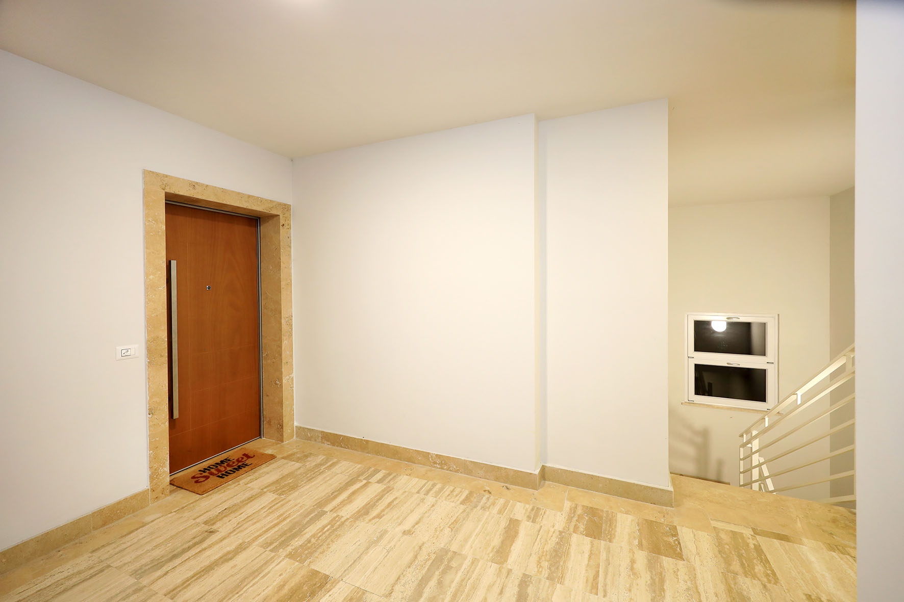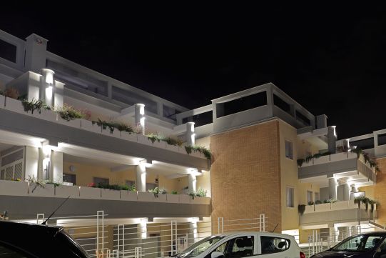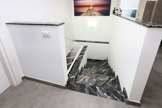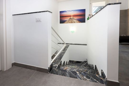 Nelle parti comuni pavimentazione in travertino e ringhiere di ferro, verniciate alle polveri epossidiche, colore bianco opaco.