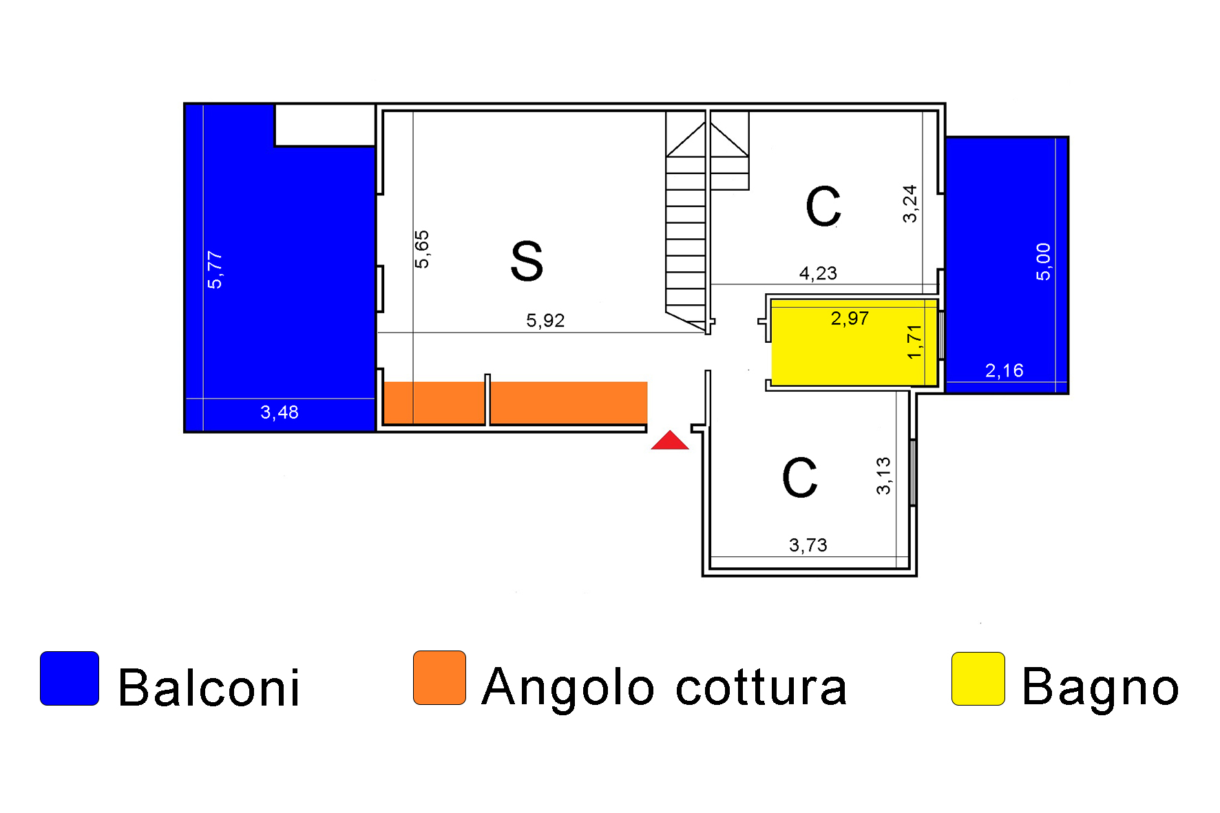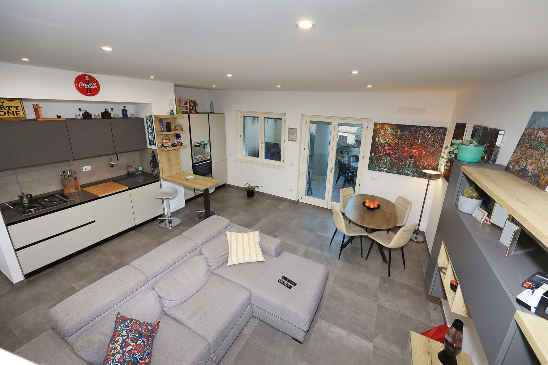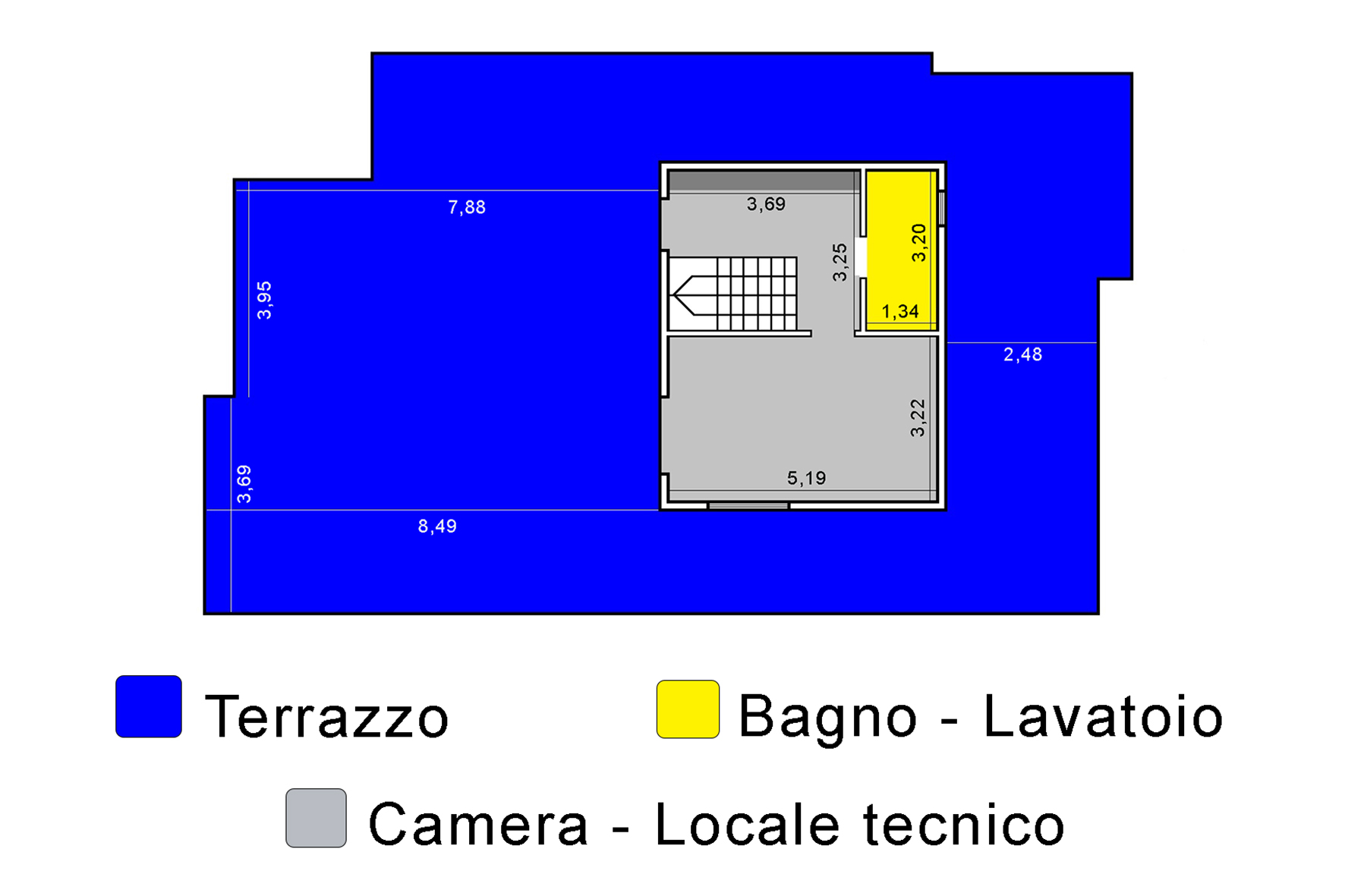 - Salone con angolo di cottura piano secondo, camera-locale piano terzo, est / sud-est;