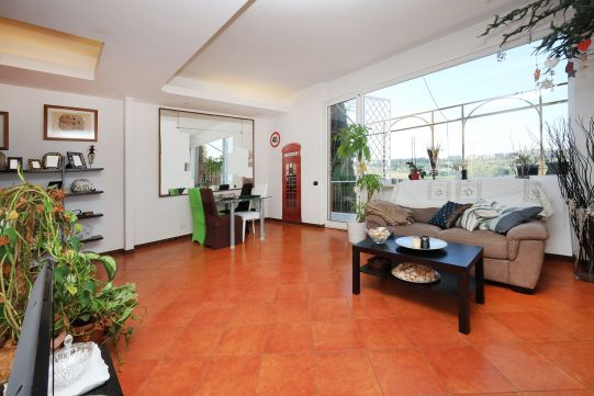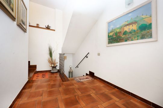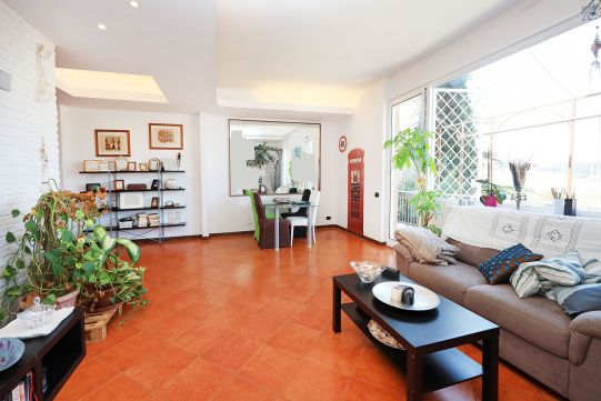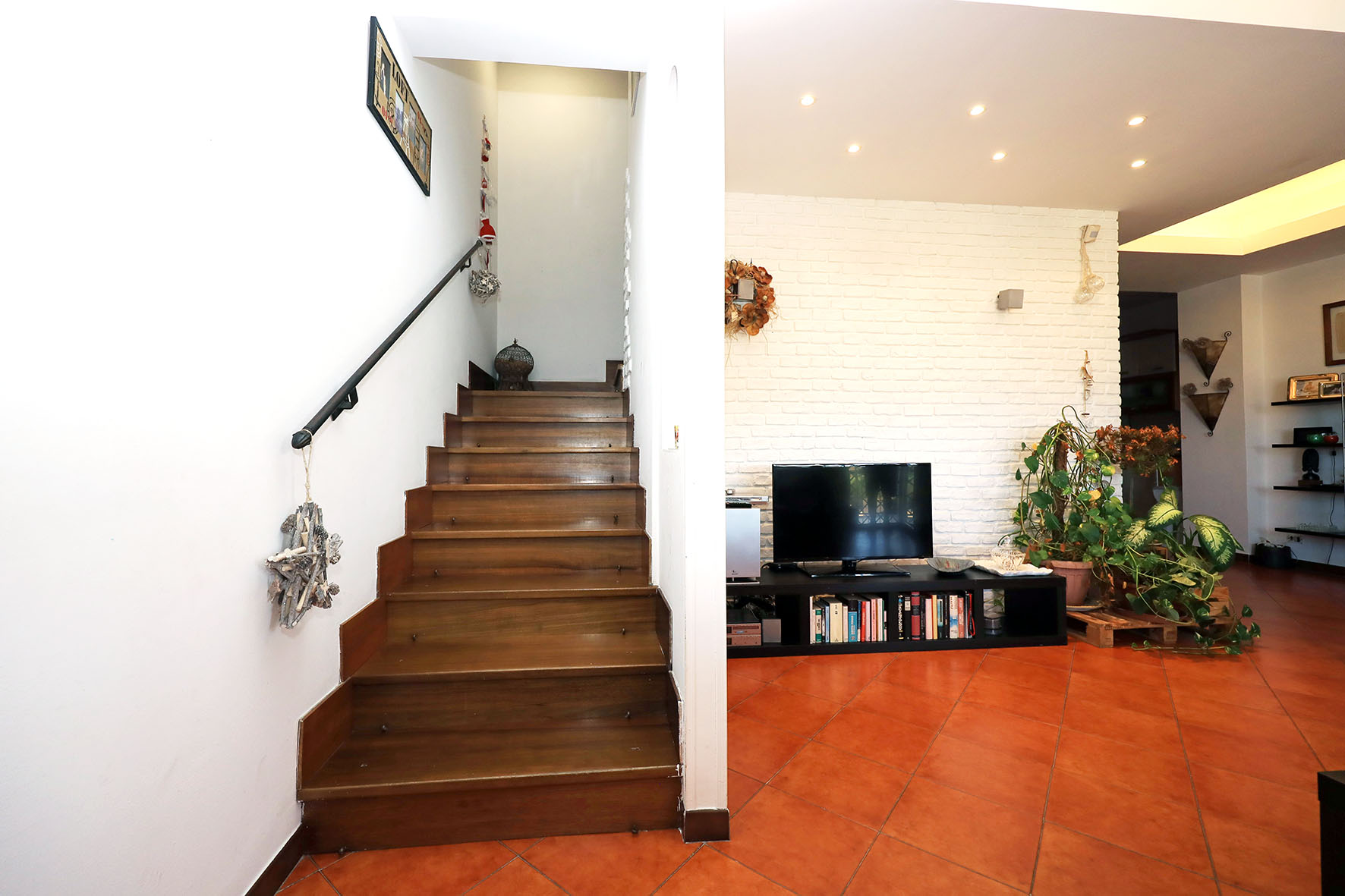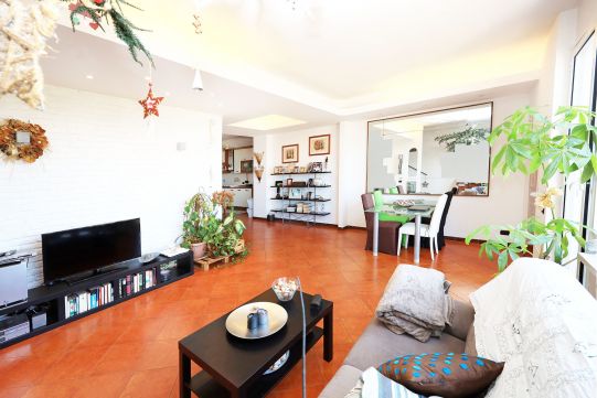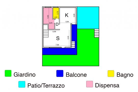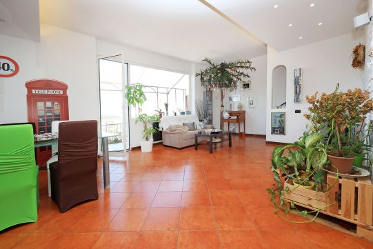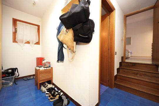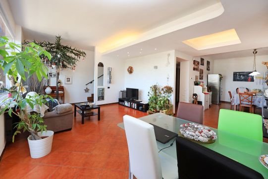 - Al piano S/1, completamente fuori terra, è presente una grande sala di circa 35 mq, ampia cucina, disimpegno, bagno con finestra e dispensa. All’esterno sono presenti un balcone ed un patio, quest’ultimo molto ampio. Sempre dal patio è possibile accedere ad un giardino. Questo piano è collegato a quello superiore tramite scala interna, rifinita in legno.