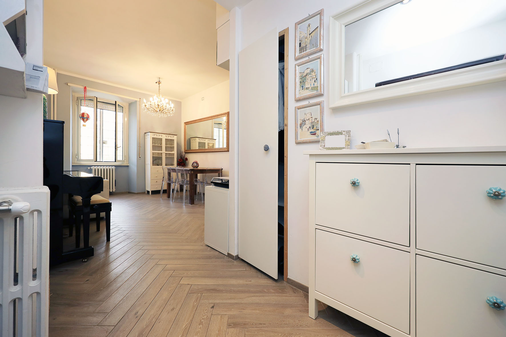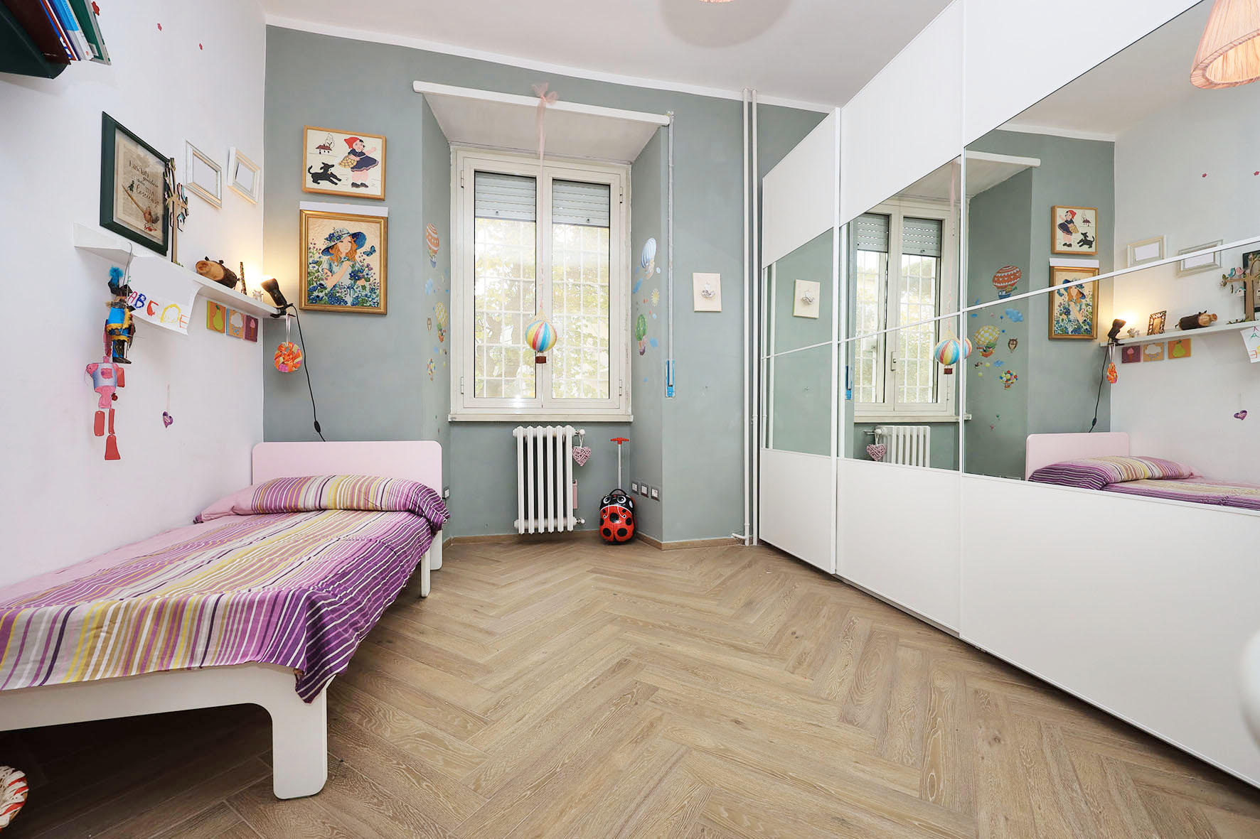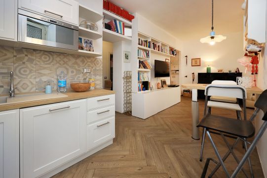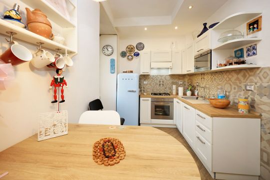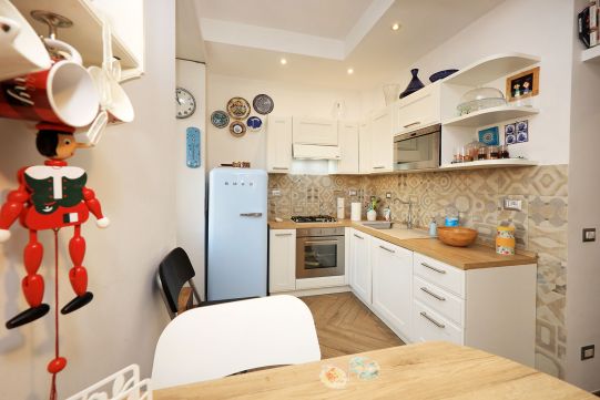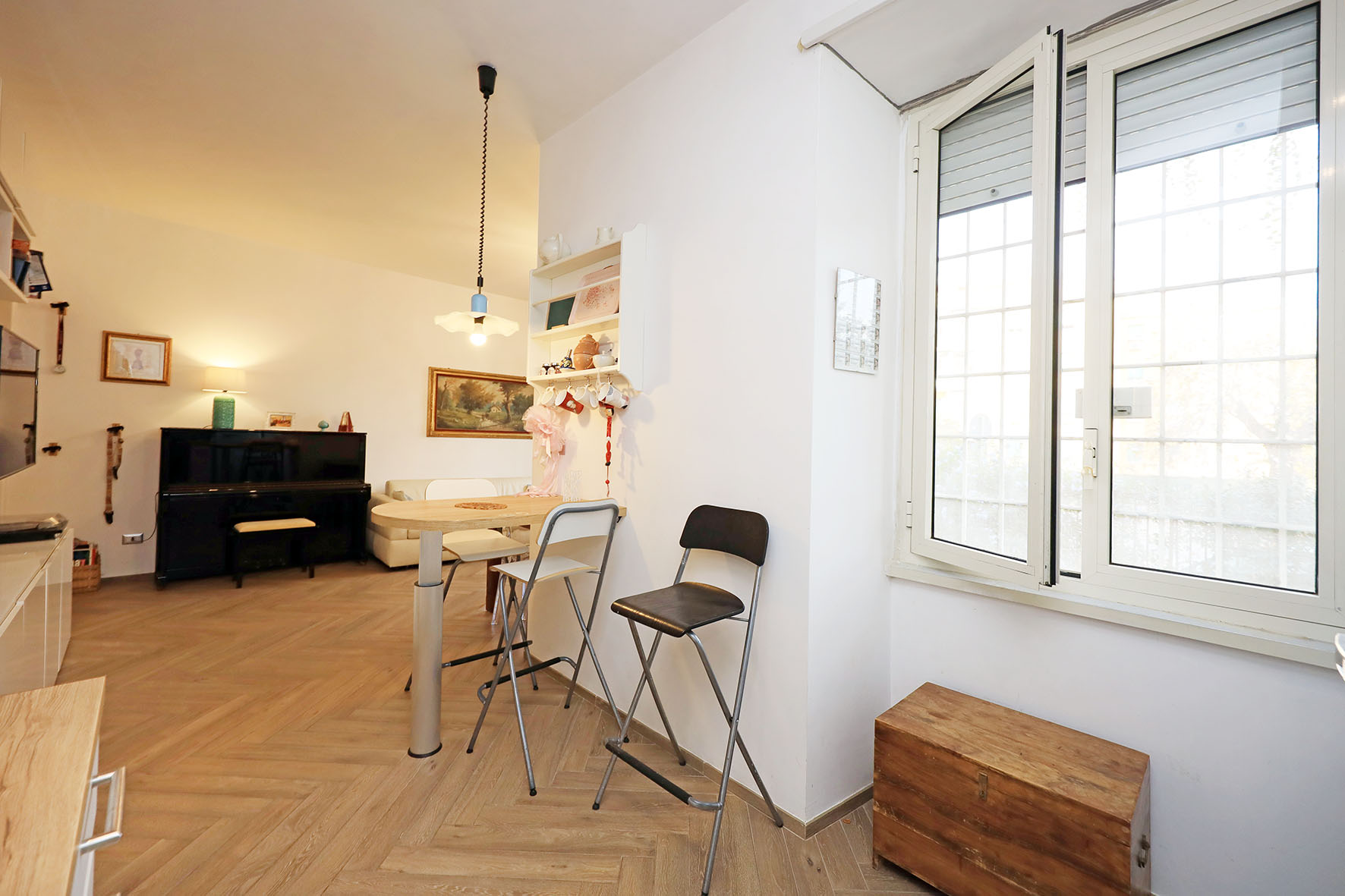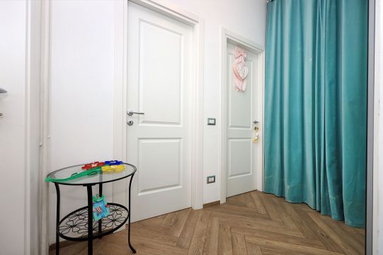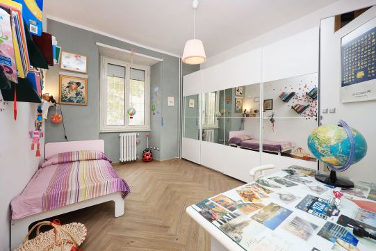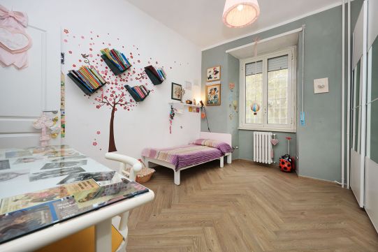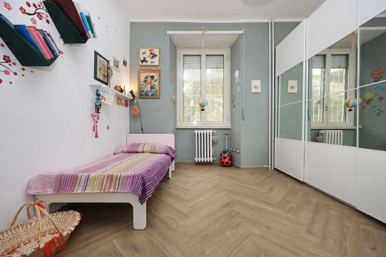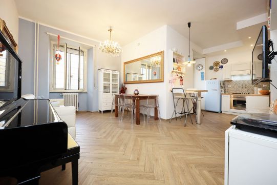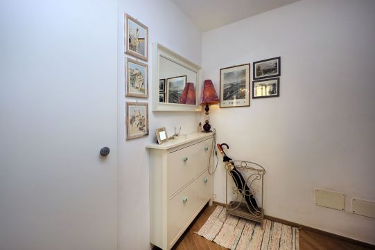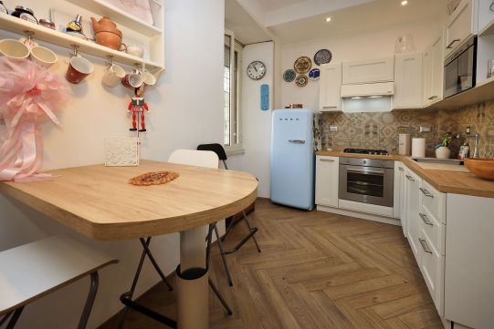 L’appartamento è in perfetto stato; gli impianti della cucina e del bagno sono stati completamente ristrutturati, come l’impianto elettrico. L’impianto di riscaldamento è centralizzato e le piastre radianti sono in ghisa. Portoncino d’ingresso blindato, impianto citofonico tradizionale. All’ingresso la proprietà ha realizzato un piccolo, ma pratico, armadio guardaroba. Le porte interne, tutte nuove ed a battente, sono laccate bianche e con doppia bugnatura. Infissi esterni in alluminio bianco, con cristallo singolo. Sono presenti le grate di protezione e le zanzariere a tutte le finestre.