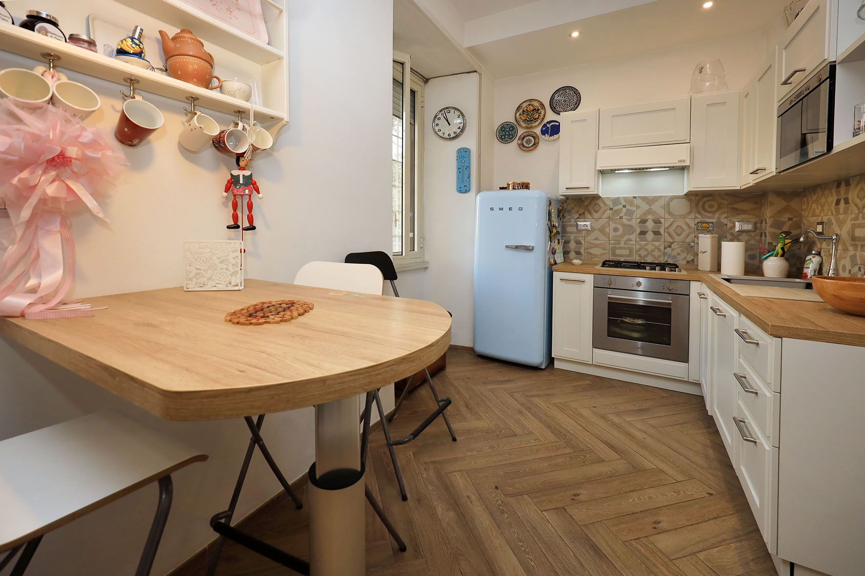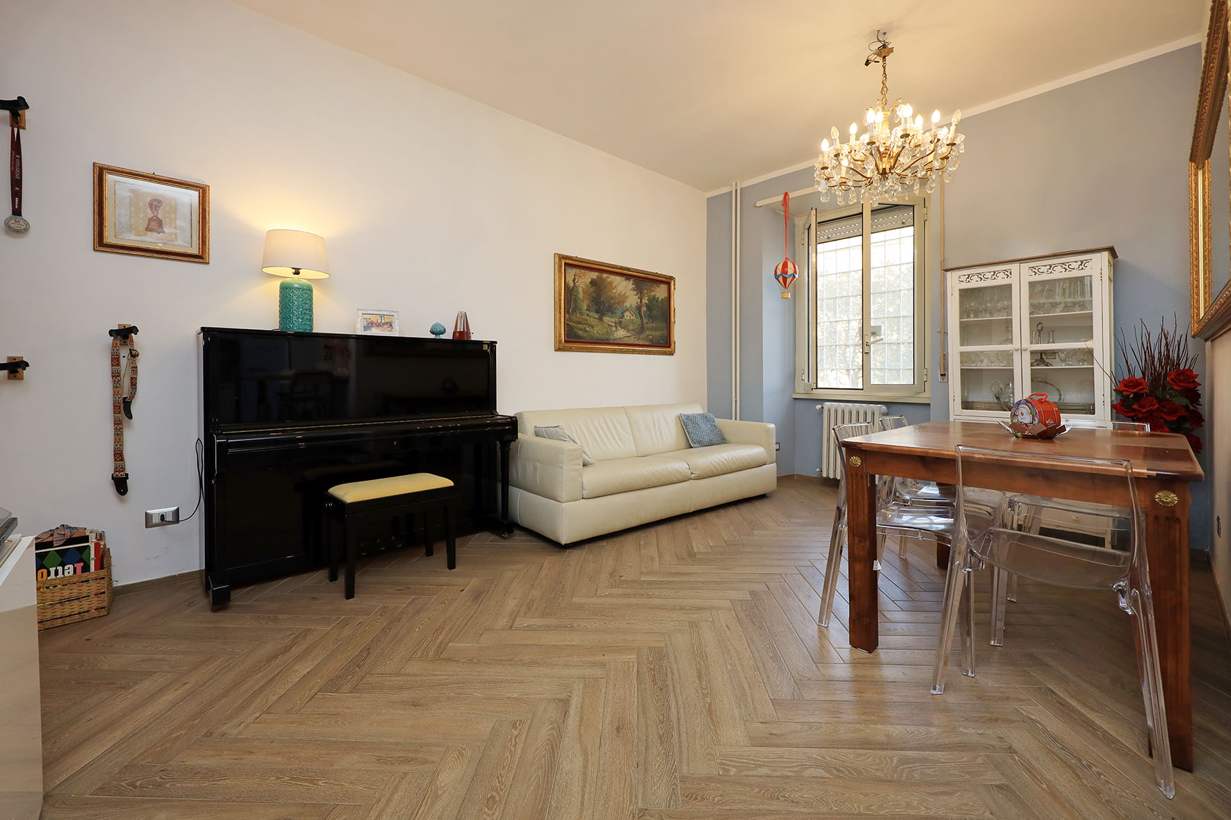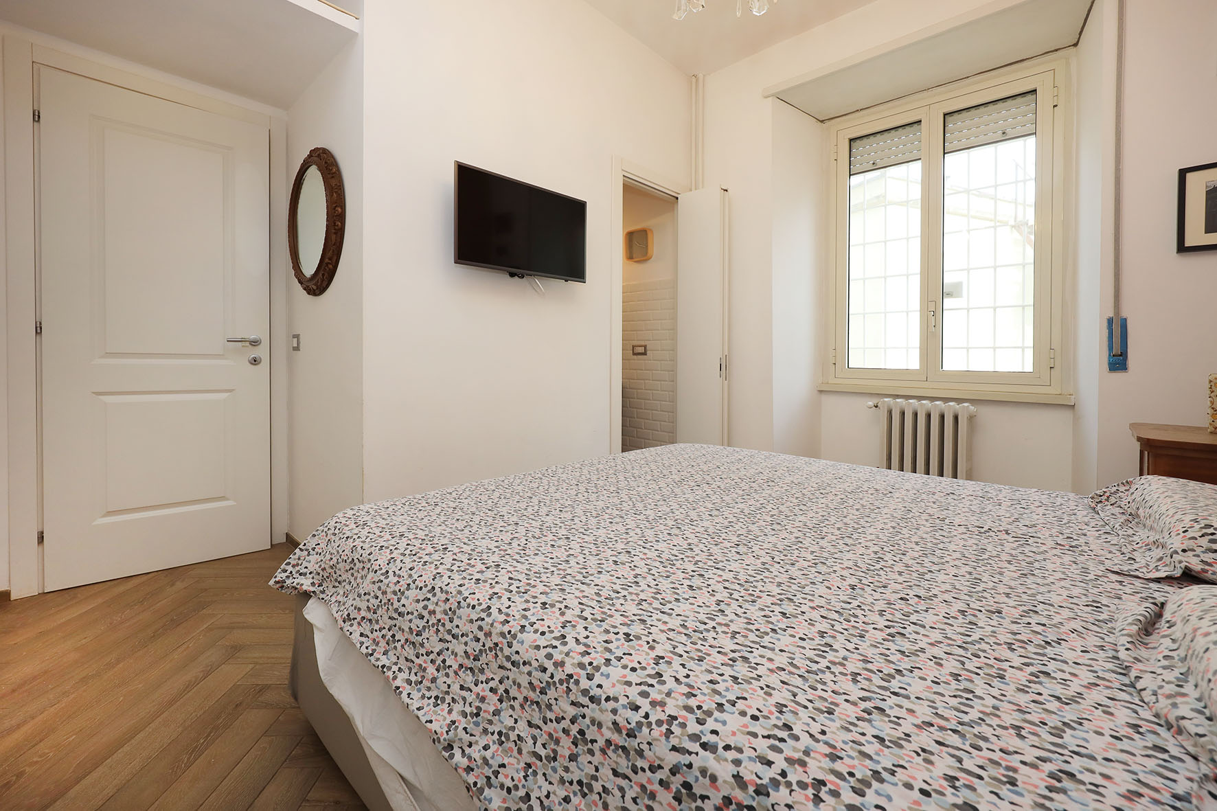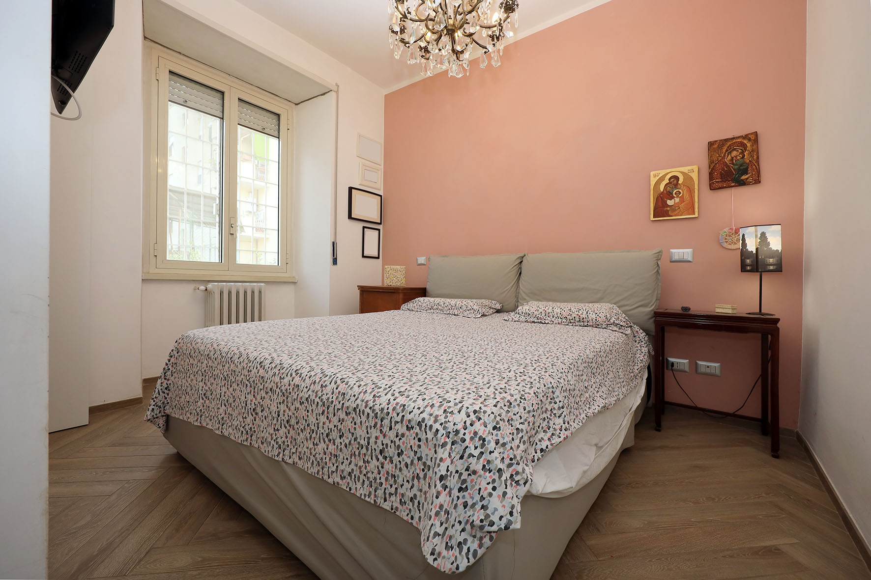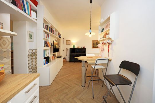 L’appartamento è in perfetto stato; gli impianti della cucina e del bagno sono stati completamente ristrutturati, come l’impianto elettrico. L’impianto di riscaldamento è centralizzato e le piastre radianti sono in ghisa. Portoncino d’ingresso blindato, impianto citofonico tradizionale. All’ingresso la proprietà ha realizzato un piccolo, ma pratico, armadio guardaroba. Le porte interne, tutte nuove ed a battente, sono laccate bianche e con doppia bugnatura. Infissi esterni in alluminio bianco, con cristallo singolo. Sono presenti le grate di protezione e le zanzariere a tutte le finestre.