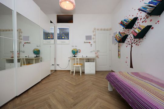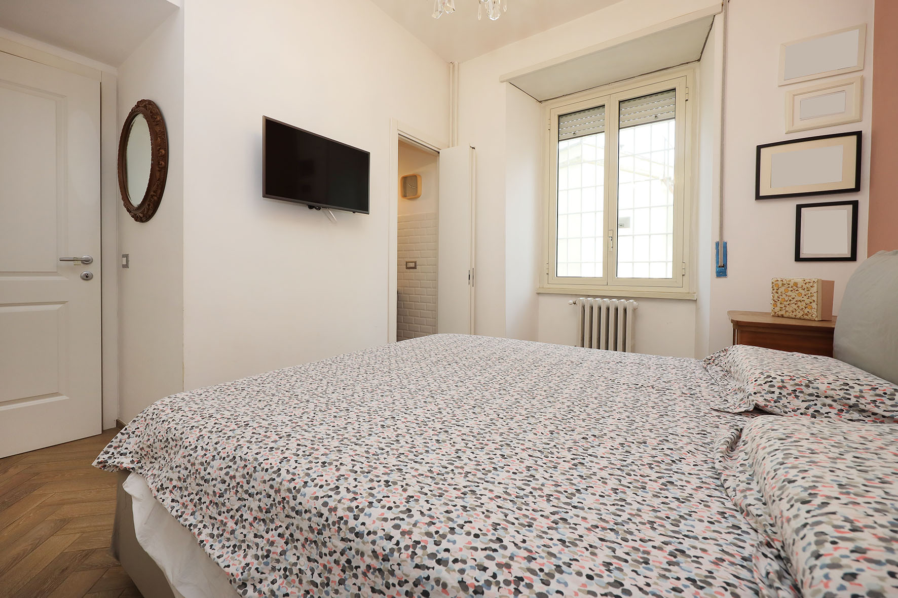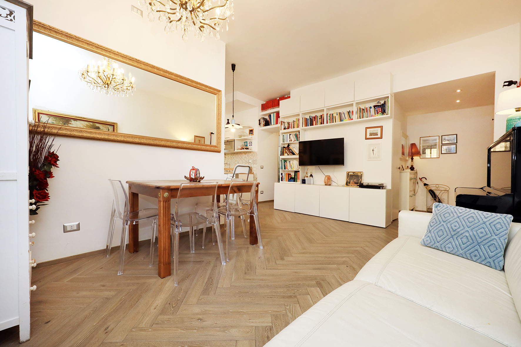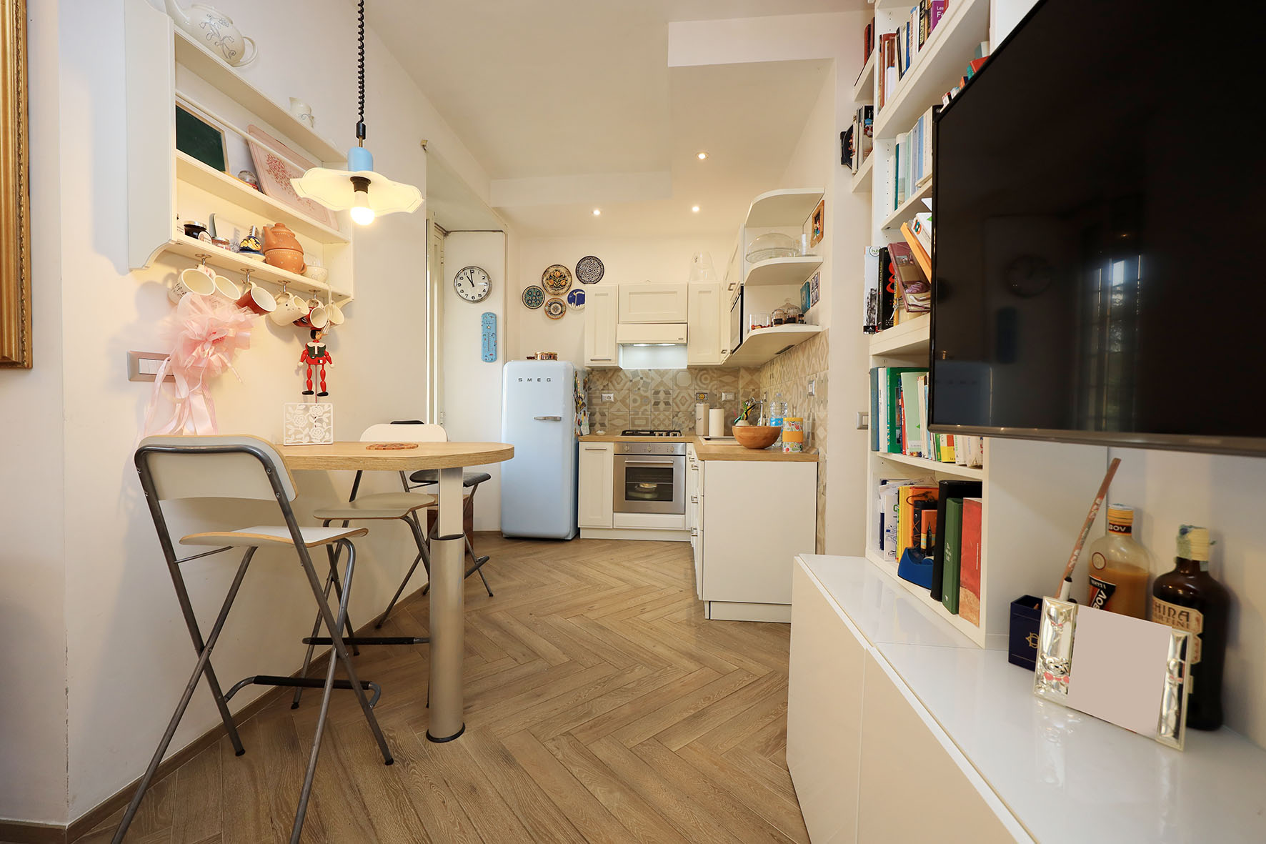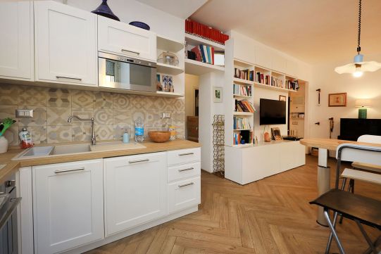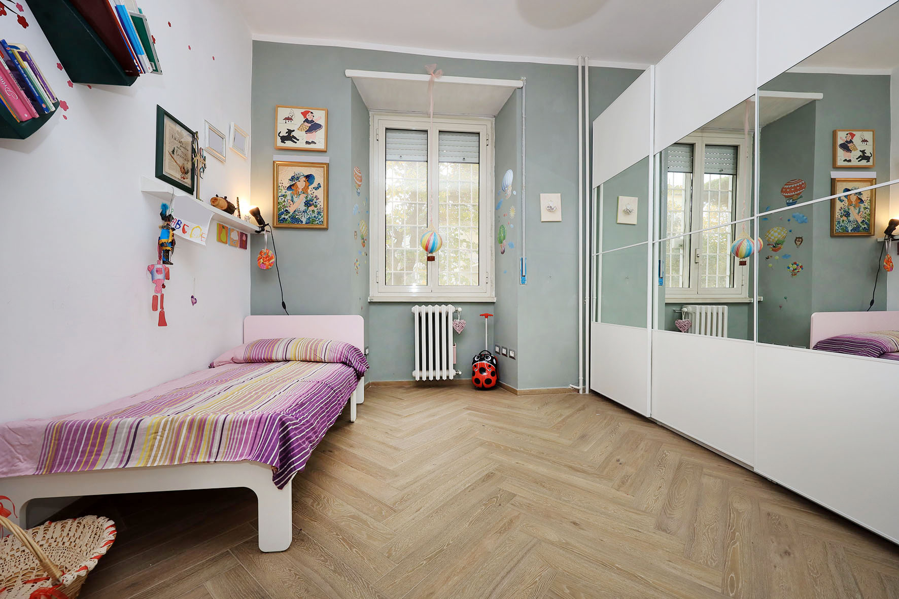 L’appartamento è in perfetto stato; gli impianti della cucina e del bagno sono stati completamente ristrutturati, come l’impianto elettrico. L’impianto di riscaldamento è centralizzato e le piastre radianti sono in ghisa. Portoncino d’ingresso blindato, impianto citofonico tradizionale. All’ingresso la proprietà ha realizzato un piccolo, ma pratico, armadio guardaroba. Le porte interne, tutte nuove ed a battente, sono laccate bianche e con doppia bugnatura. Infissi esterni in alluminio bianco, con cristallo singolo. Sono presenti le grate di protezione e le zanzariere a tutte le finestre.