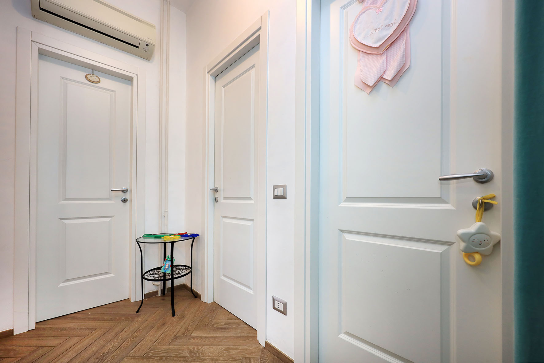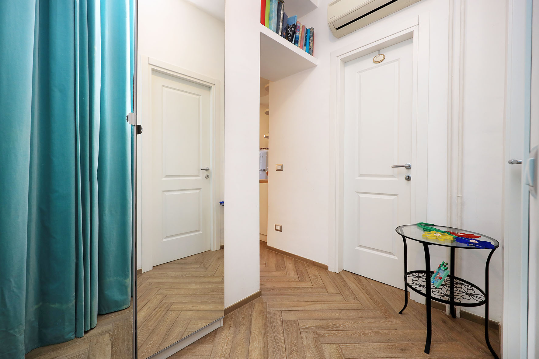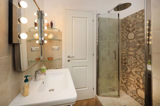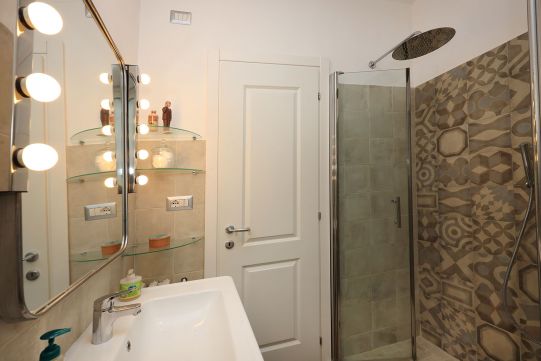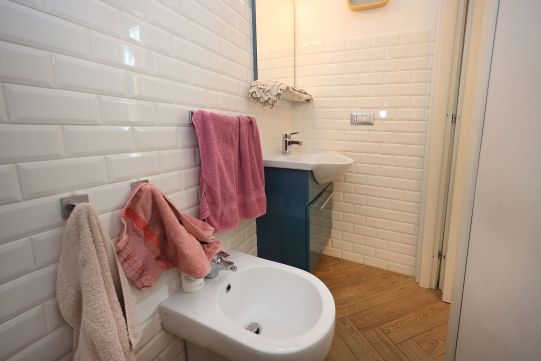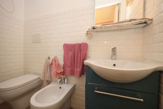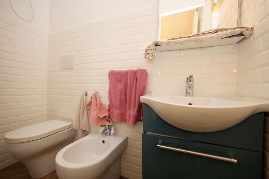 Nel disimpegno della zona notte è presente un climatizzatore Daikin (caldo – freddo), molto efficace per tutti gli ambienti di casa. Pavimentazione in gres porcellanato in tutti gli ambienti inclusi i bagni (tipo parquet); zoccolino dello stesso materiale. In alcune parti di casa sono stati realizzati un controsoffitto con faretti e libreria in cartongesso. Dei due bagni, uno provvisto di finestra, è completo di tutti i sanitari ed ha un’ampia doccia; l’altro senza finestra e comunicante con la camera da letto, ha l’aeratore. Rubinetteria miscelatori monocomando.