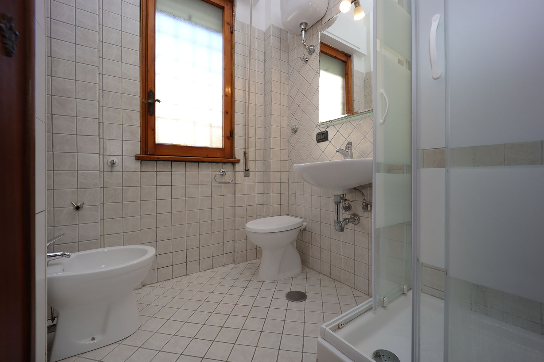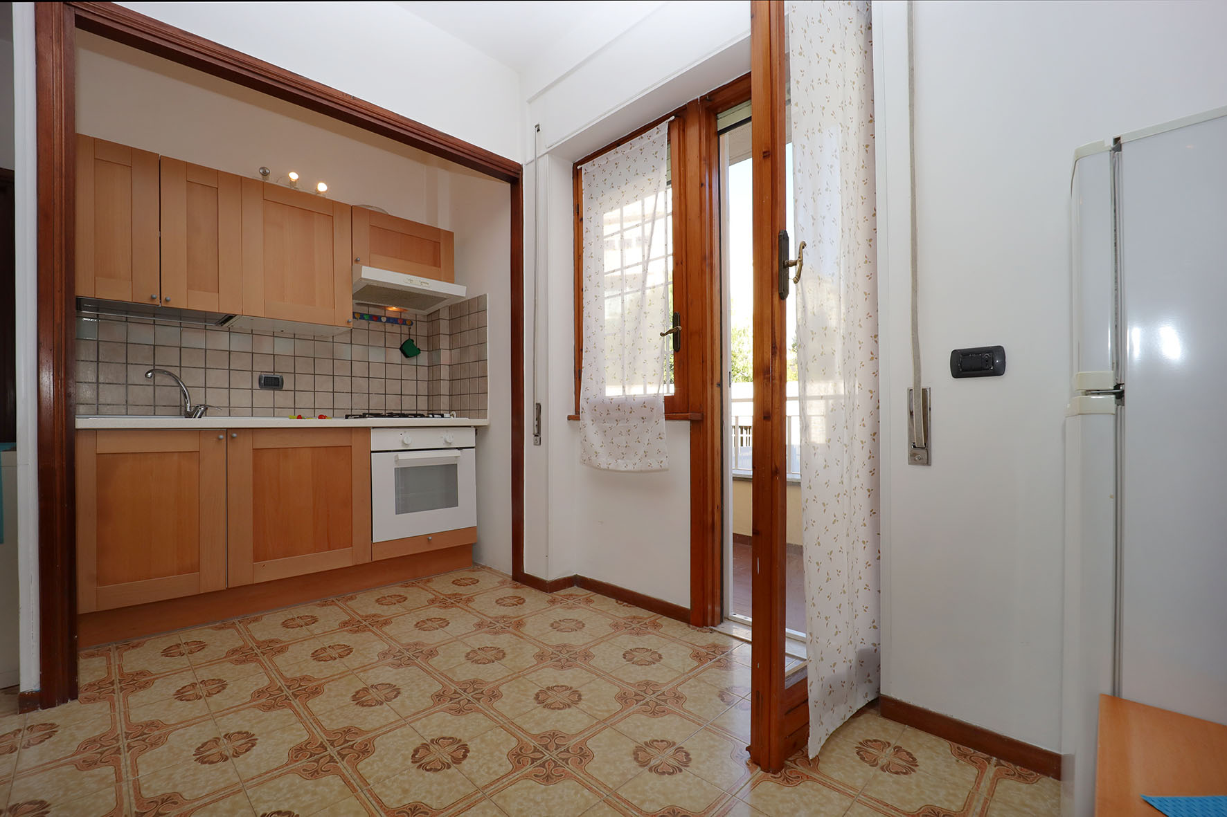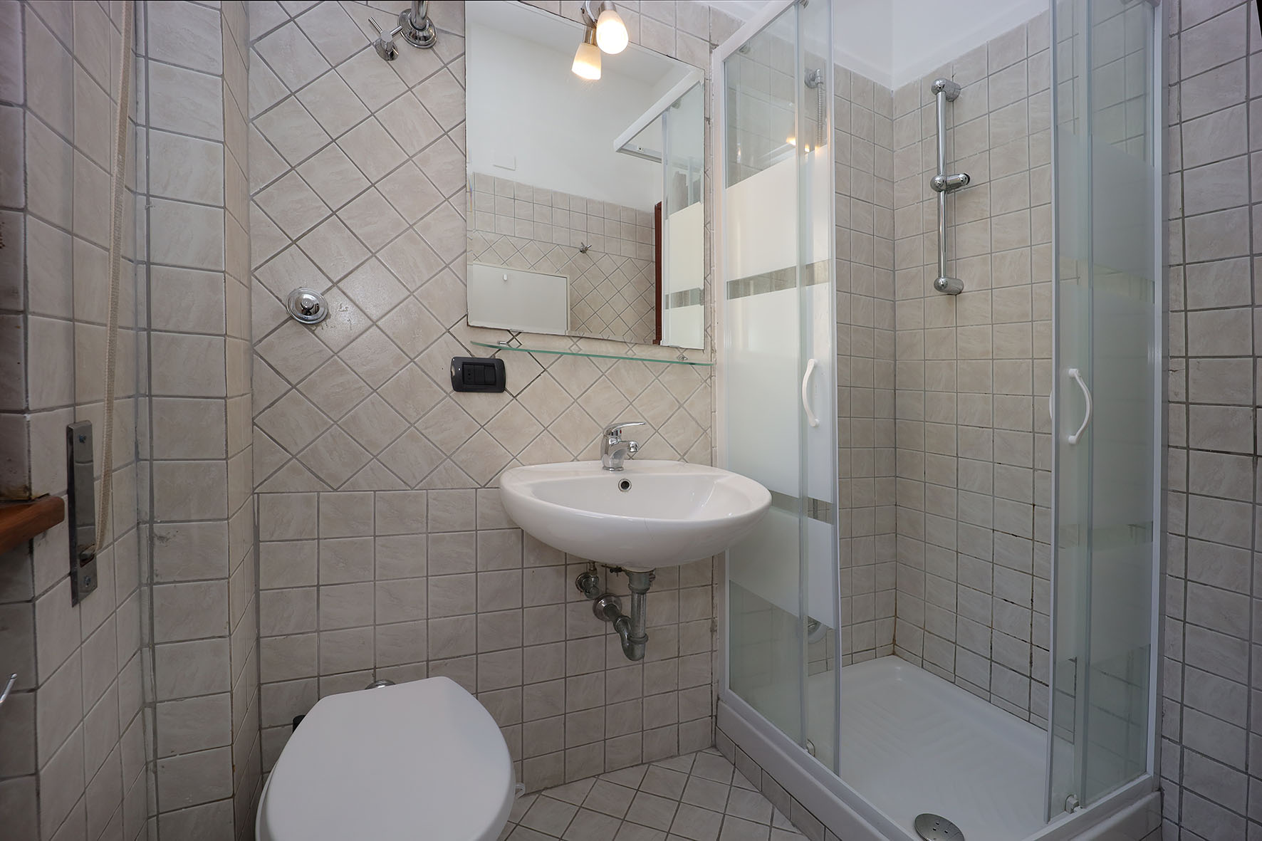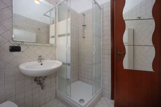Portoncino d’ingresso con serratura rinforzata. Pavimentazione in ceramica, anni settanta, zoccolino in legno tranne nei bagni e nella cucina, dove i rivestimenti arrivano a circa 200 cm di altezza. Internamente le pareti sono tutte rifinite in tinta. Infissi esterni in legno, finestre con cristallo singolo ed avvolgibili in PVC. Le finestre e le porte finestre sono dotate di grate di protezione, per lo più apribili. Le porte interne, sono tutte a battente di colore noce. Il bagno, completo di tutti i sanitari è provvisto di finestra e di un piatto doccia con relativa cabina in cristallo. Rubinetteria miscelatori monocomando. La lavatrice è collocata sul balcone, adiacente la camera da letto, all’interno di un vano chiuso da due sportelli in legno.