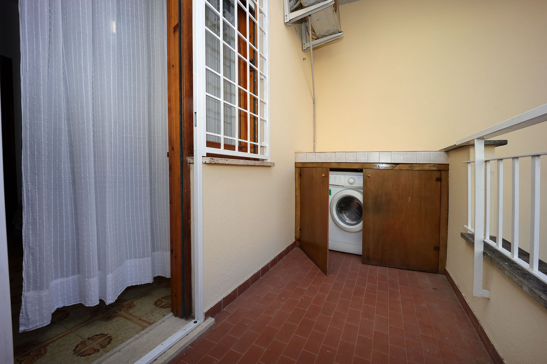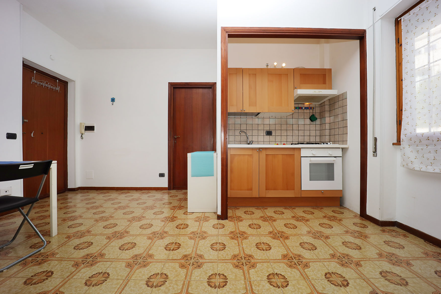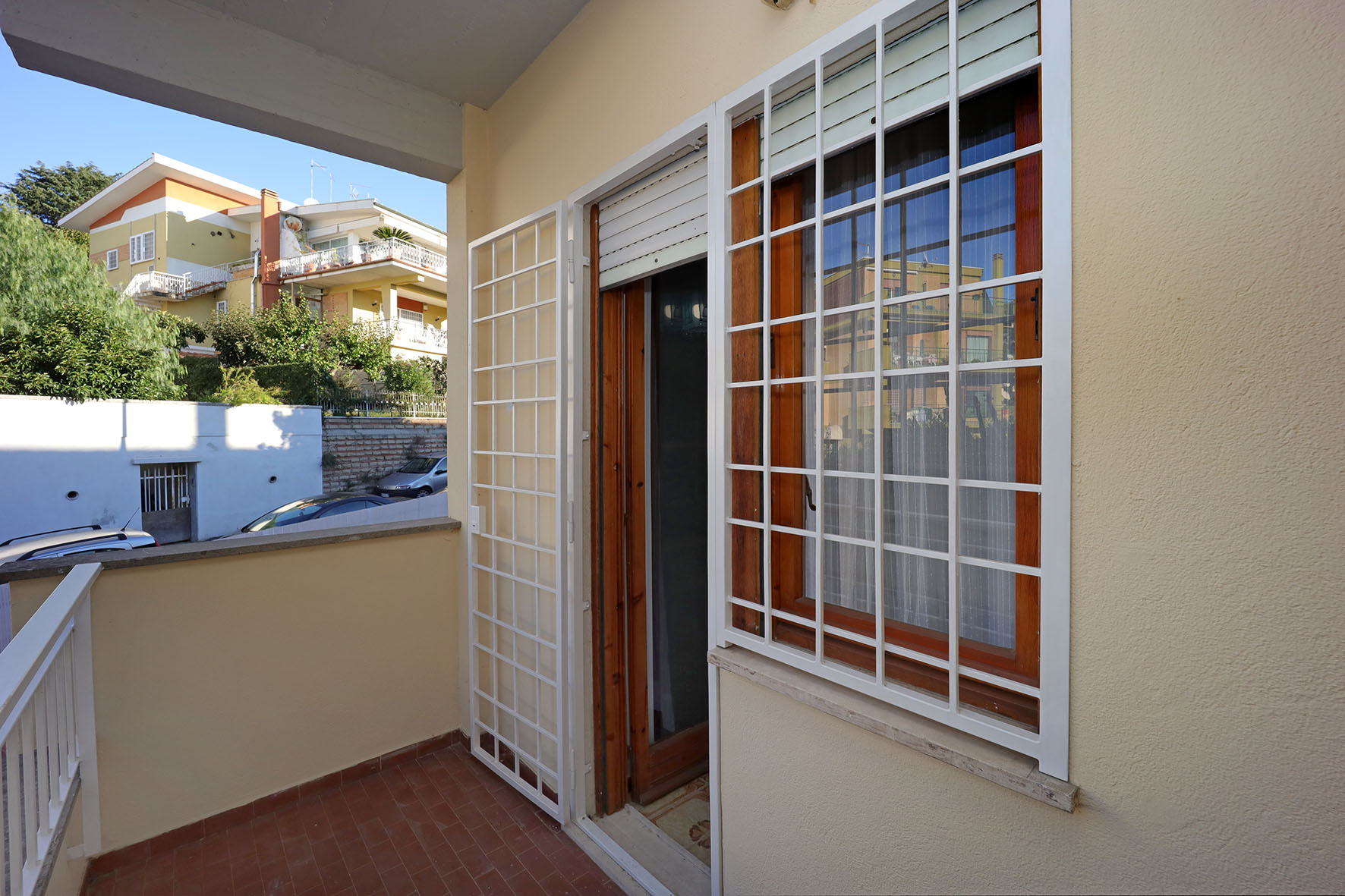 Portoncino d’ingresso con serratura rinforzata. Pavimentazione in ceramica, anni settanta, zoccolino in legno tranne nei bagni e nella cucina, dove i rivestimenti arrivano a circa 200 cm di altezza. Internamente le pareti sono tutte rifinite in tinta. Infissi esterni in legno, finestre con cristallo singolo ed avvolgibili in PVC. Le finestre e le porte finestre sono dotate di grate di protezione, per lo più apribili. Le porte interne, sono tutte a battente di colore noce. Il bagno, completo di tutti i sanitari è provvisto di finestra e di un piatto doccia con relativa cabina in cristallo. Rubinetteria miscelatori monocomando. La lavatrice è collocata sul balcone, adiacente la camera da letto, all’interno di un vano chiuso da due sportelli in legno.